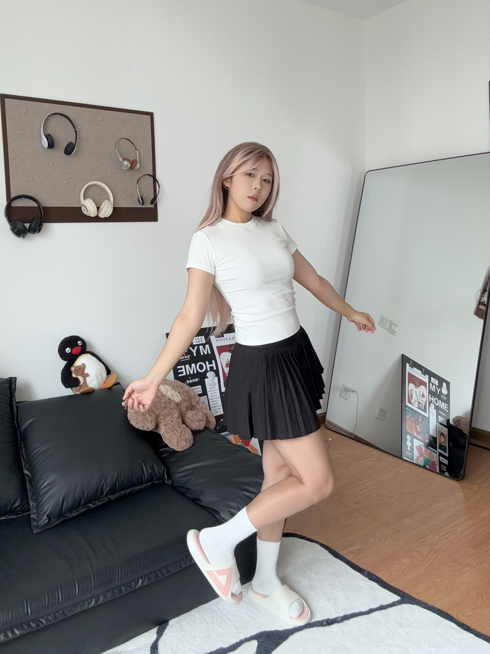 纯白T恤搭配百褶裙,再来一双运动拖鞋,元气满满!