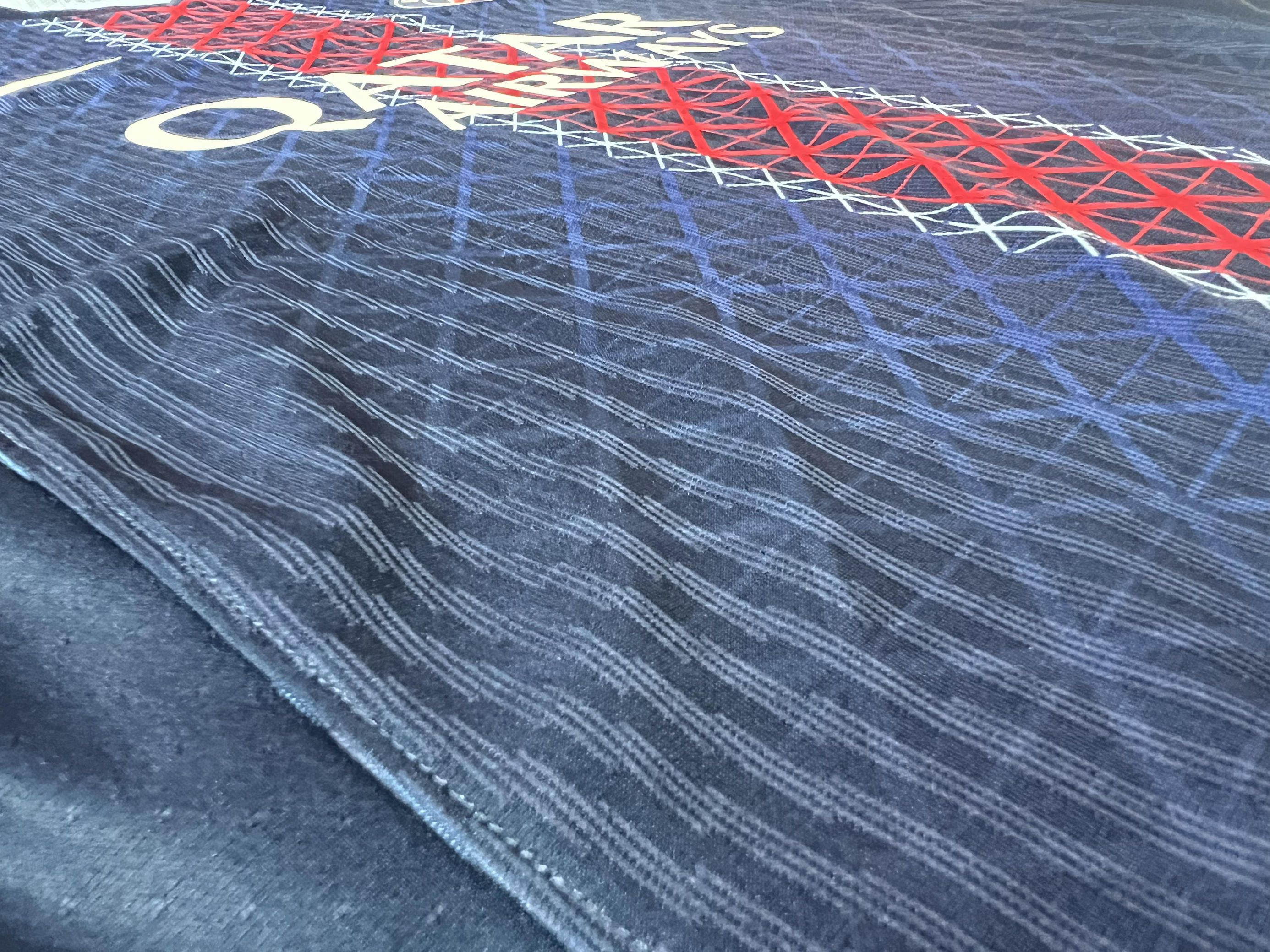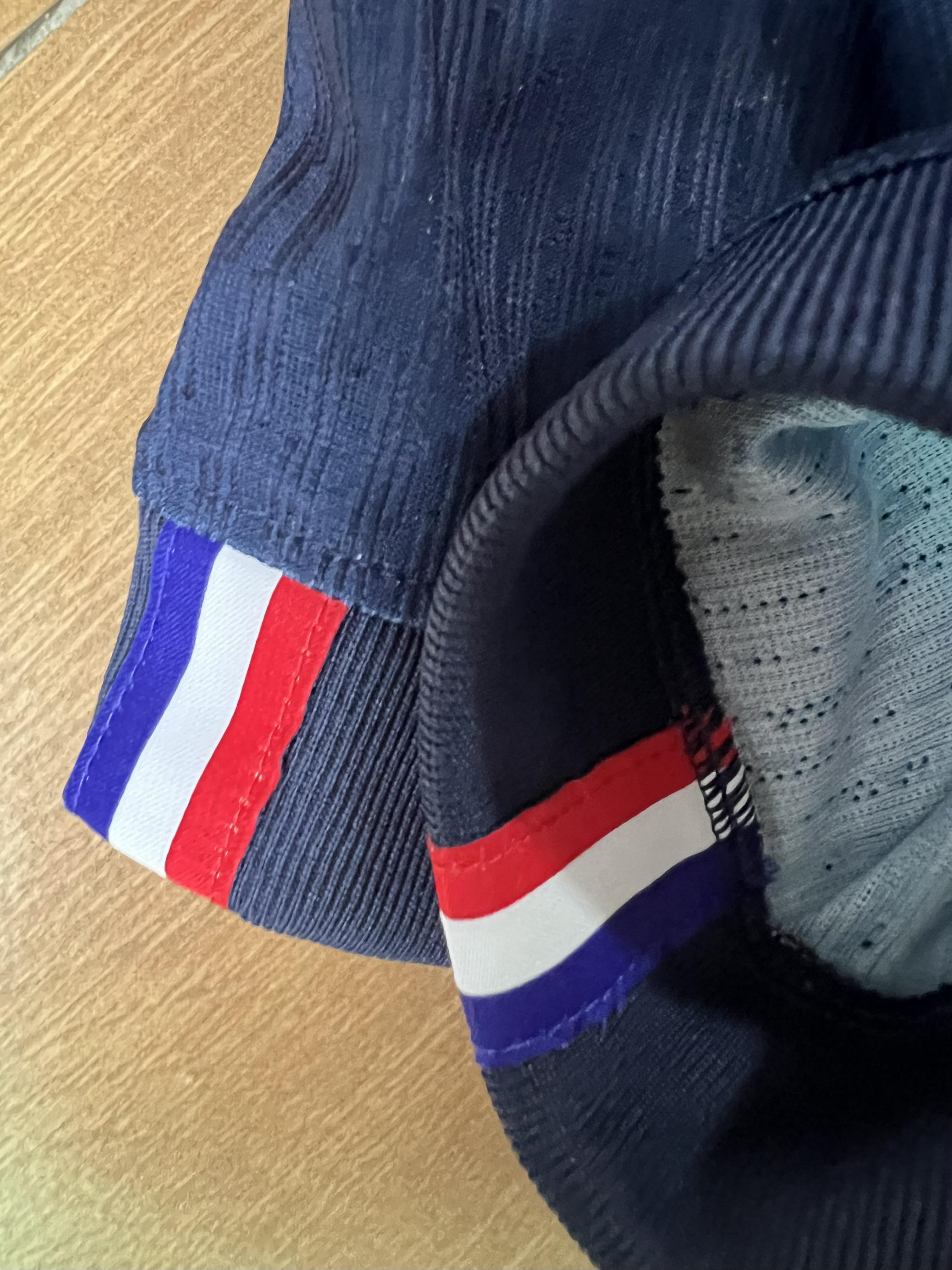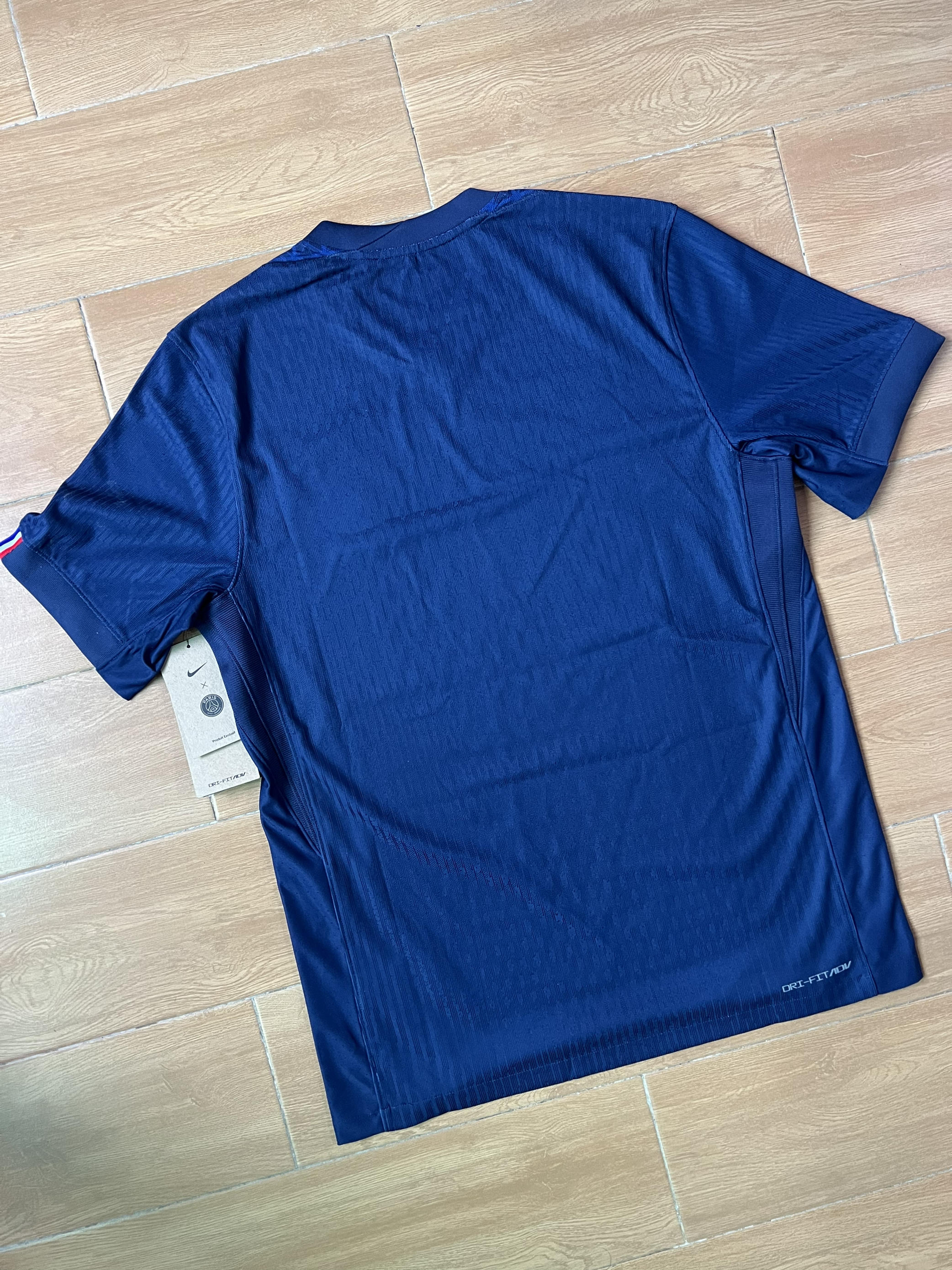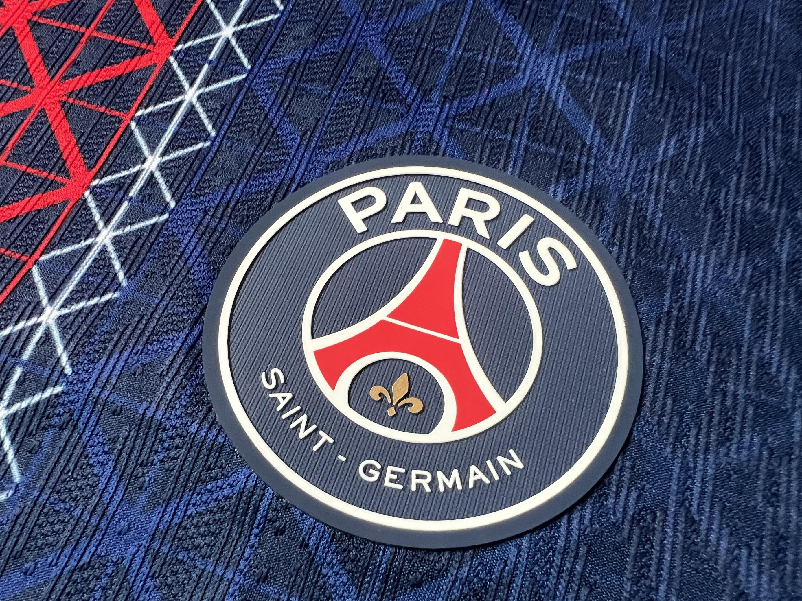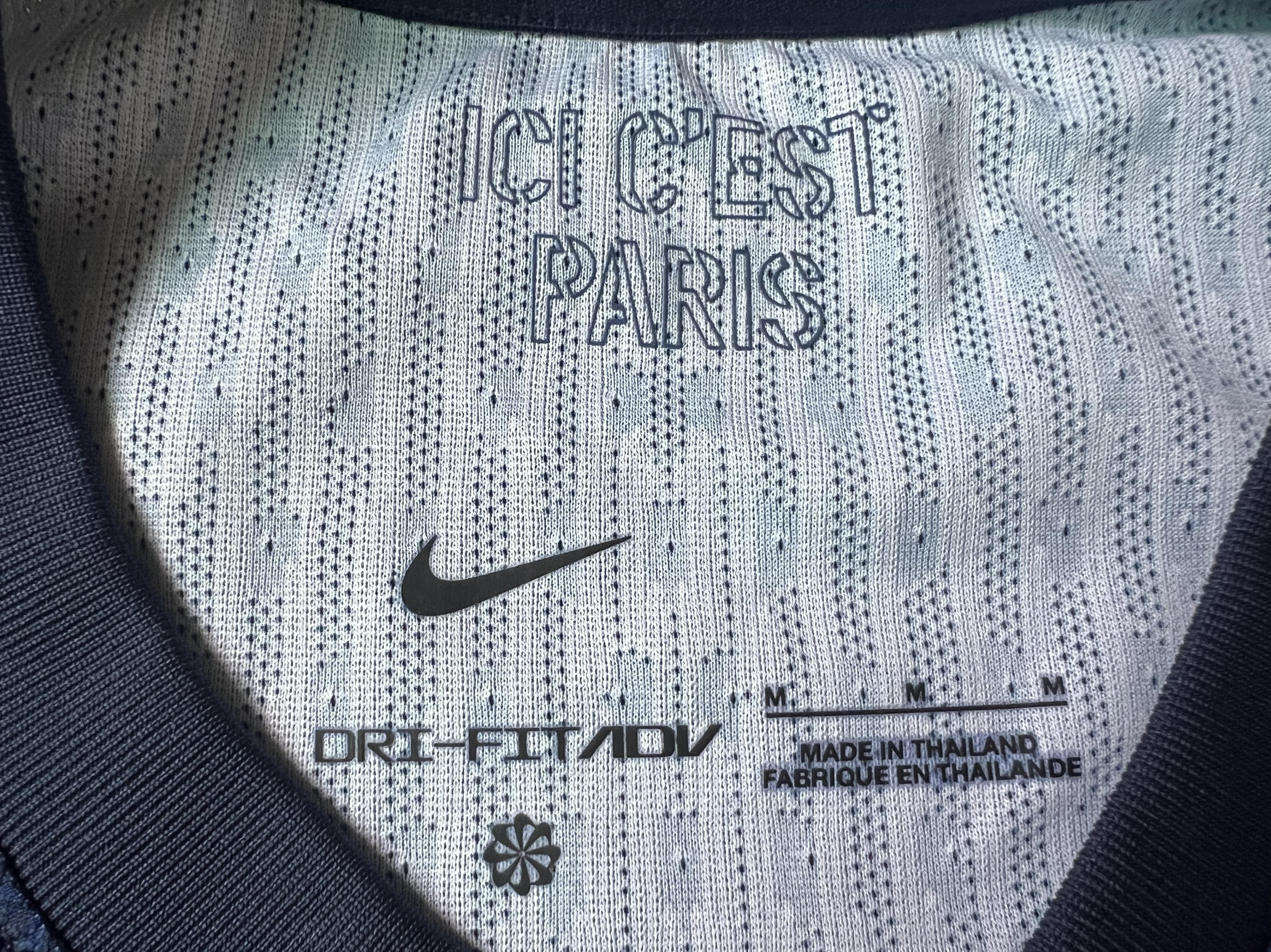#开箱耐克 #大巴黎主场系列 入手25-26巴黎圣日耳曼主场球员版球衣 设计:主色调是经典主场深海军蓝。另外的红和白作为点缀分别在其他细节位置。球衣正面暗纹是看似埃菲尔铁塔桁架构造,线条粗细有序,层次丰富,中间从领口直垂至下摆配色设计成了白夹红,远看颇有阿拉伯的风情(看到球衣后的第一印象),也是这款球衣里我最喜欢的设计。队徽是热转胶印的,手感一流,红白比例堪称完美。背面暗纹也值得细品,具体看图...