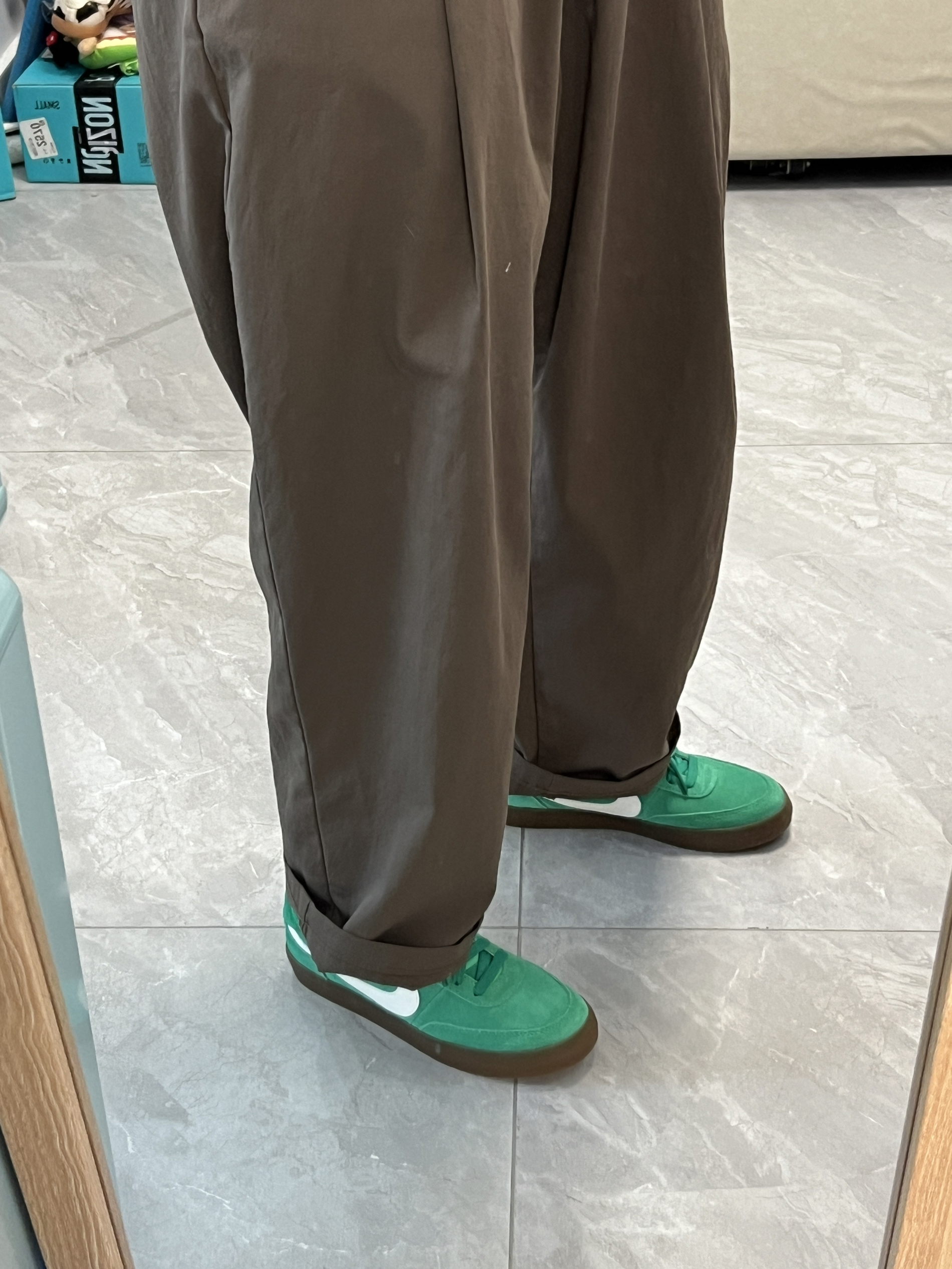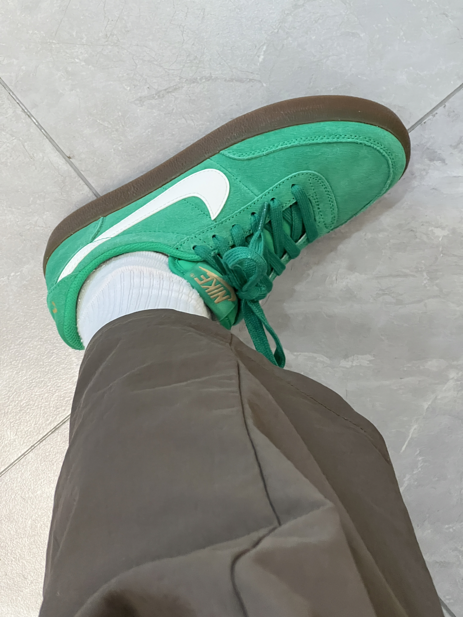 这双鞋子的配色是真的好看! 绿色很巴适! 鞋子的质感也很好! 主要是鞋子的搭配性也很高! 还有就是鞋子的脚感很舒服! 我觉得校裤也很好搭配呀 我平常穿的是37这双也是37 刚好!不偏码! 鞋子反正长时间压马路都是是没啥问题的