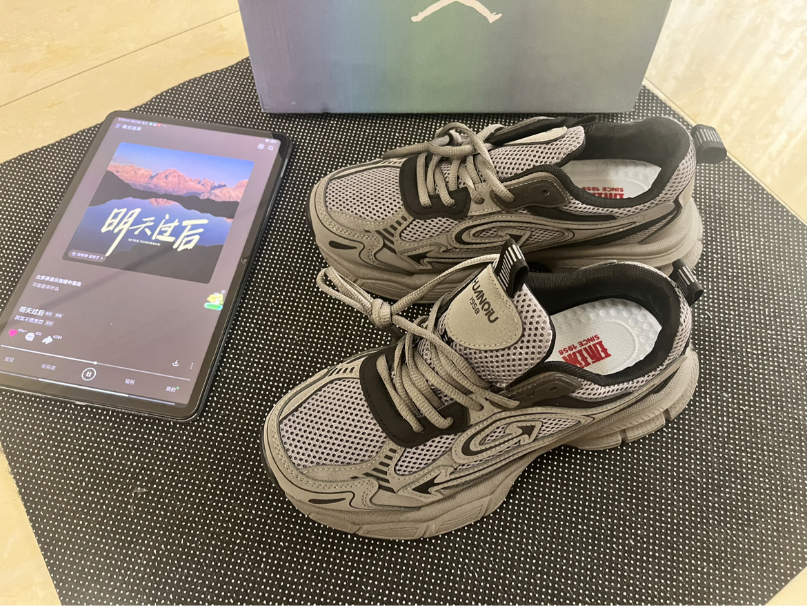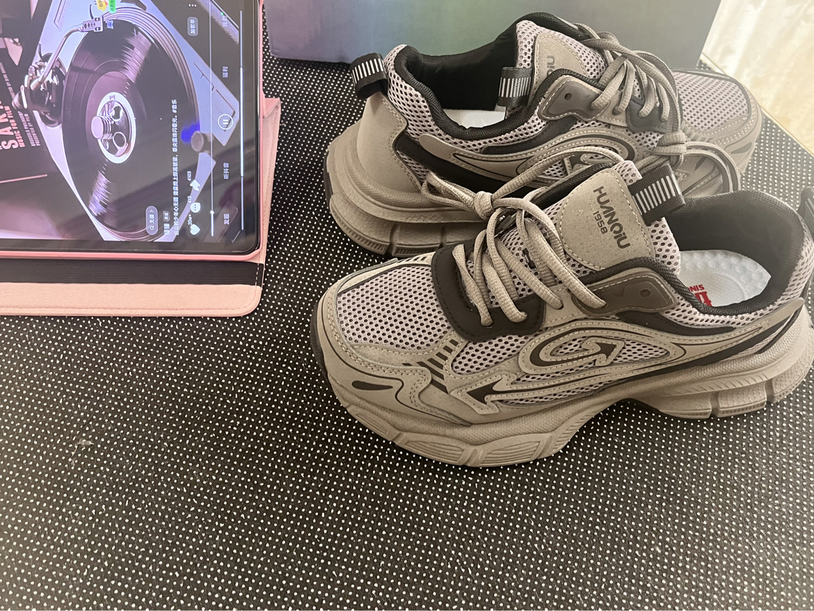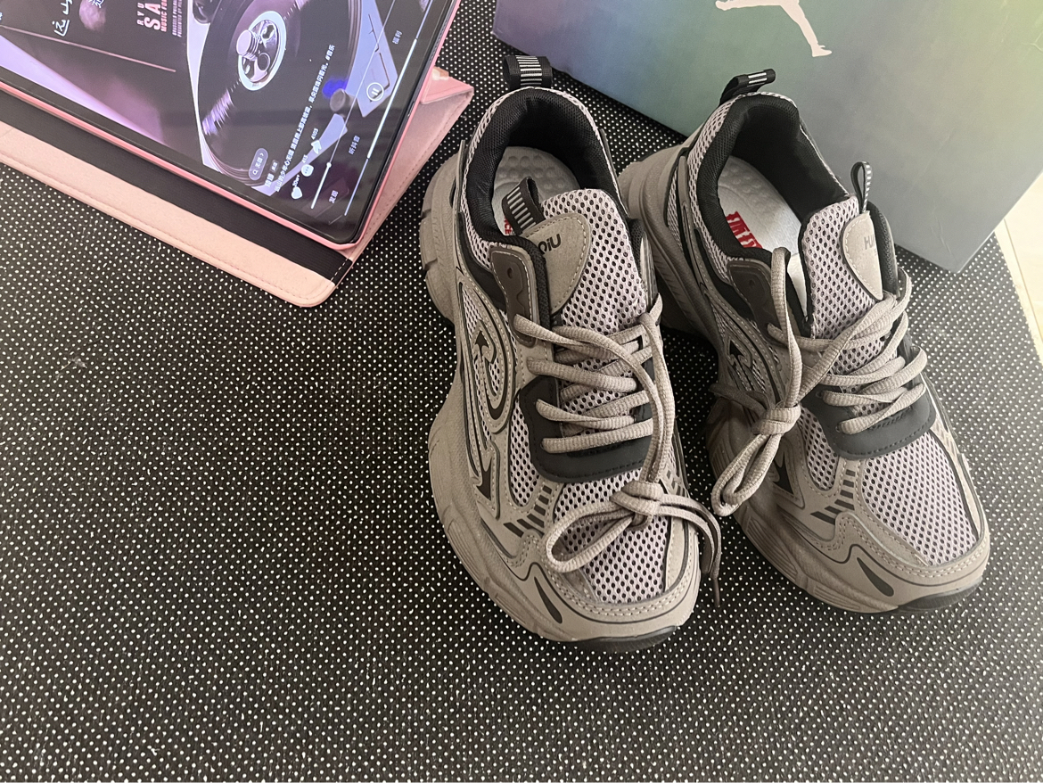 这双鞋也太C了吧~外观设计超绝,网面拼接很有层次感,搭配运动裤出街回头率超高,这双鞋真是我的心头好 灰黑配色高级又百搭,厚底显高还时髦,穿上秒变街头酷盖~脚感也很惊喜,网面透气不闷脚,走路跑步都很舒服,暴走一天也不累。 性价比真的高,学生党、打工人闭眼入,妥妥穿搭加分项,已经安利给身边朋友啦!