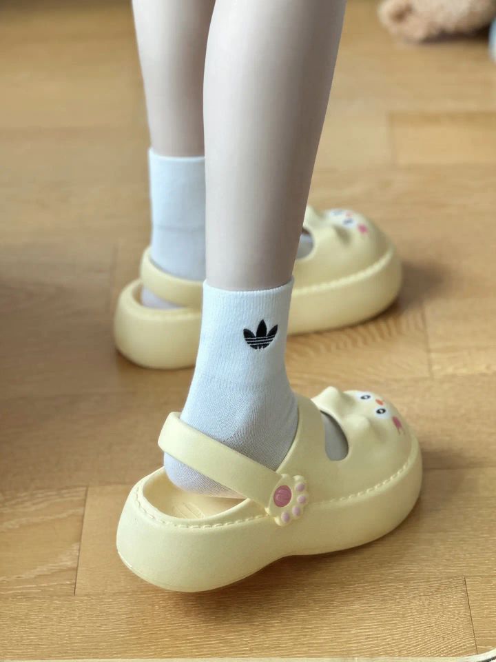 谁懂!穿这双奶黄厚底凉鞋+阿迪三叶草袜,直接把「可爱松弛感」焊在脚上🍰 🍦 单品王炸: ✔️ 阿迪三叶草袜:经典logo+透气面料,运动袜的舒适感拉满,配凉鞋秒变「潮甜混搭」,不露脚踝也很夏天; ✔️ 卡通厚底凉鞋:奶黄配色像融化的冰淇淋,厚底踩云感+搭扣设计,可爱又防滑,暴走也不累~ 🍧 搭配魔法: 白袜+奶黄鞋,配色清新到犯规!袜子的运动感中和凉鞋的甜,宅家、逛超市、散步… 随...
