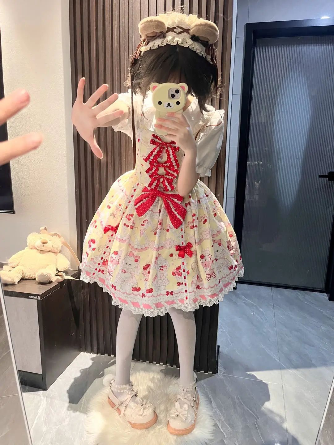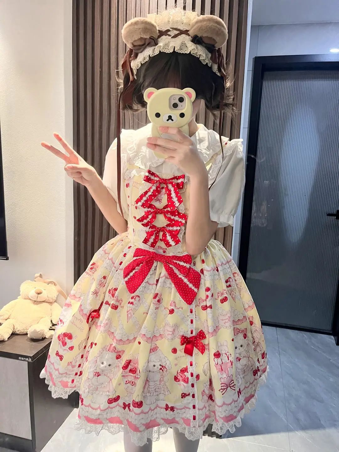 谁懂啊!这套甜系Lo穿搭直接把「少女感」焊在身上✨ 熊耳发箍+波点袜+蓬蓬裙,走两步都能带起甜甜空气,连手机壳都要凑齐小熊CP! 🌟 穿搭拆解:把可爱焊死在细节里 ▫️ 裙装:奶油底色+粉黄碎花,蕾丝花边疯狂上分!蓬度刚好的裙摆,走路带风还藏肉~ ▫️ 配饰:熊耳发箍封神!毛绒+蕾丝混搭,软fufu又精致;小熊手机壳锁死,细节控狂喜! ▫️ 鞋袜:波点白袜+蝴蝶结厚底鞋,甜度×100!厚底...