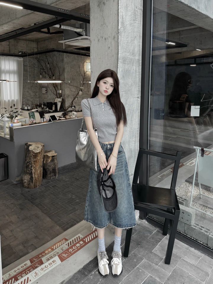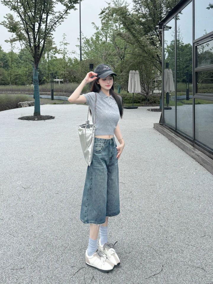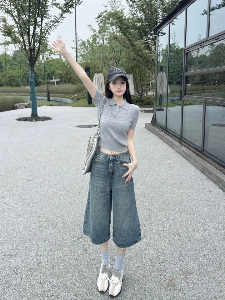 #复古港风穿搭 #娃娃领针织衫 #阔腿牛仔七分裤 #2025时尚回潮 #微胖
