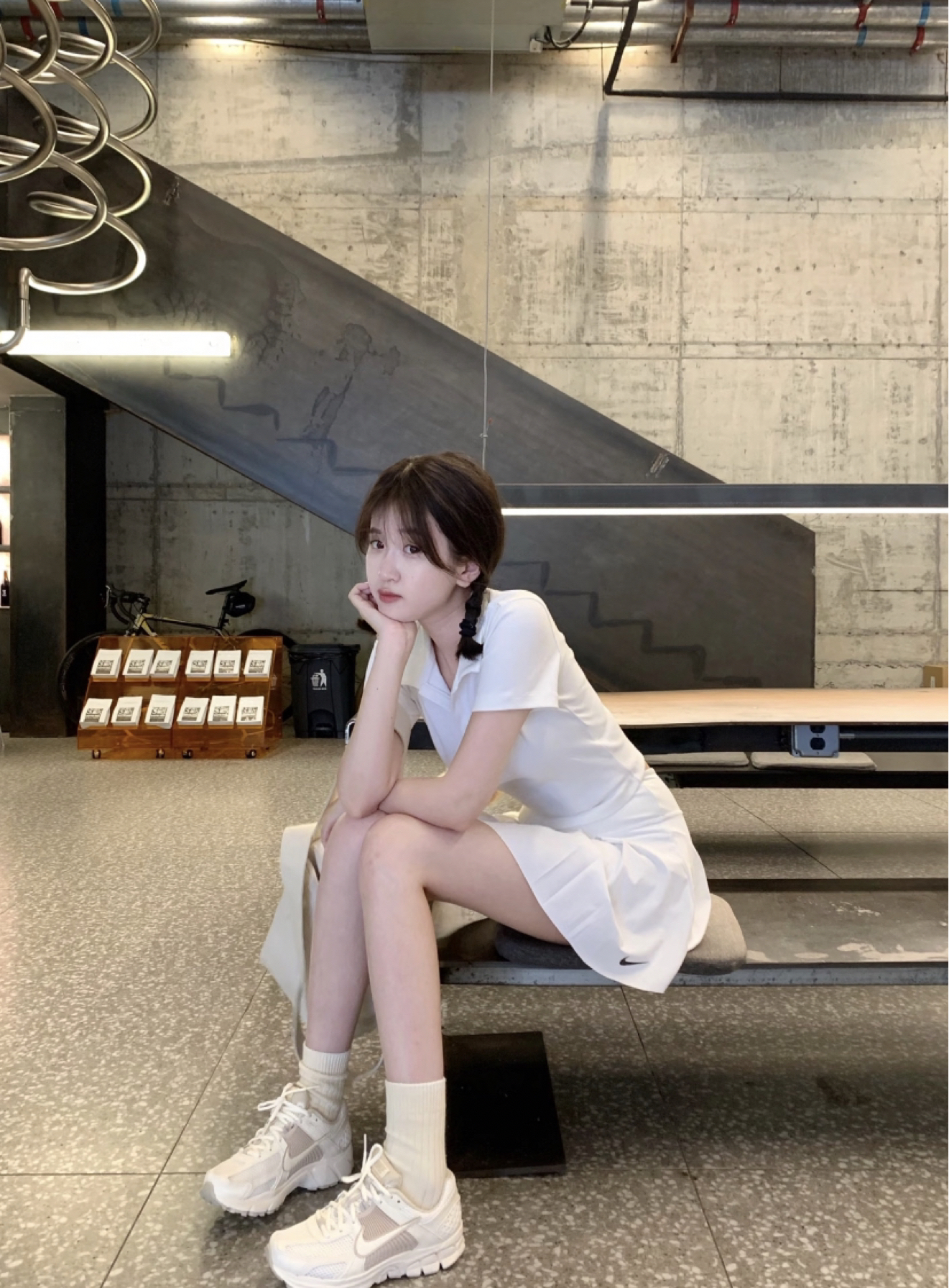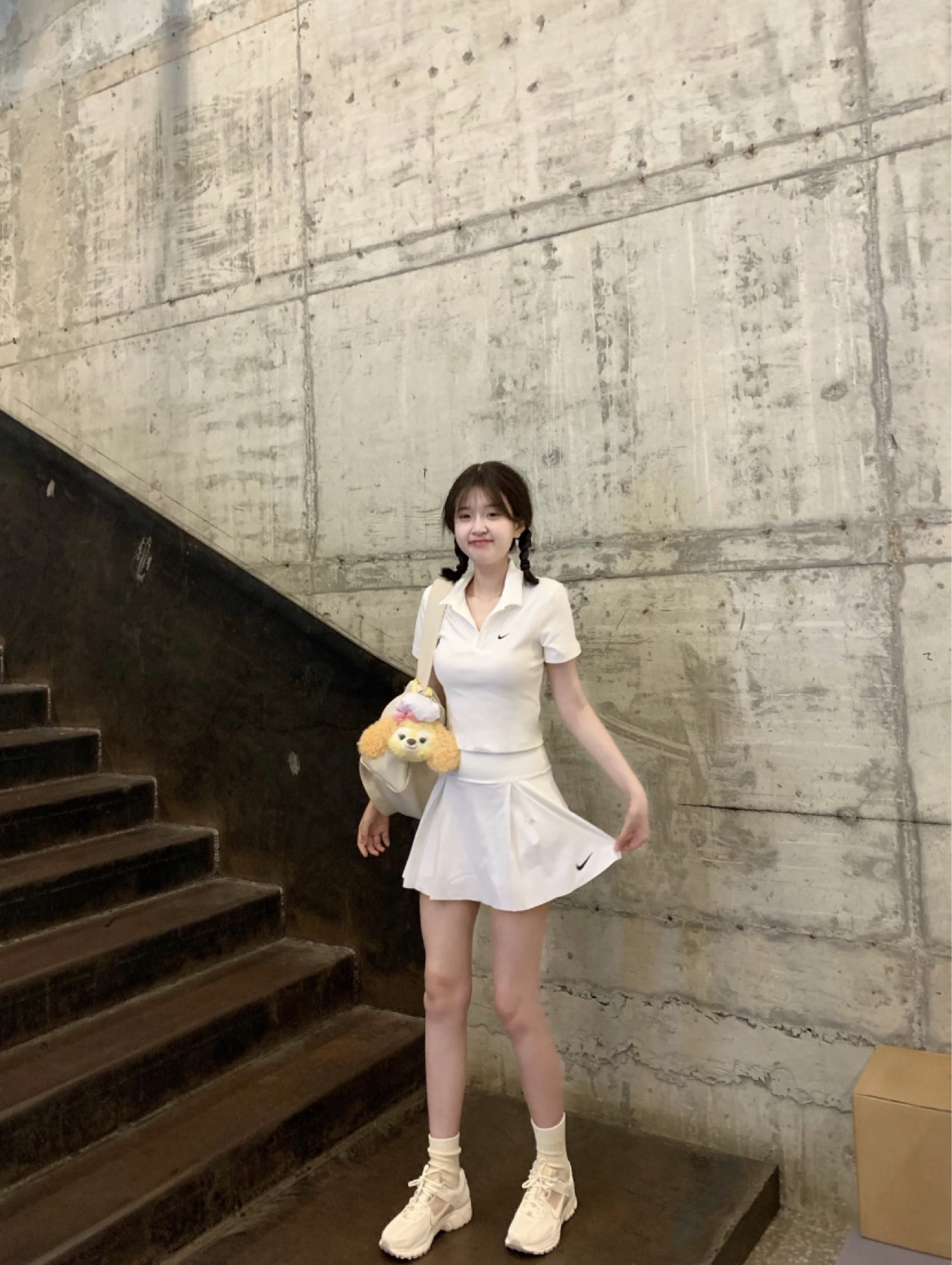 好喜欢这身穿搭呀 Nike网球裙+正肩polo T 阳光活力!! 裙子是A字版型,搭配nike vomero5,显得腿又长又细~ 日常or运动穿舒服好看,又少女又运动!! 焦糖奶茶色的nike Vomero5复古感也轻松拿捏住 这就是夏天的快乐嘛!!