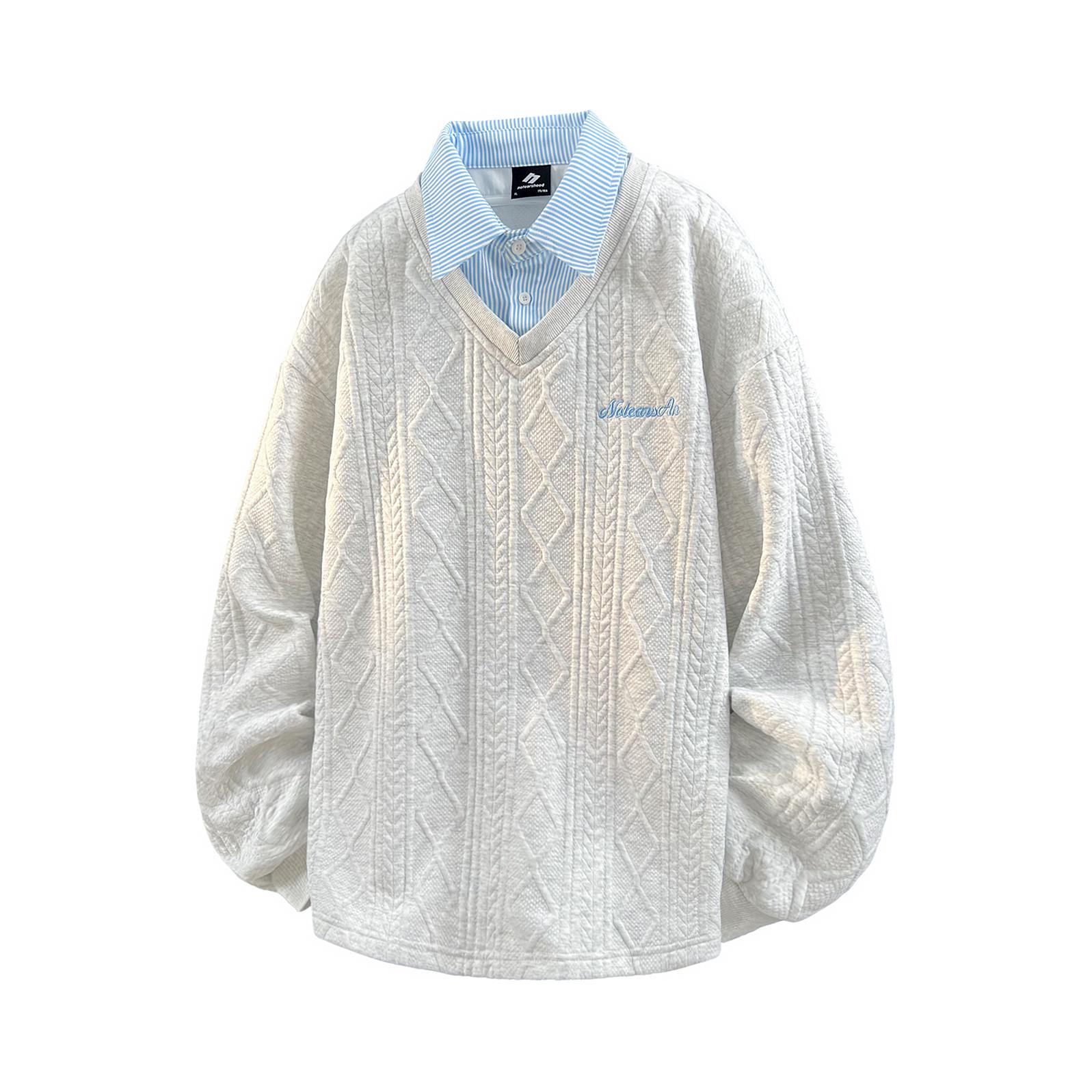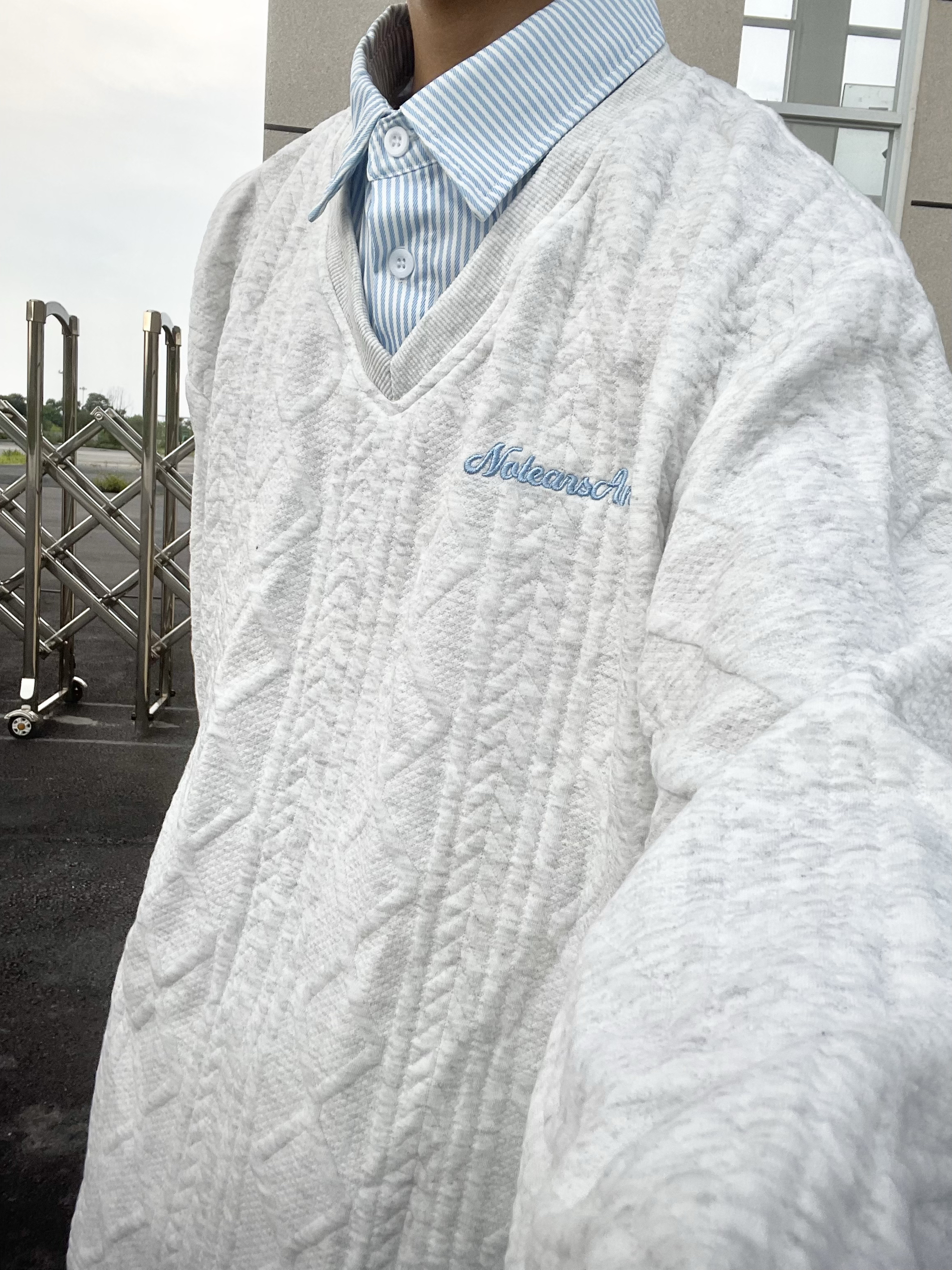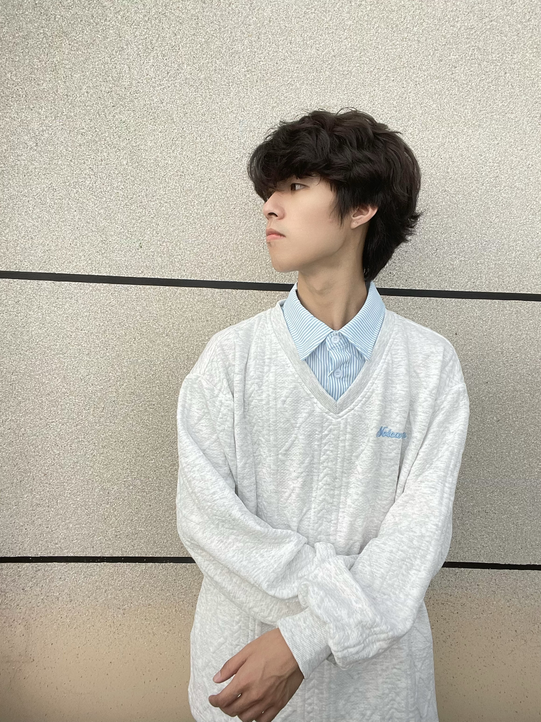 家人们!我身上这件 No Tears 绝绝子💫 早秋氛围感拉满[耍帅_blue] 浅灰色V领针织衫,面料软软糯糯,贴身穿很舒服~ 内搭蓝白条纹衬衫,层次感拉满 配牛仔裤随性又好看,日常出街、和朋友闲逛穿它,松弛感直接拉满,随手一拍都自带少年感