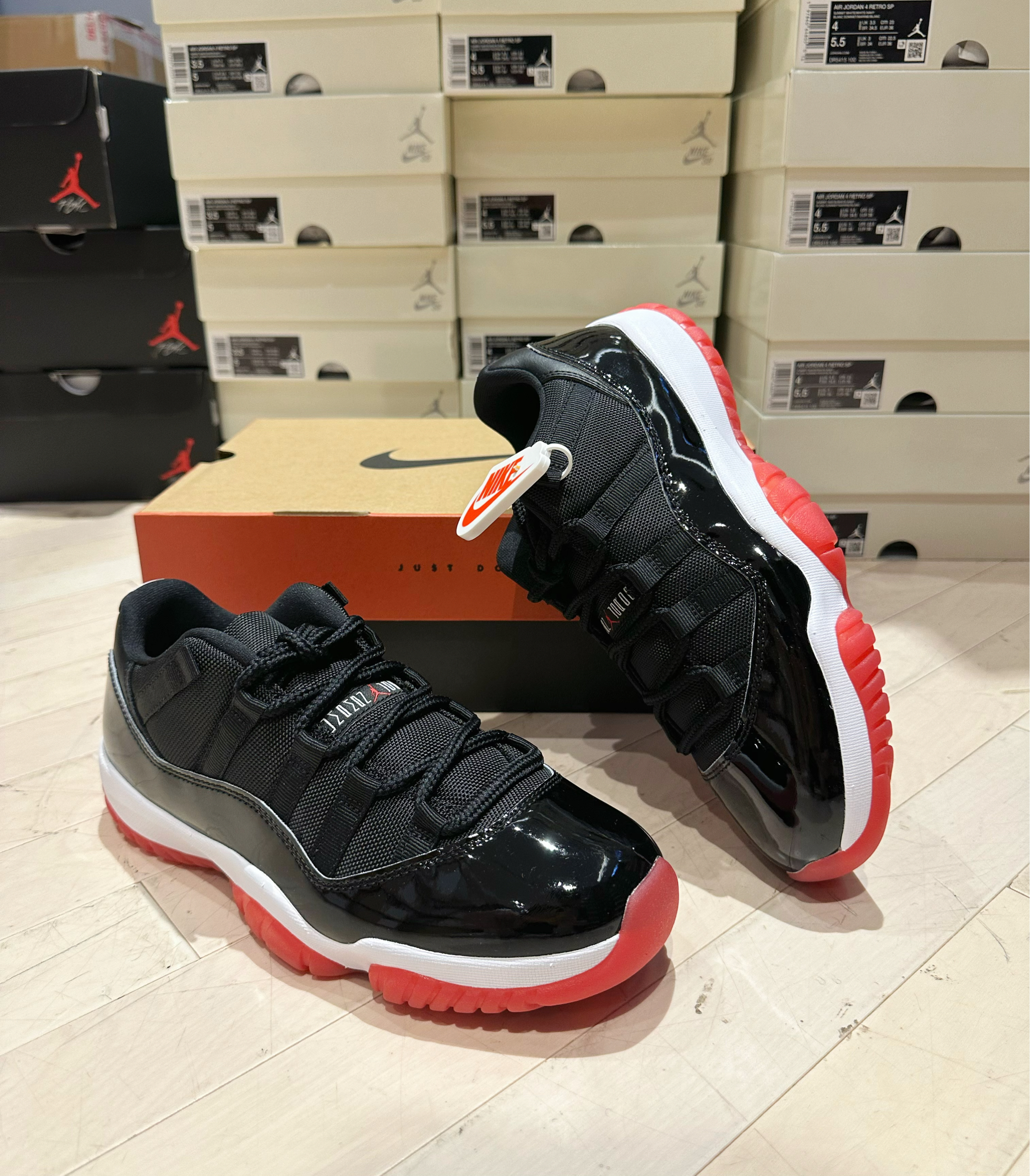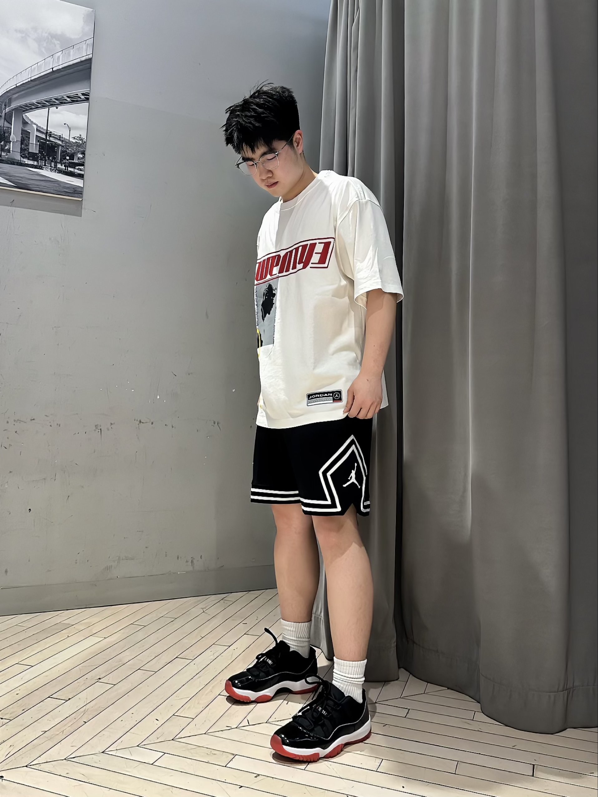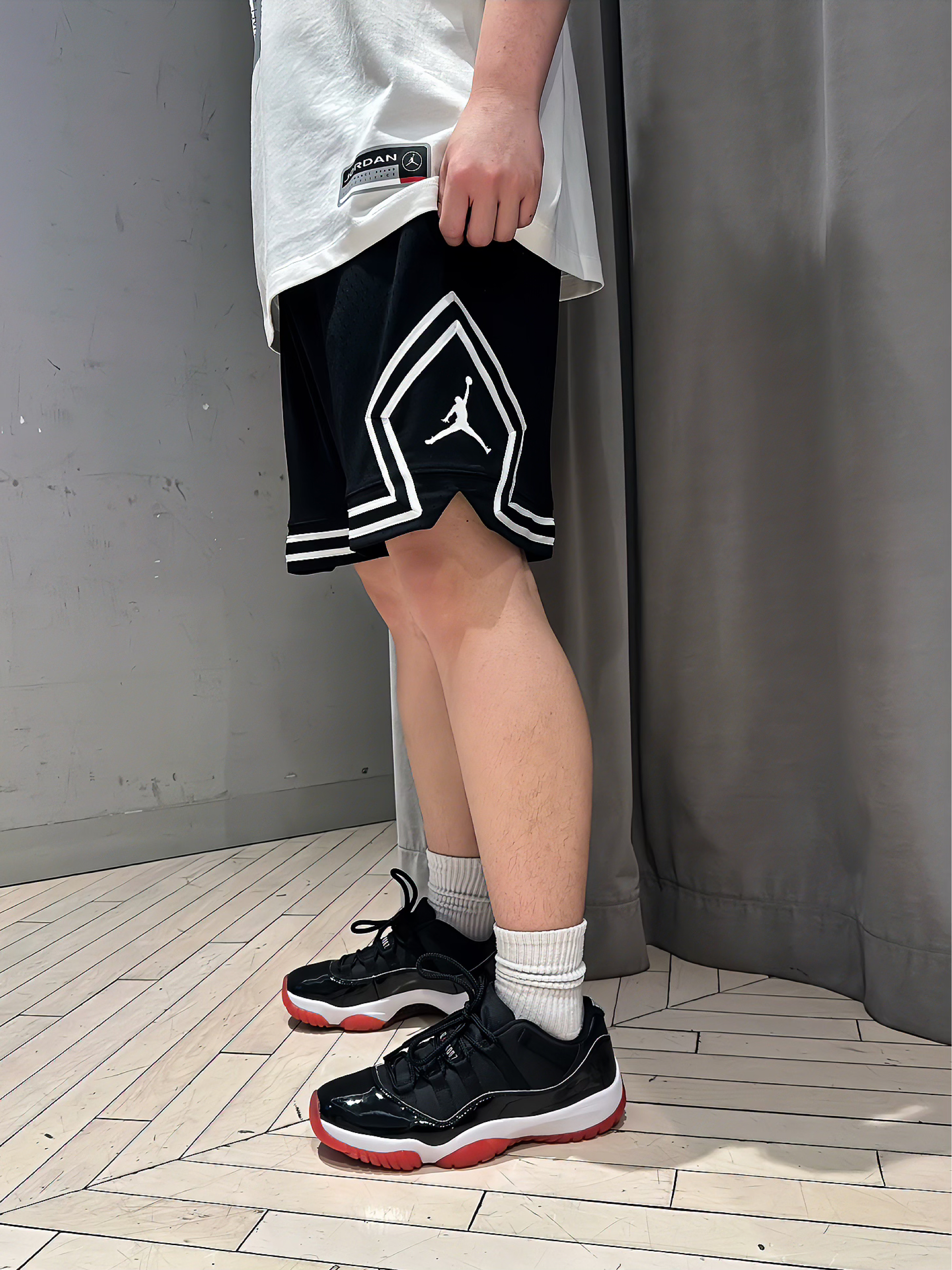 👕:aj白色印花短袖 🩳:aj经典篮球裤 👟:aj11low黑红配色 整体以简单的⚫️⚪️黑白搭配为主,让人感觉很清爽干净!衣服面料纯棉材质穿着舒适柔软,裤子速干面料轻盈透气,鞋子aj11经典黑红配色上脚很帅🌟,这套穿搭无论打球🏀还是日常出行都是不错的选择👍