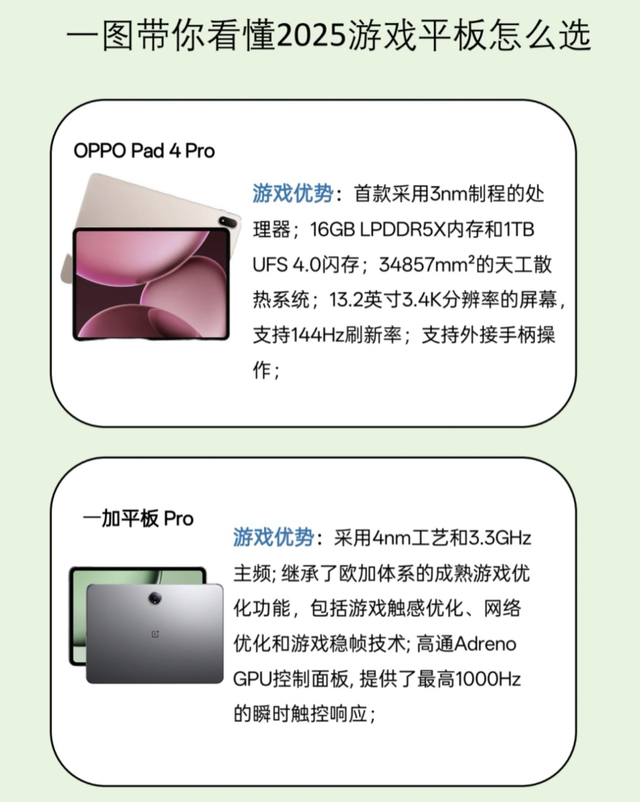2025游戏平板怎么选?六款热门机型速评 想入手游戏平板的宝子看过来!整理了 2025 年六款热门游戏平板,从性能、屏幕到续航,帮你快速理清选购思路👇 1. OPPO Pad 4 Pro • 核心亮点:高通骁龙 8 至尊版芯片,性能第一梯队,大型游戏轻松驾驭;13.2 英寸 LCD 屏 + 3.4K 144Hz 高刷,画面清晰流畅,触控响应跟手;12140mAh 大电池 + 67W 快充,续...