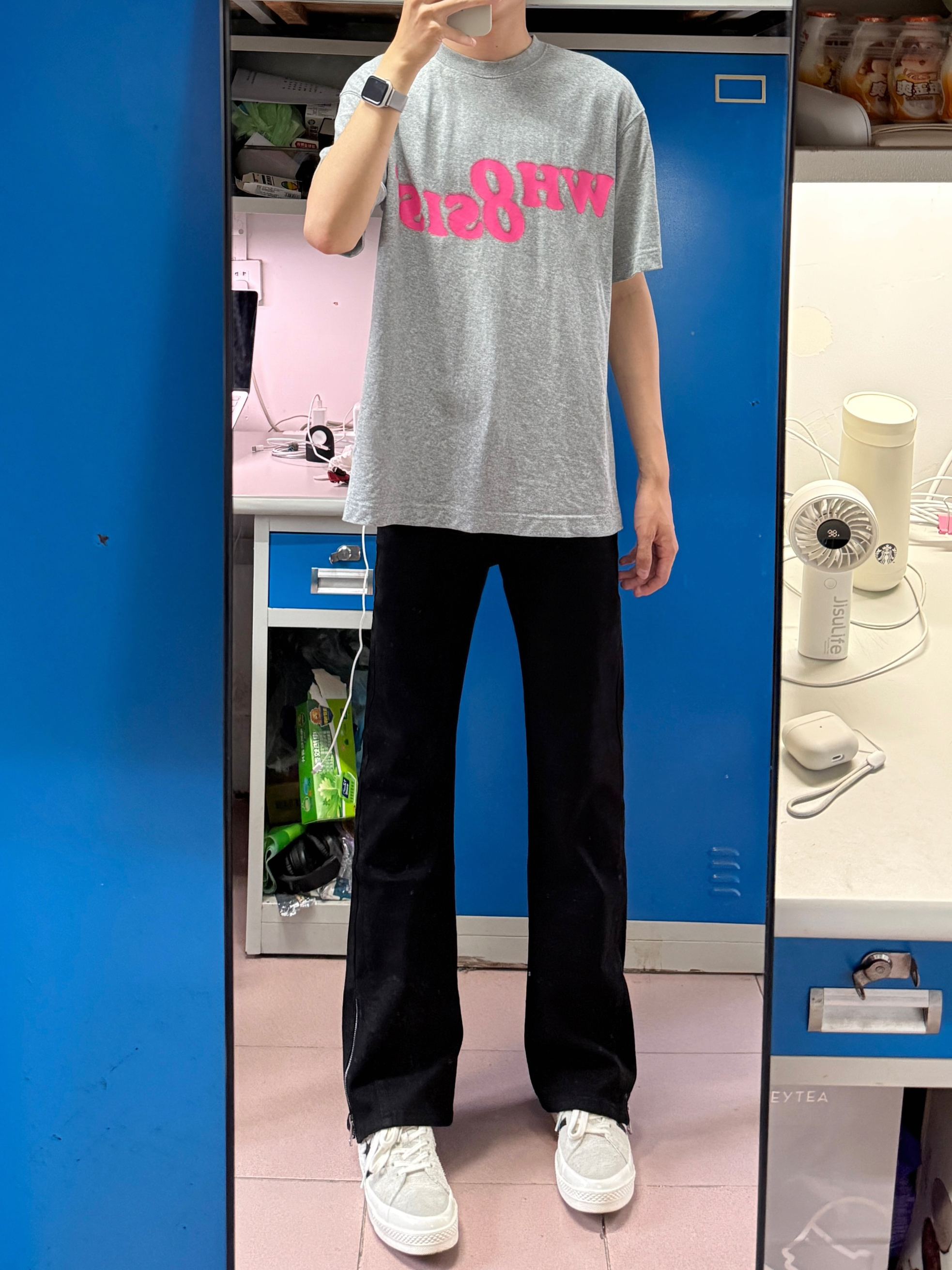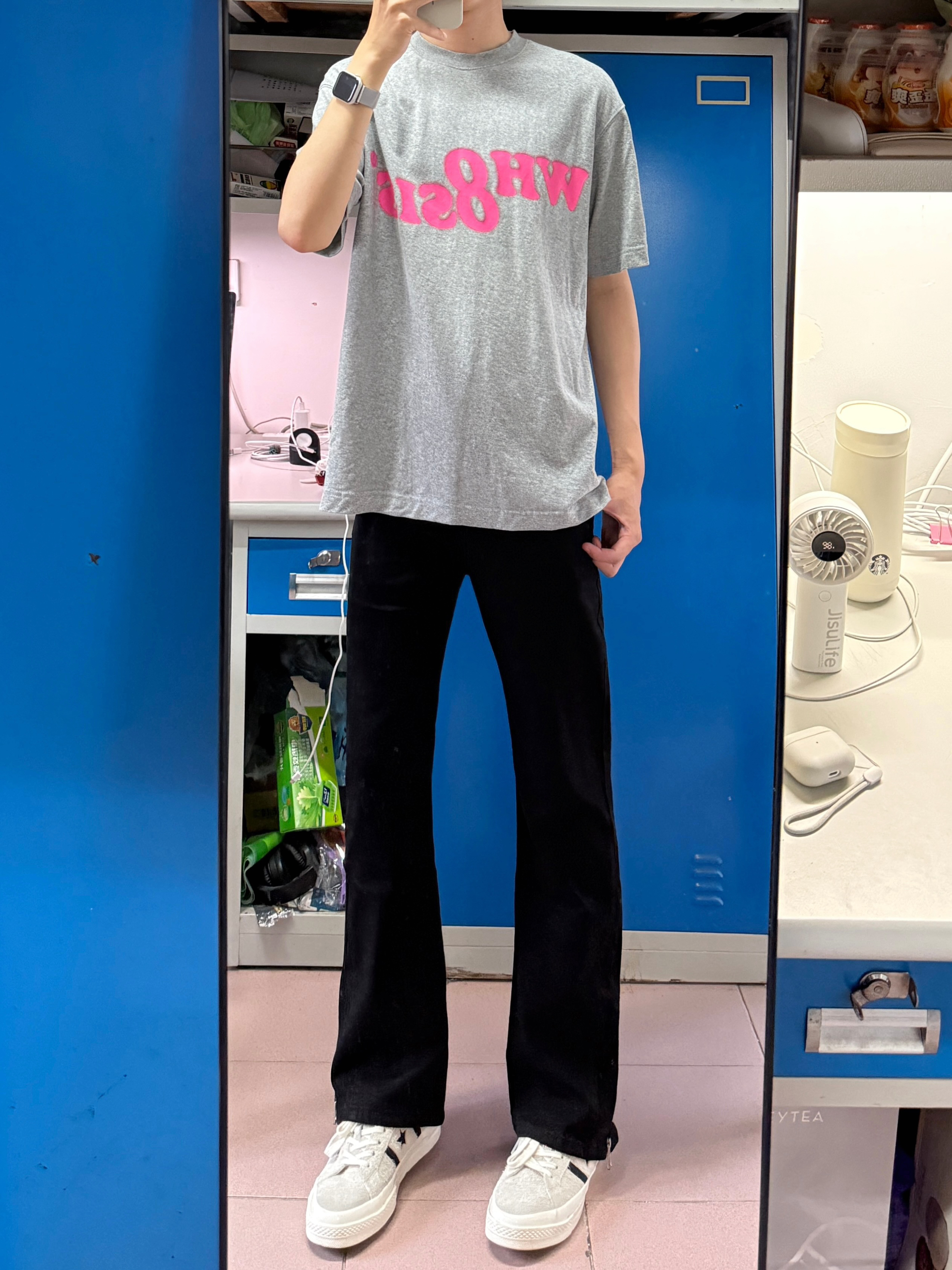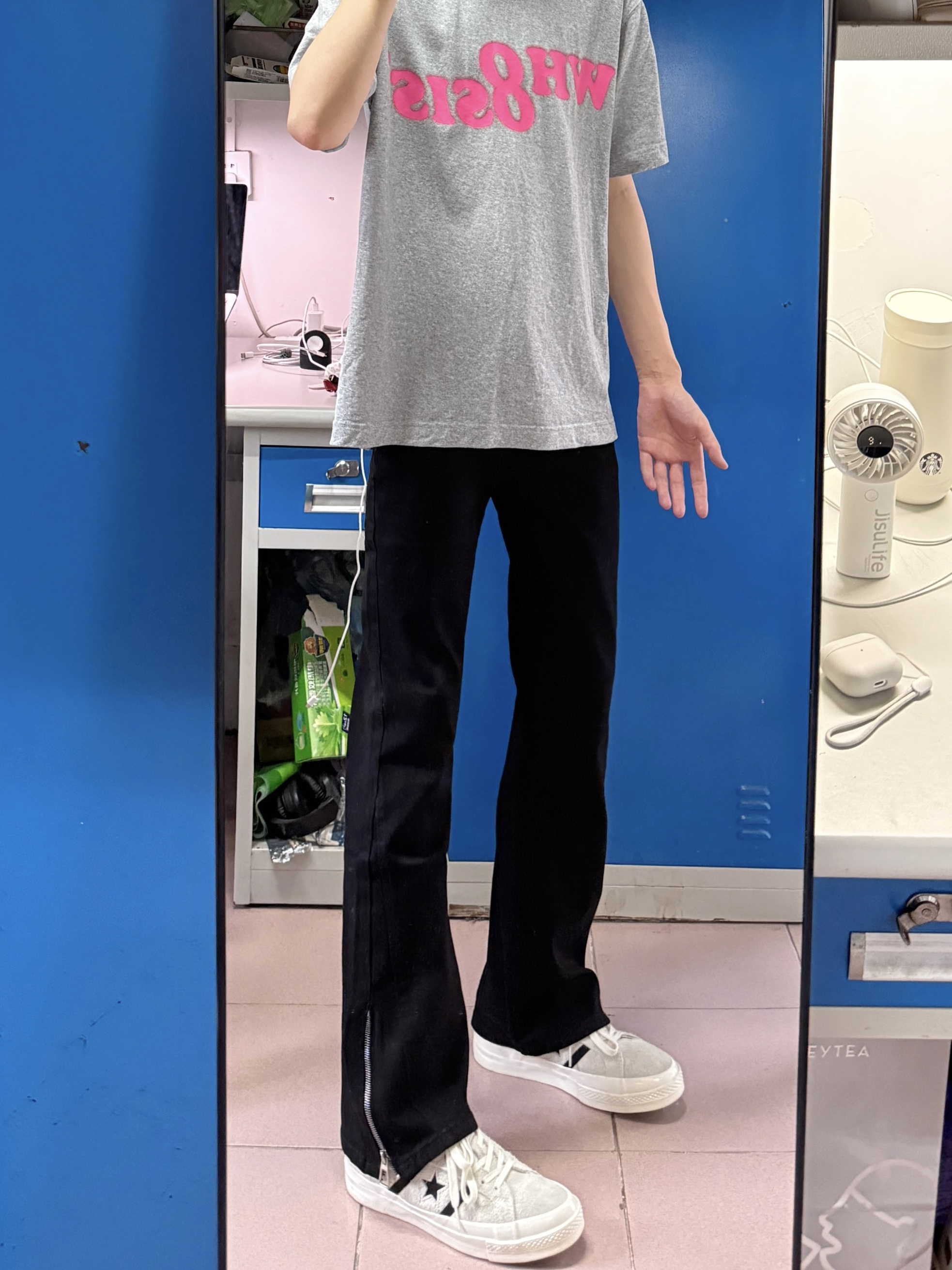 黑色牛仔裤真的很百搭不挑人,这条就很不错,微喇的设计,裤腿的拉链也很潮,上身好看