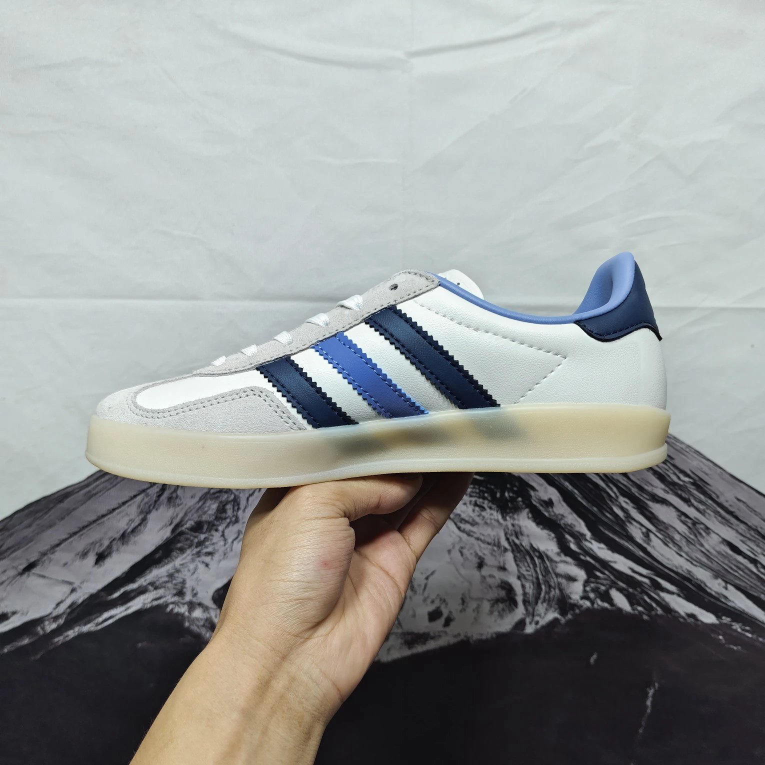 复古控必锁!阿迪达斯Gazelle Indoor 复刻经典,米白基底碰撞蓝紫条纹,麂皮+皮革拼接细腻有层次,生胶大底自带复古滤镜。三条纹标识点睛,日常出街、轻运动都适配,轻松拿捏复古运动风,每一步都踩在潮流审美上,妥妥穿搭加分王!