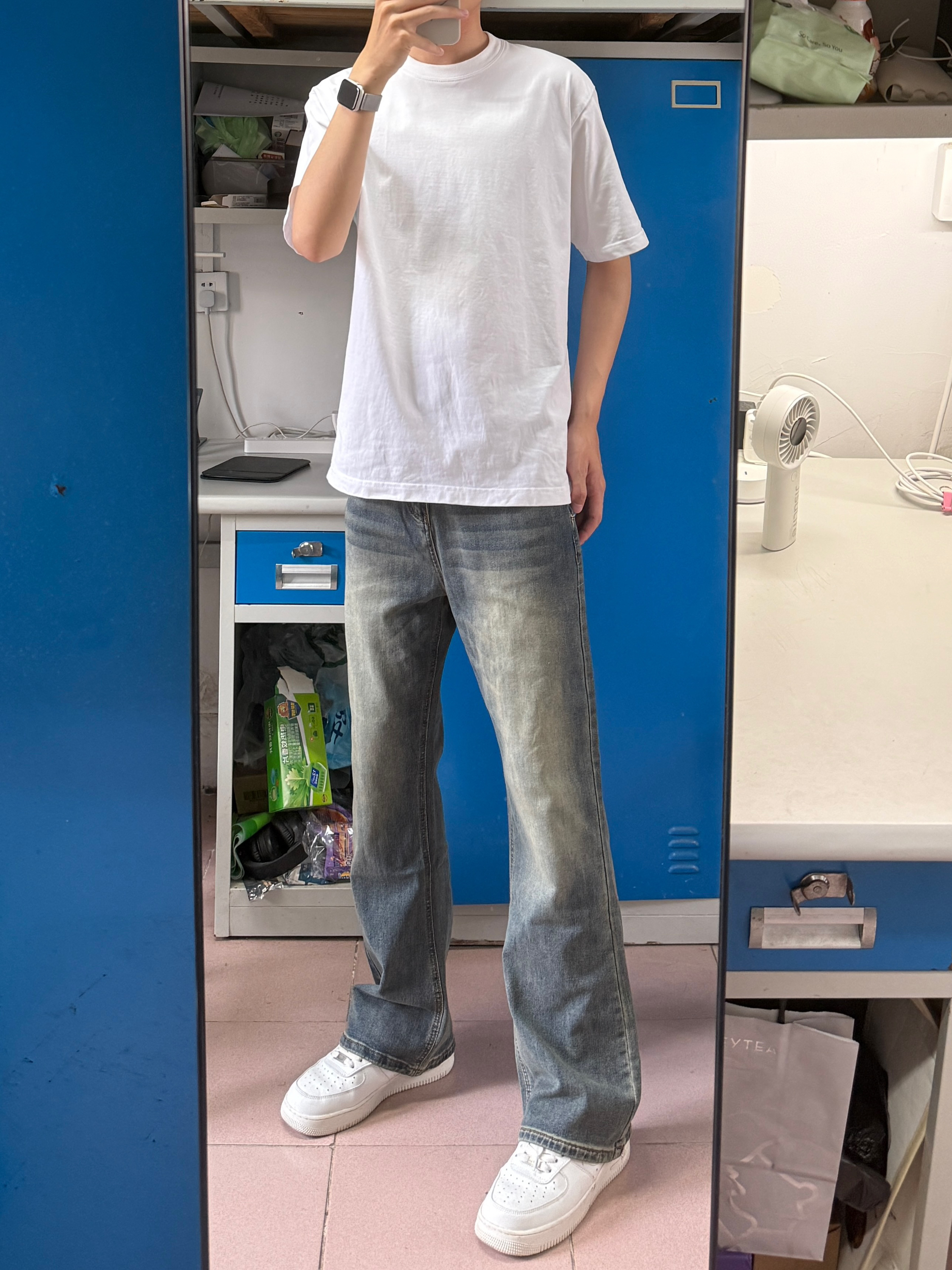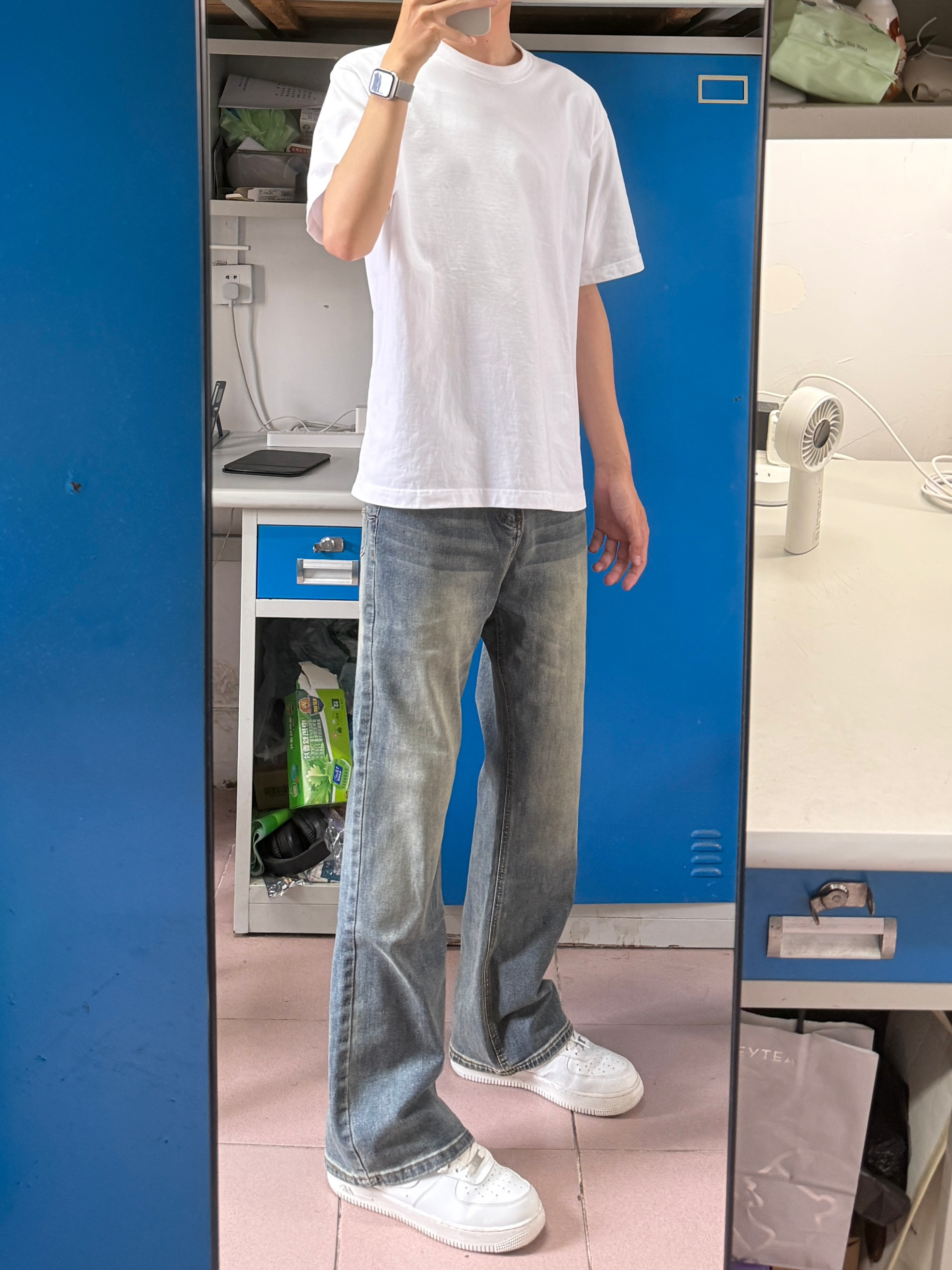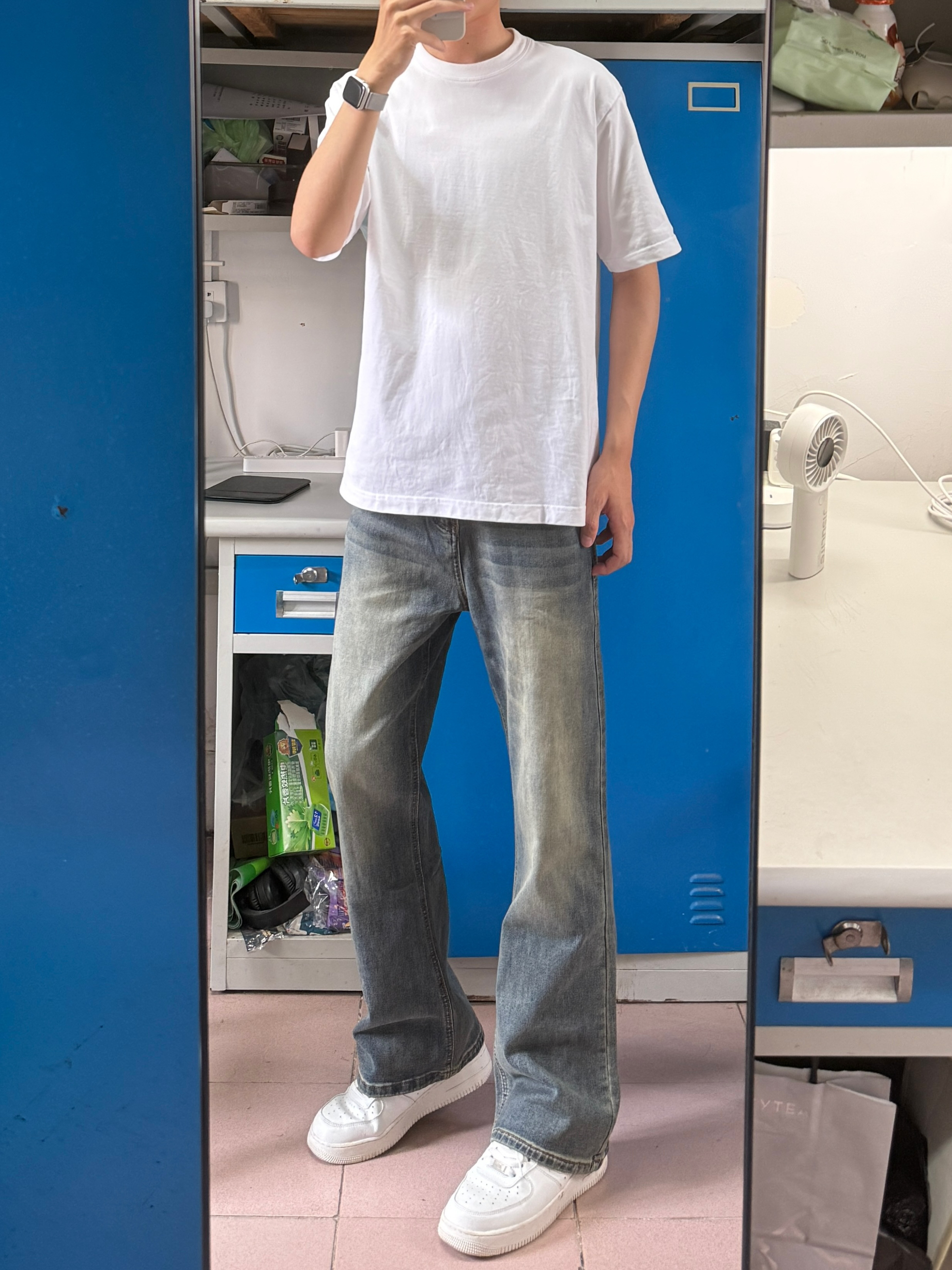 今天穿的复古蓝色牛仔裤➕纯白T恤➕白色鞋👟夏天就是要这样简单干净的穿搭才好👌