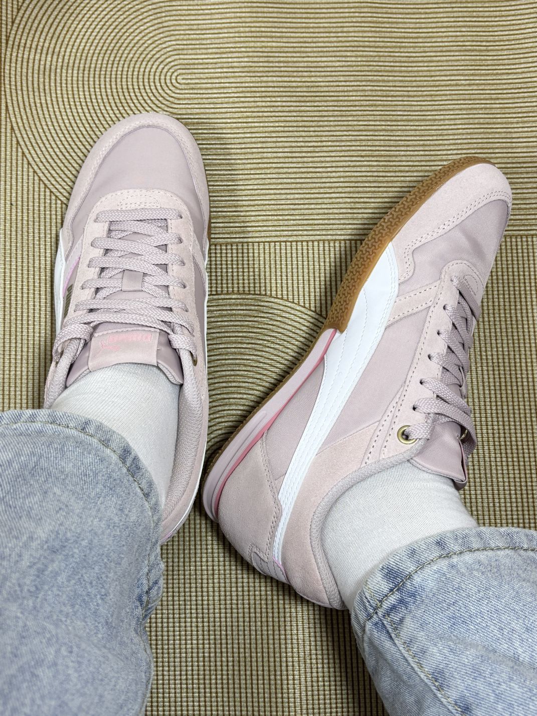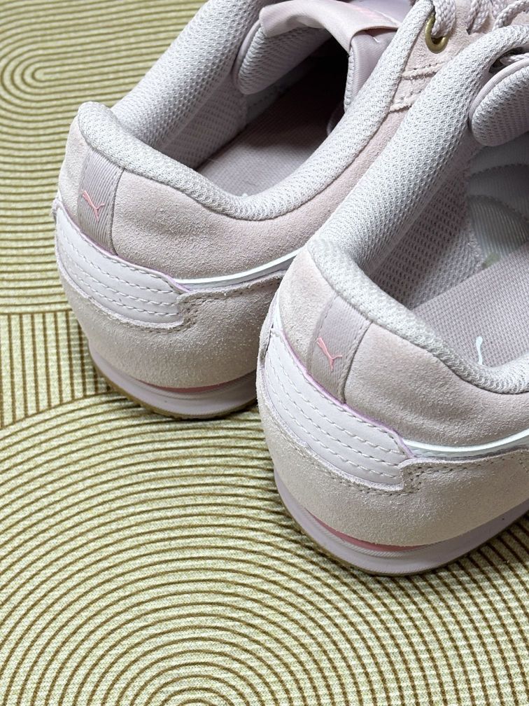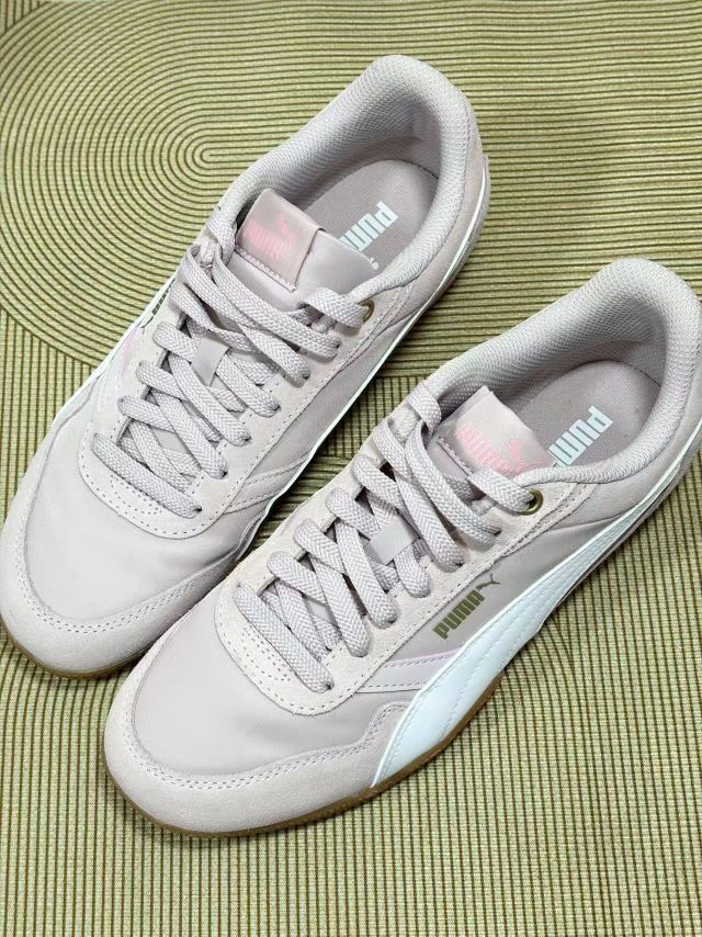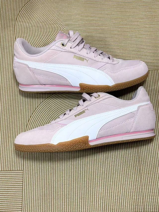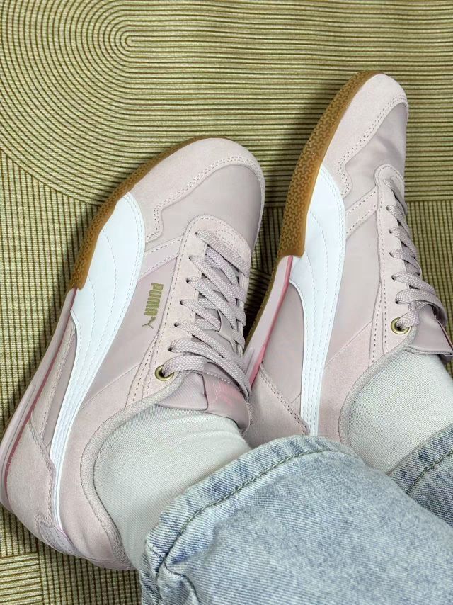 这双PUMA的板鞋,上脚感受还挺特别的✨ 浅粉色很温柔,配牛仔裤、小裙子都不违和,日常穿搭轻松拿捏。 说真实体验哈,优点是脚感不算硬,走路久点也没太难受,鞋型对脚宽的我算友好。不过缺点也有,鞋面粉质有点容易沾灰,稍微走两步土路,回来就得擦擦, 另外,这颜色虽好看,但打理得小心,脏了不是很好打理 总体来说,十分白搭,还是不错的,值得入手