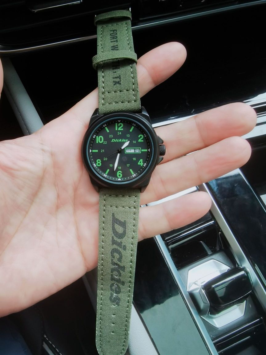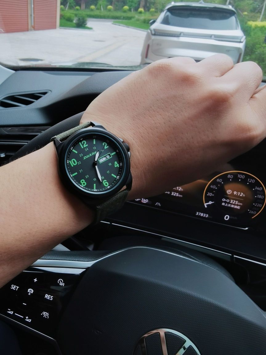 夏日穿搭简单舒服就对了 黑色的始祖鸟短袖上身主打一个极简 纯棉的面料亲肤吸汗不会闷热 搭配DK绿色腕表增添了不好的高级感 表盘黑色配绿色看上去就很醒目 时间会看的一清二楚 表带是军绿色帆布的 戴着手感好还挺显个性 实用性和颜值都在线