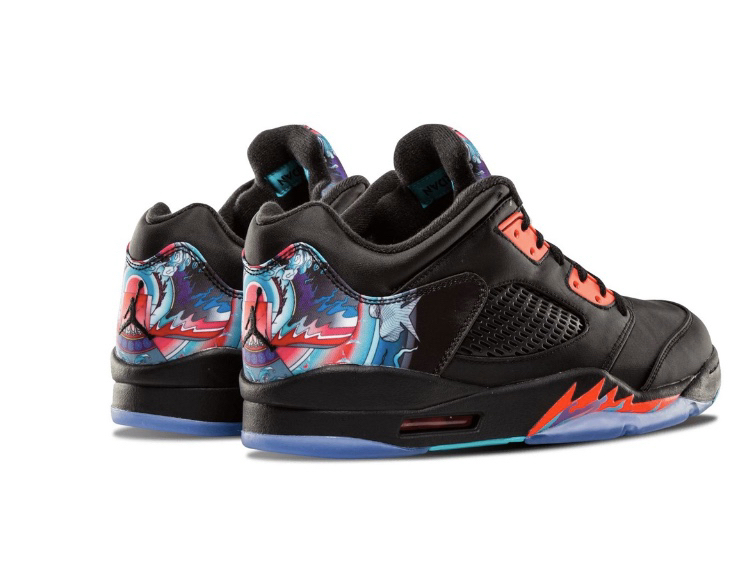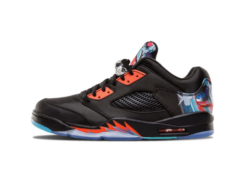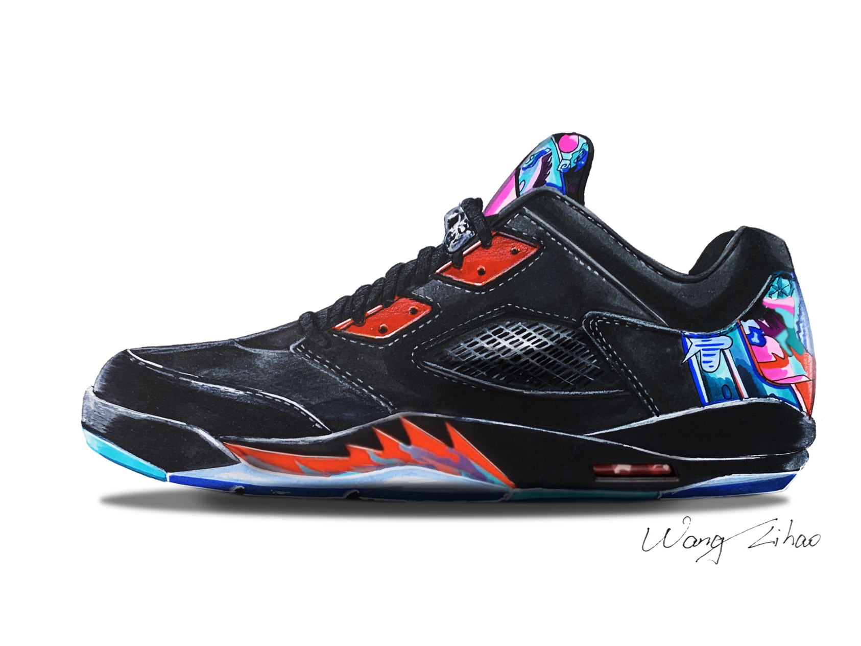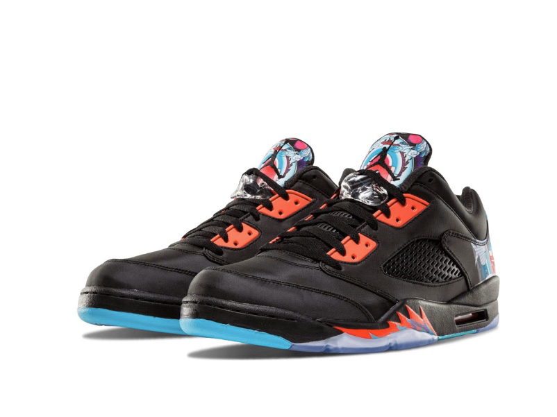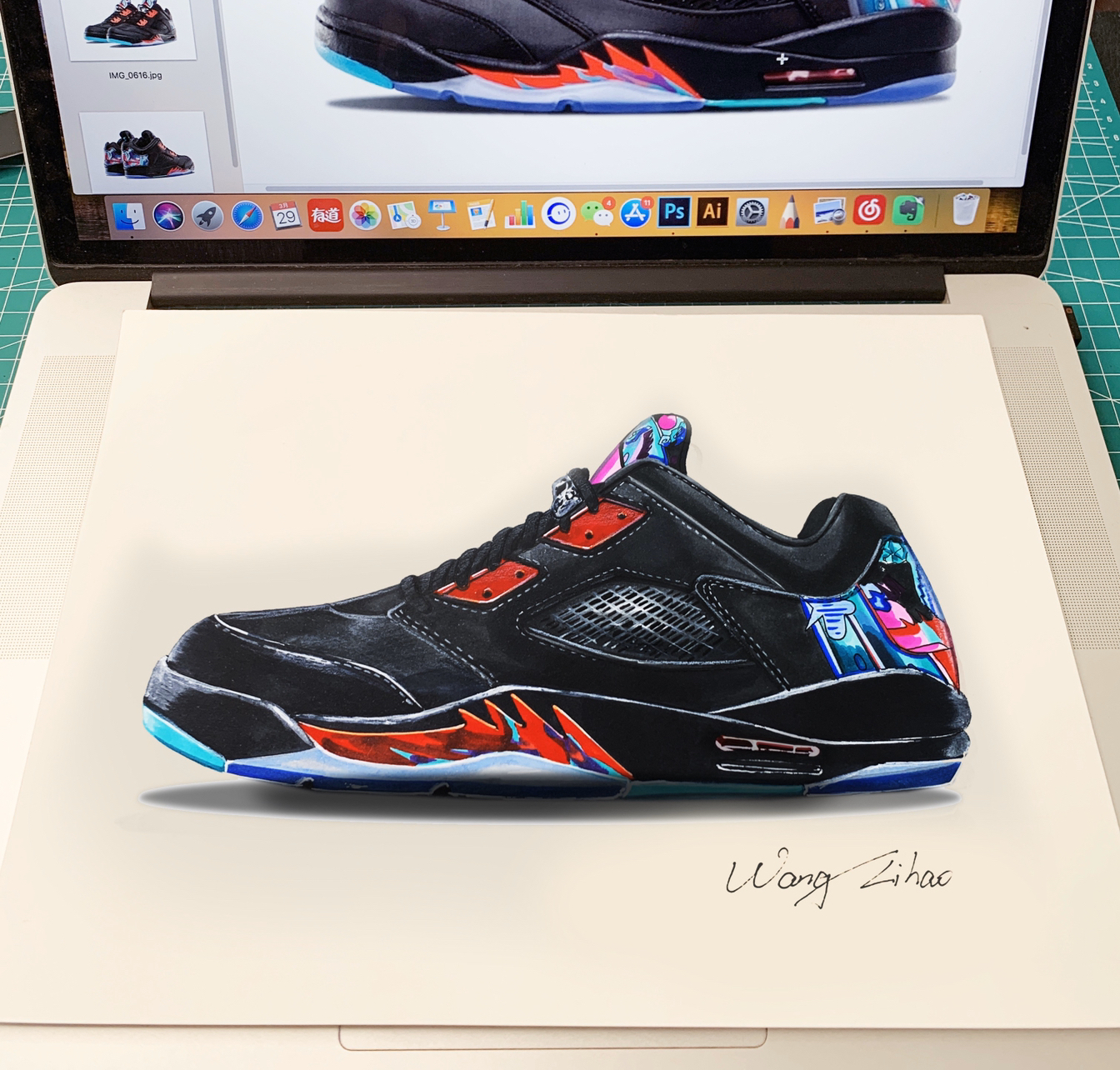 AJ5风筝,被誉为AIR JORDAN系列中最为美观的一款。其外形灵感来源于战争期间美国最为著名的野马战斗机涂装,中底侧面带有战斗机的鲨鱼牙齿纹路,使得鞋款看上去极富攻击性和识别度,完美契合帮主霸气迅猛的球风,同时极具装饰性的中底效果对往后的球鞋设计产生深远的影响。