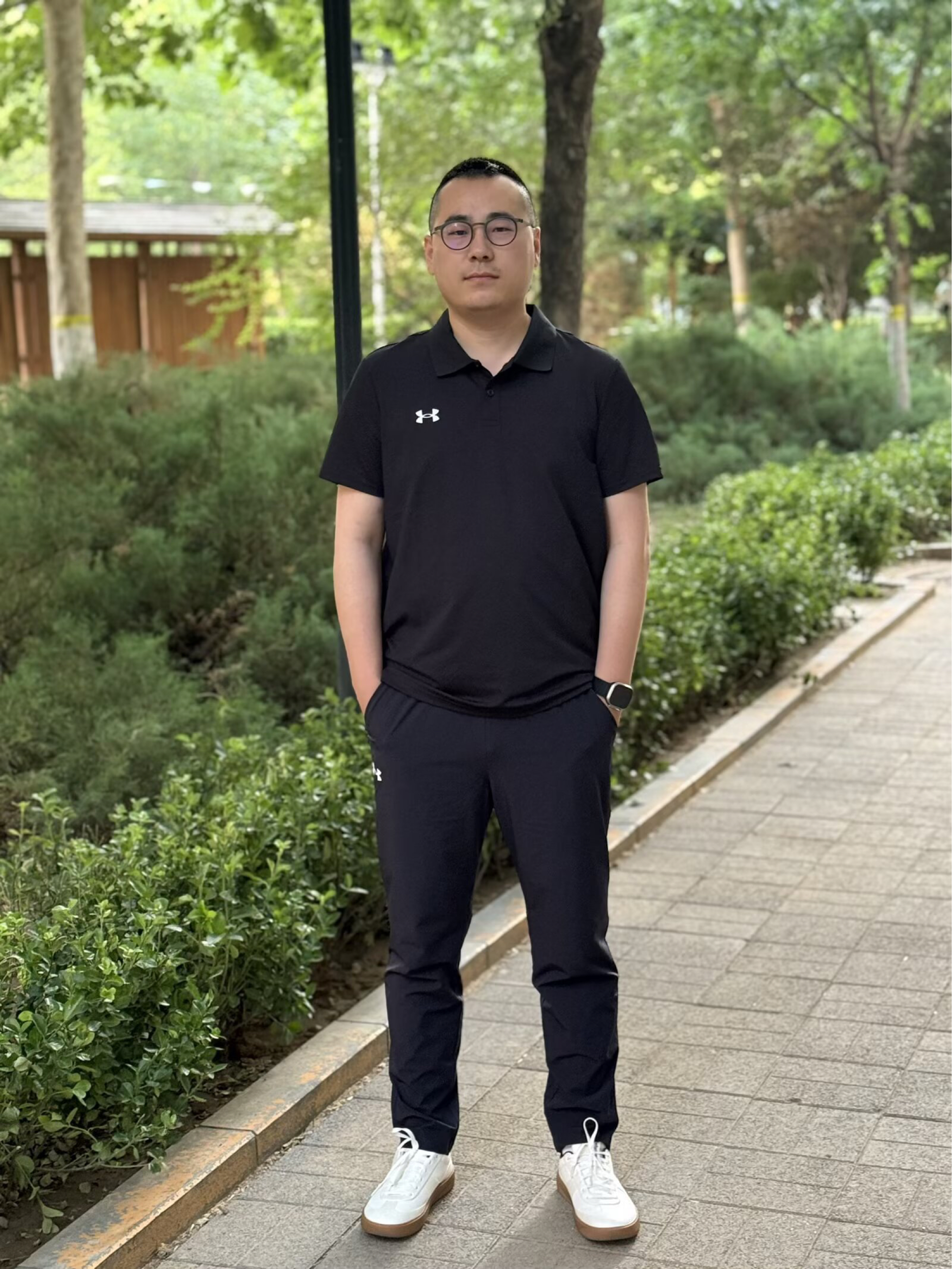 经典黑色Polo衫,简约大气不挑人,日常通勤、休闲出行都超合适,胸前的品牌标志低调又有质感,瞬间提升穿搭格调。 搭配同系列运动长裤,面料轻薄透气,夏天穿也不会闷热,还能修饰腿型,让整体造型更利落。再踩上一双白色休闲鞋,清爽又减龄,妥妥的夏日活力男神范。 整套穿搭舒适又有型,不管是上班通勤,还是周末和朋友去打球、逛公园,都能轻松驾驭,打工人的夏日时尚密码,这不就被安德玛给狠狠拿捏了嘛!