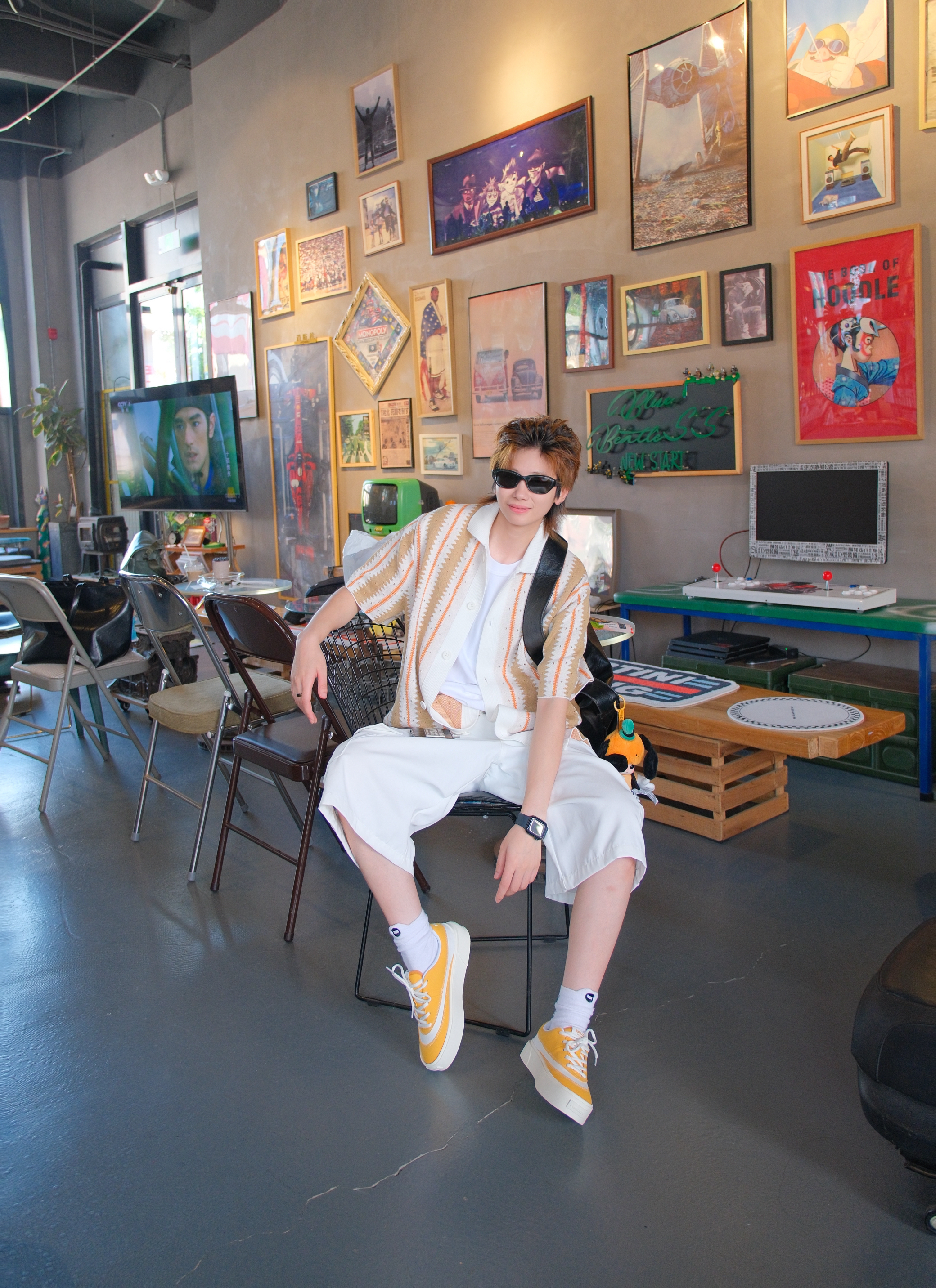 被老王哥种草了阿迪的这件衬衫 今天就用它来搭一套look 黄杏色的拼接撞色条纹内搭背心 针织面料还挺厚的,秋天可以用来叠穿长袖 下身选择一条白色的七分工装裤 有点度假感 鞋子搭配同样白黄拼色的板鞋,上下呼应 鞋底很软,踩下去的感觉走久不累 配饰方面,背了一个黑色饺子包 挂上DIMOO的搪胶,带娃出门 Pu皮材质很软,斜挎单肩都可以 而且容量挺大的,日常通勤出门没问题 裤挂选的是黑色爆裂纹零钱包...