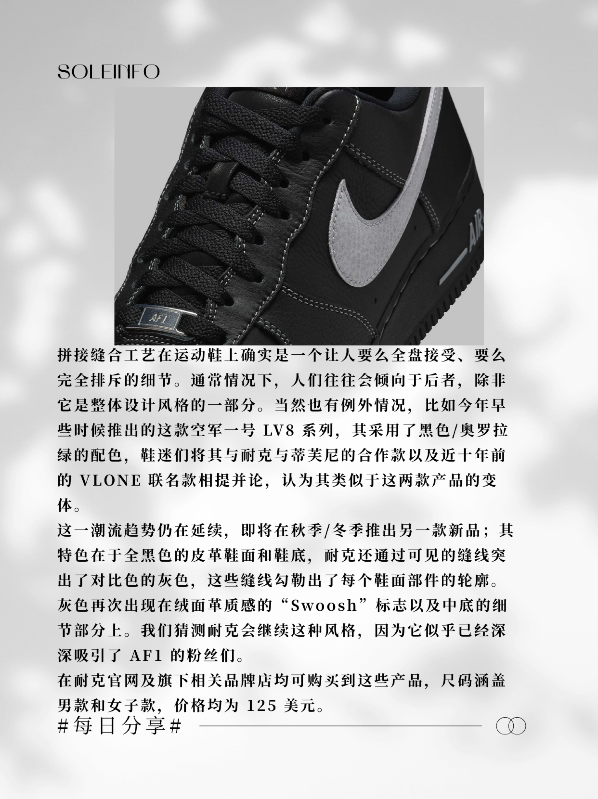 【Nike Air Force 1 新作!「黑灰缝线」学生党】,由用户 Soleinfo 分享,来自福建。这是一篇来自识货社区的真实用户分享笔记。