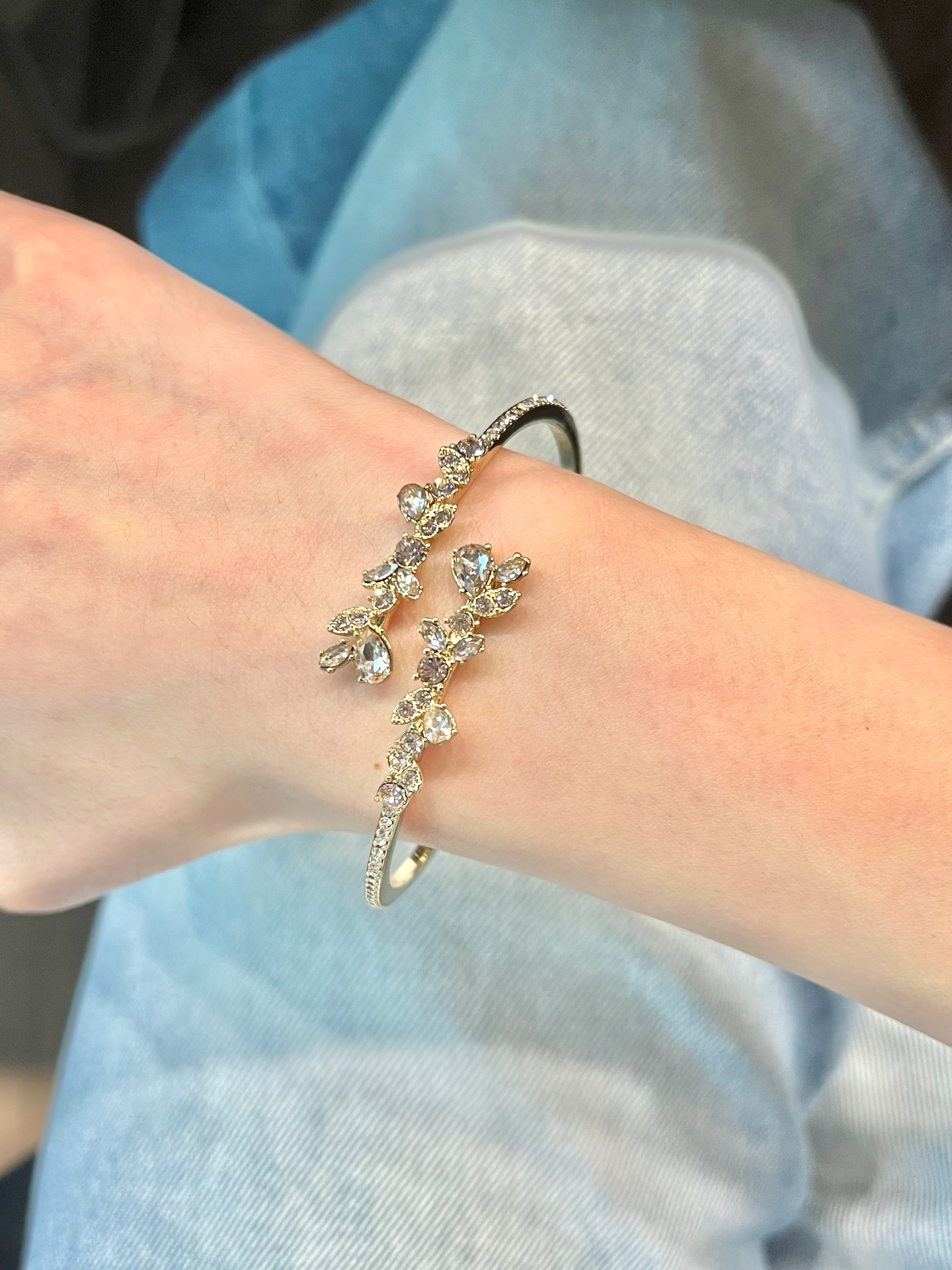 我被这款开口手镯迷住了😍。花卉造型搭配闪耀水晶,生命力与浪漫拉满💐! 上手超显手细。不过合金材质怕接触过多化学物品呢。总体来说,日常搭配、送女友啥的都超合适~