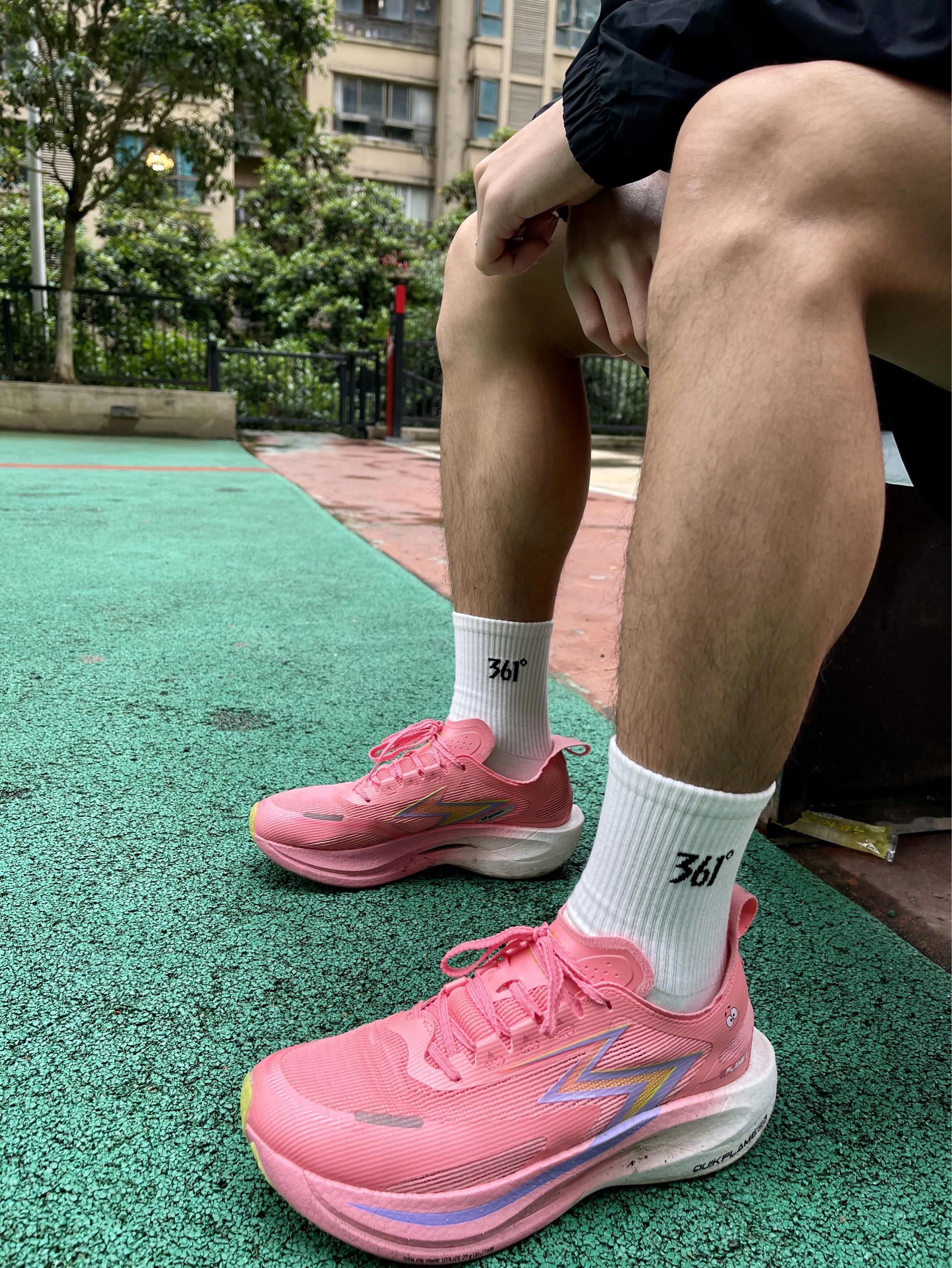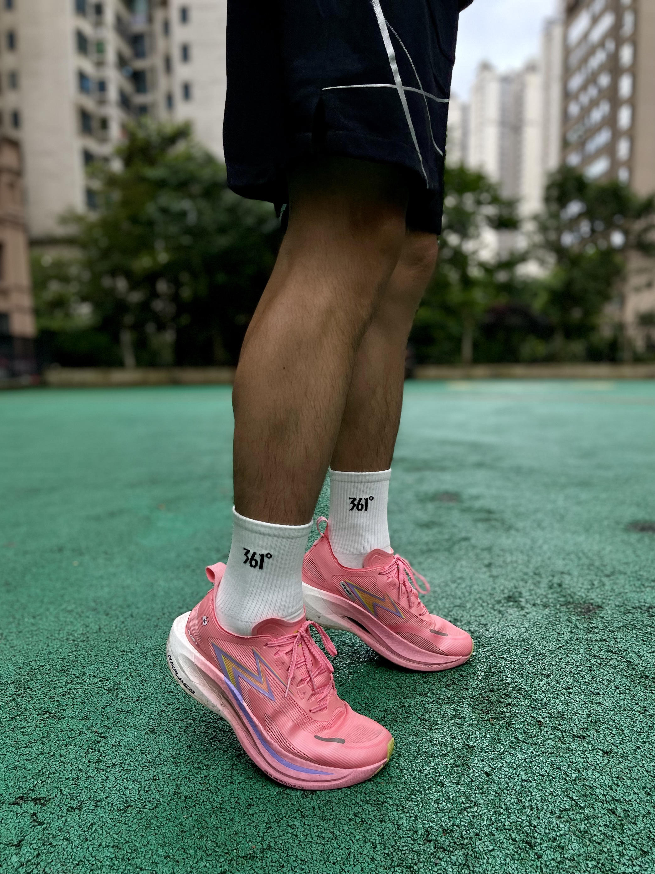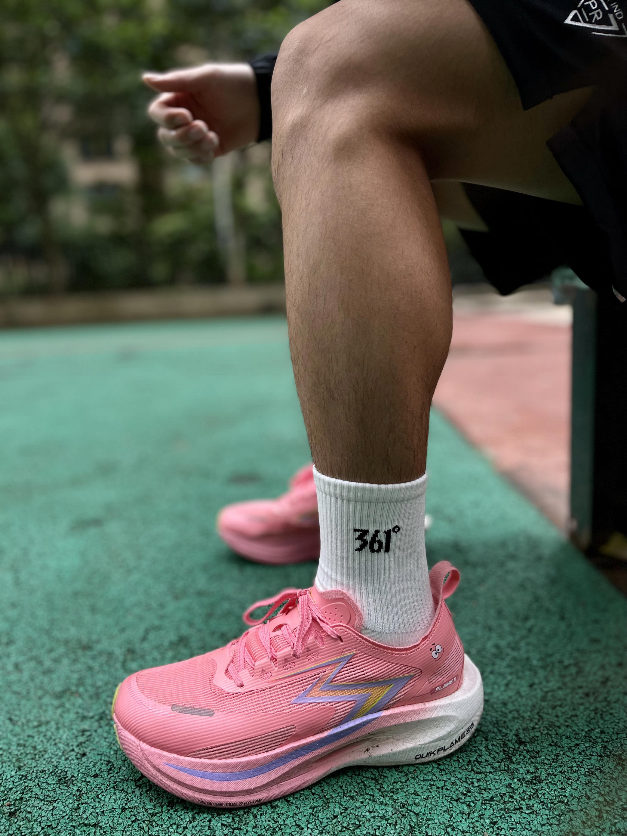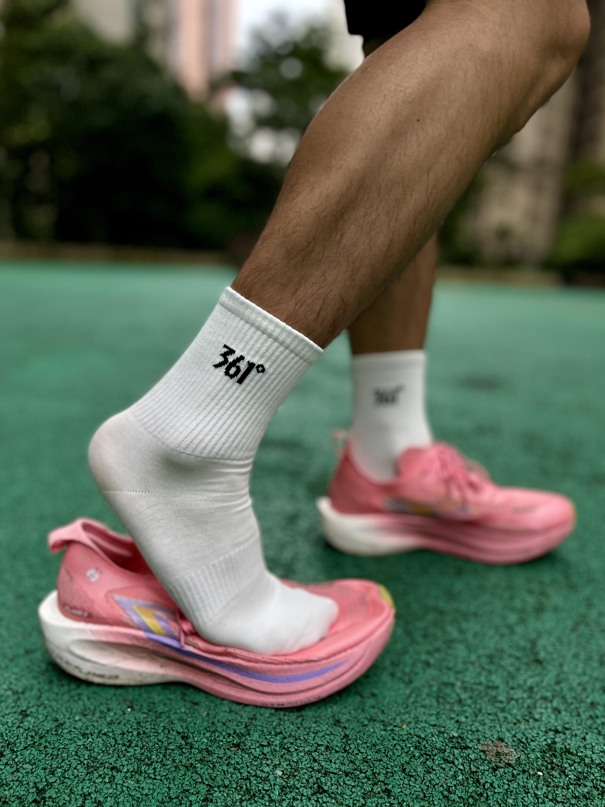 今天穿 361° 这双中筒袜跑了10公里🚶♂️ 全程脚底板像踩在风里💨透气很舒服! 无骨缝合完全不磨脚✨防臭黑科技跑完居然没异味👃 足弓处还有轻微压力支撑,跑半马全马下来脚踝都不酸! 日常搭运动鞋、板鞋都很好看~