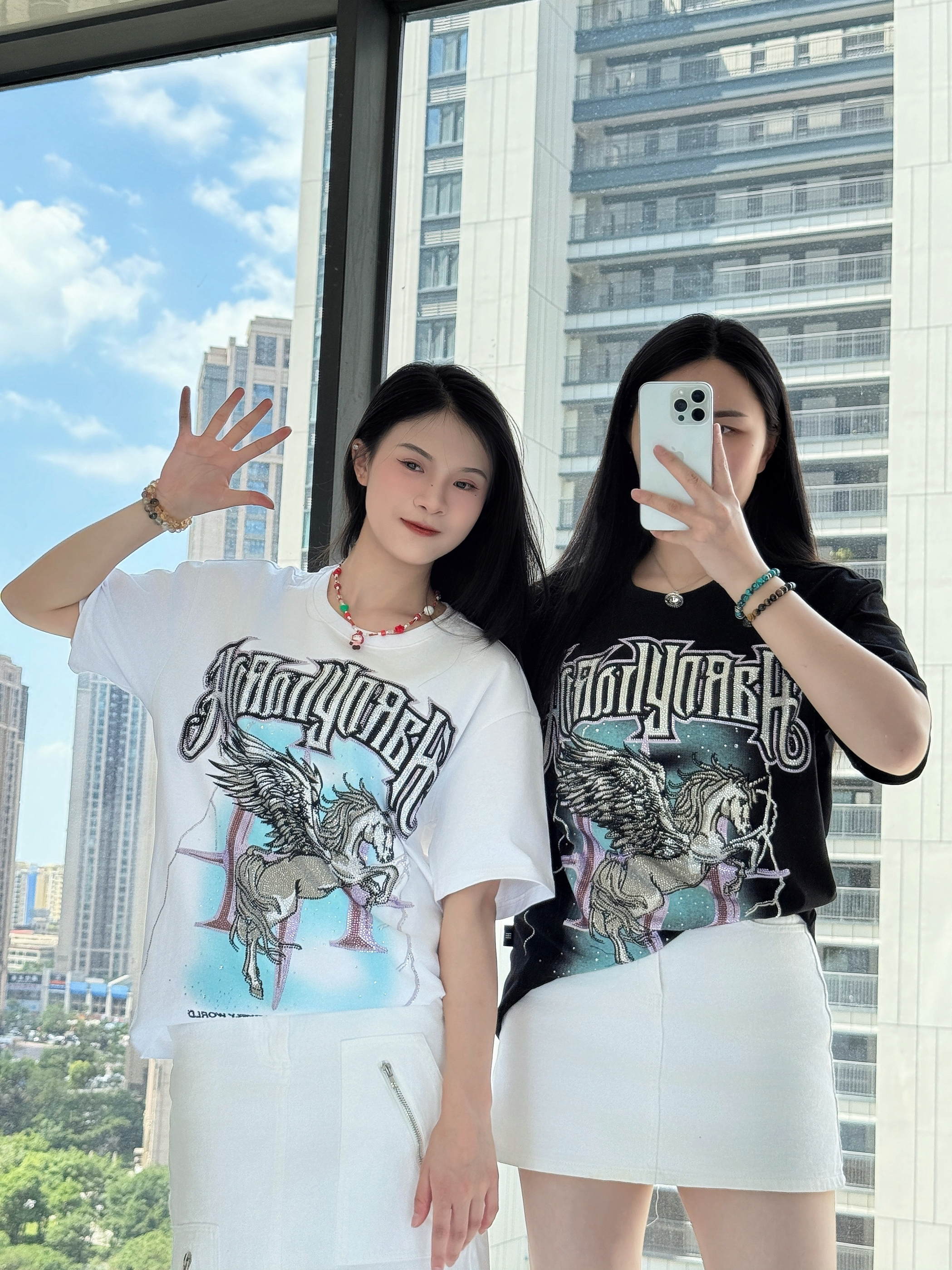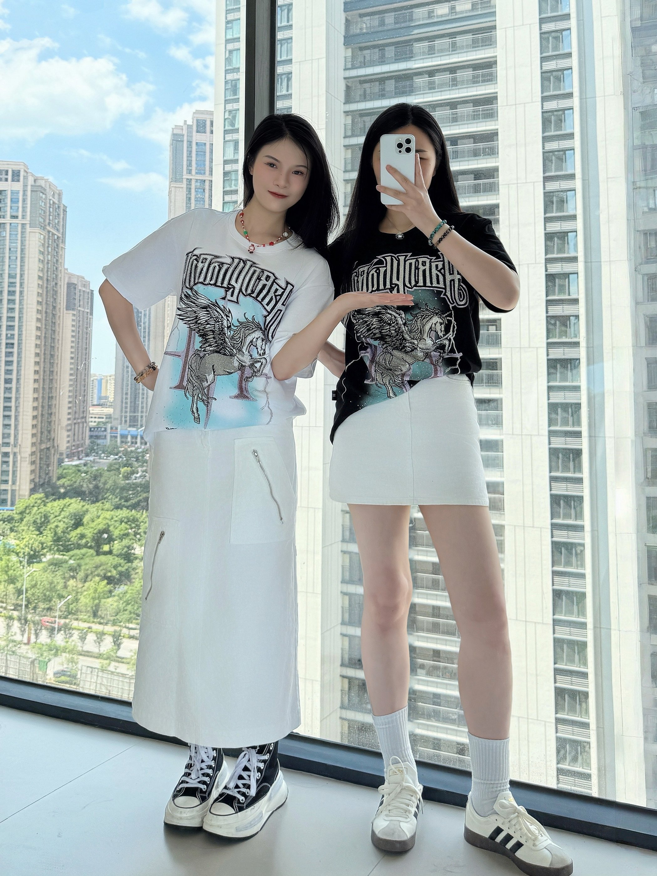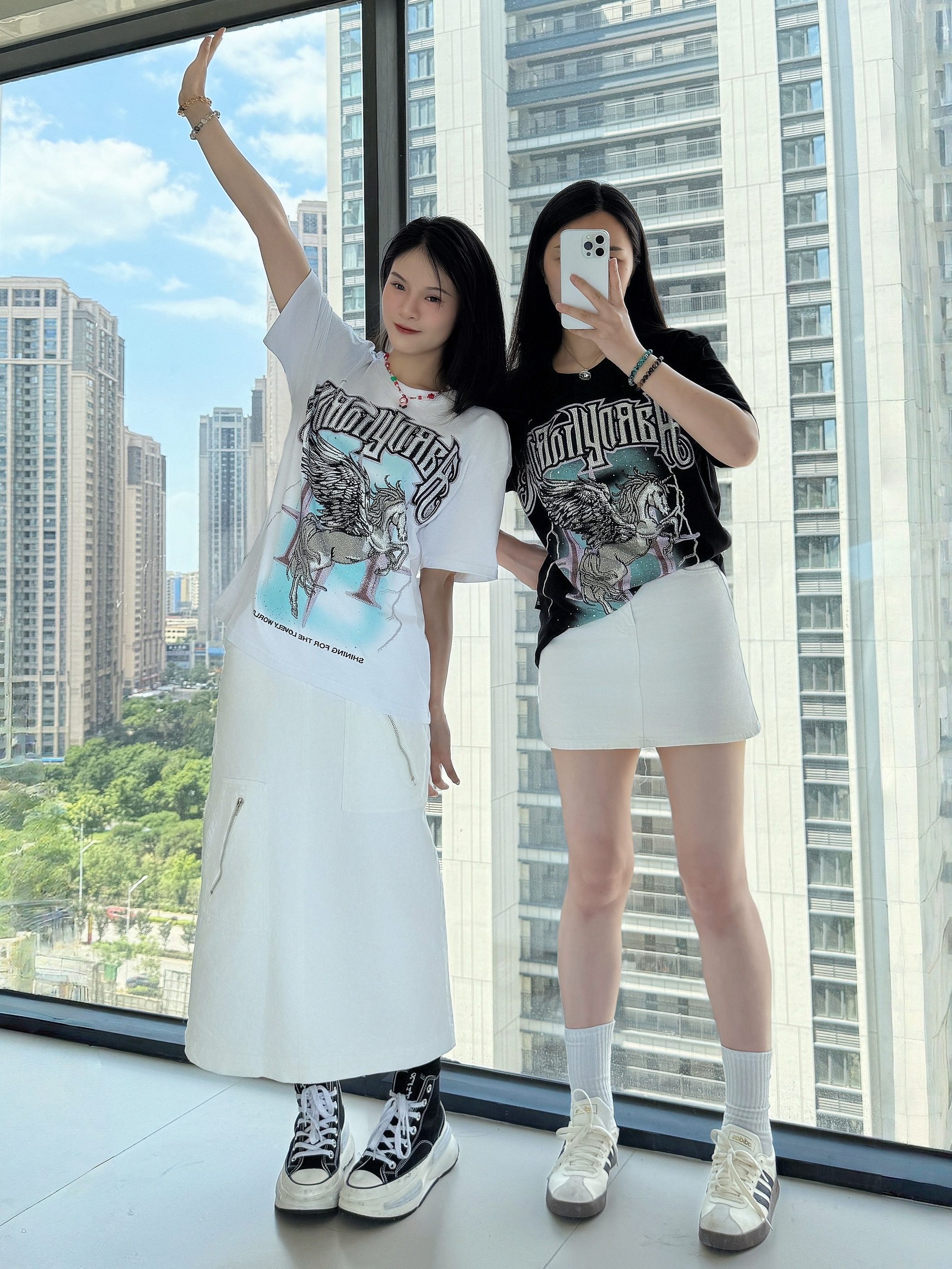 ⸝⸝⸝🪟⋆꙳⊹🪑⋰ 👚: HARDY 哥特风字母短袖 烫钻独角兽翅膀涂鸦印花 独特又有设计感 宽松的版型,上身舒适不闷汗 👗:白色长款牛仔裙/短款牛仔裙 衣服设计很十足 下半身选择清爽的白色裙子 👟:匡威夹心鞋/阿迪达斯德训鞋 满满设计感的美式复古风穿搭🥤