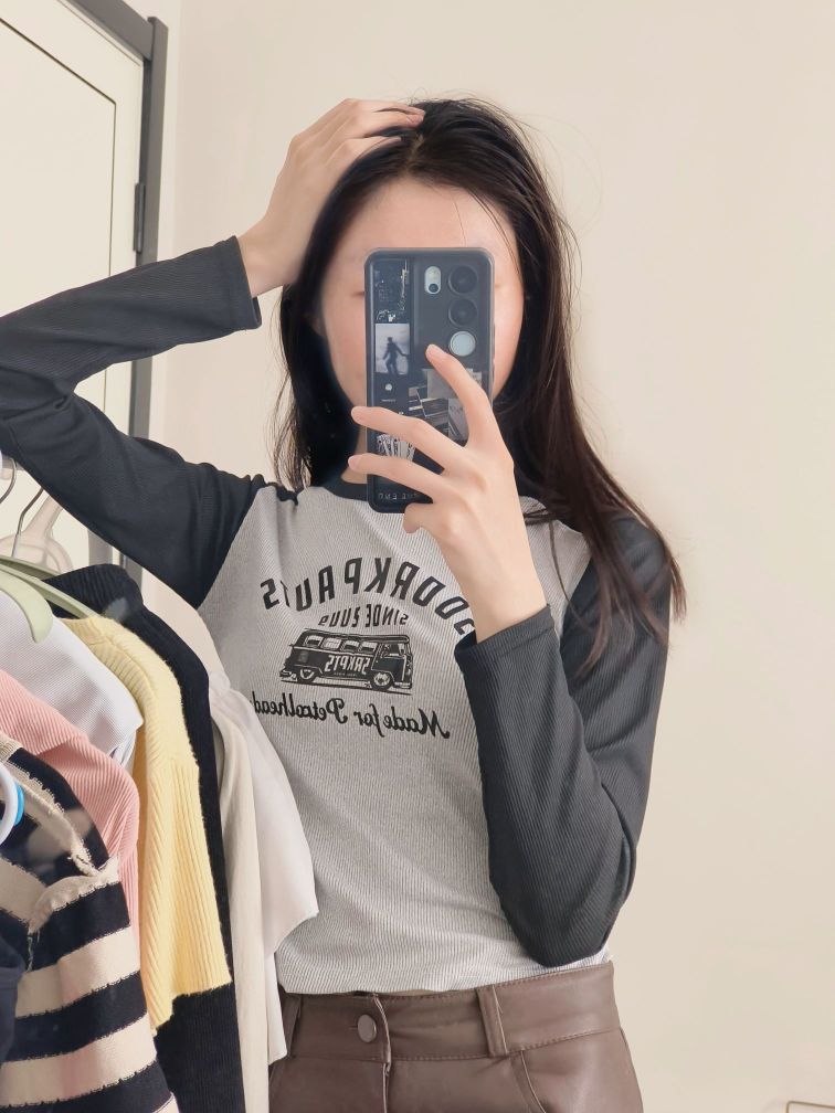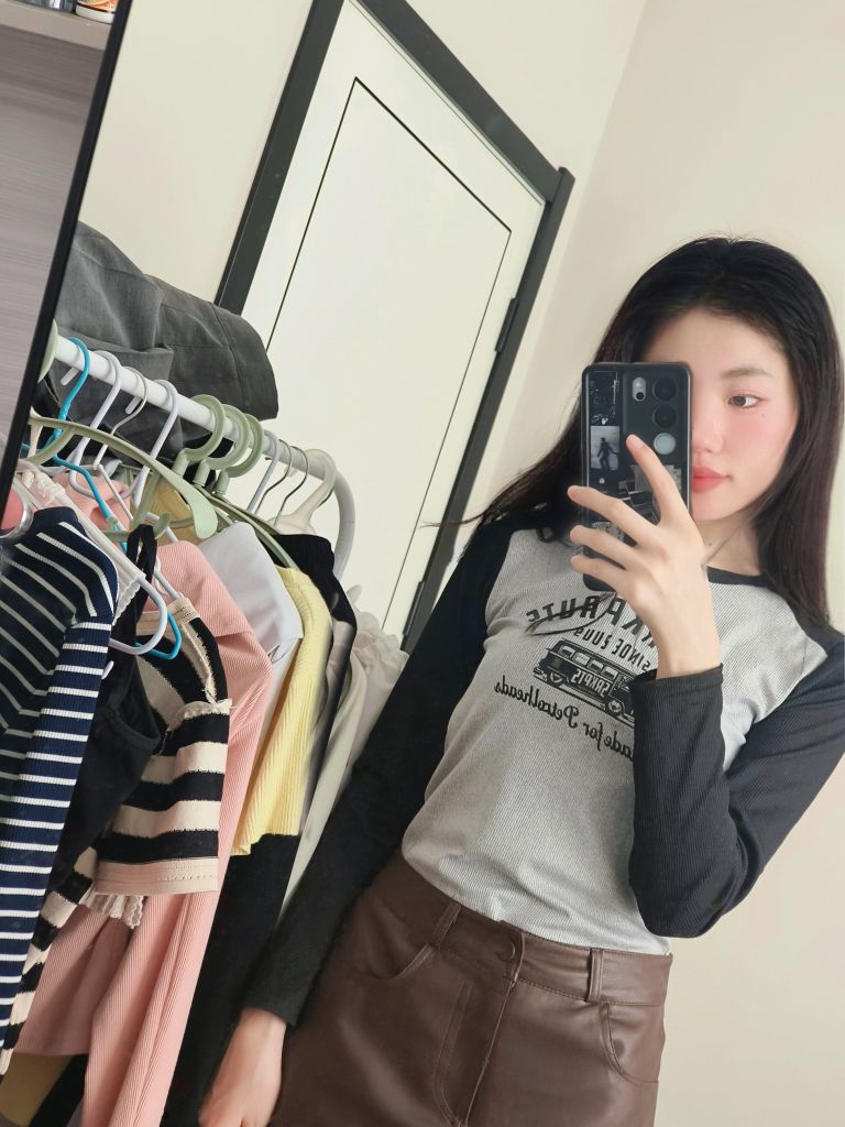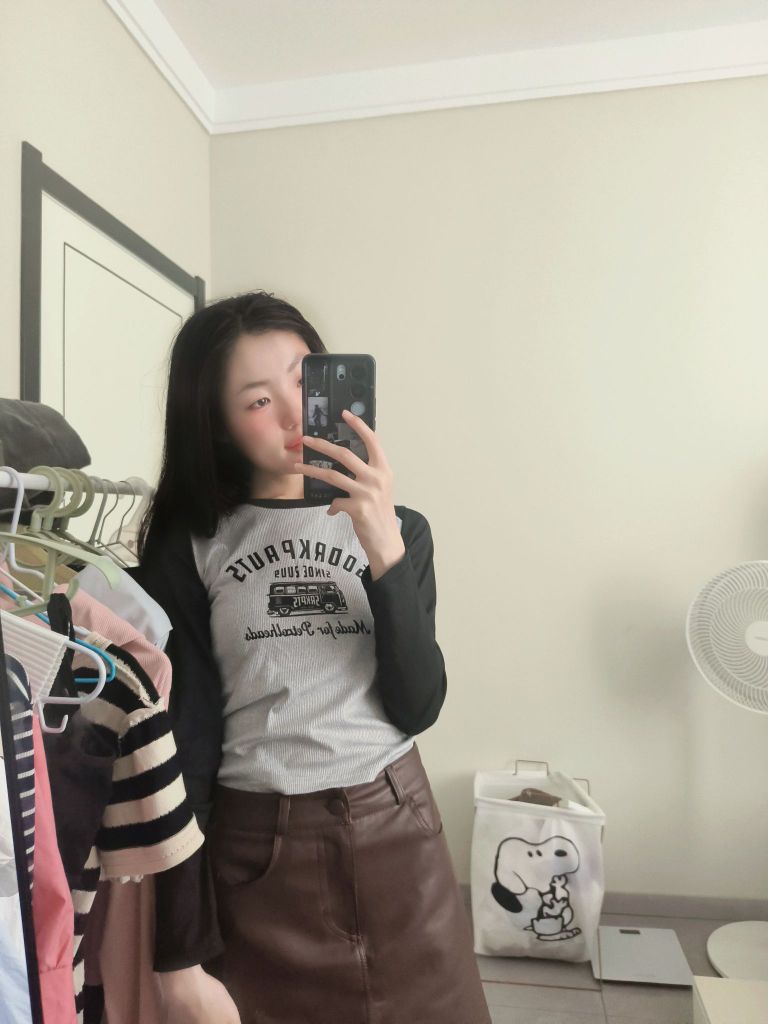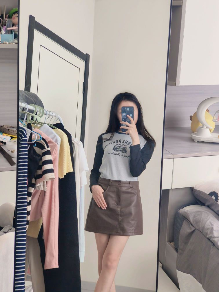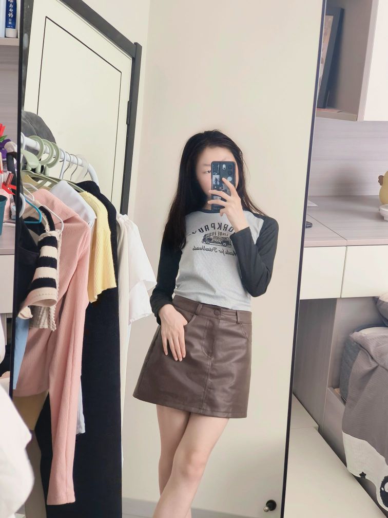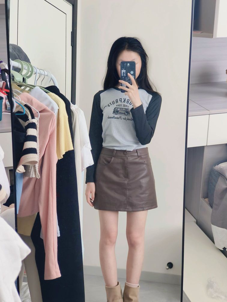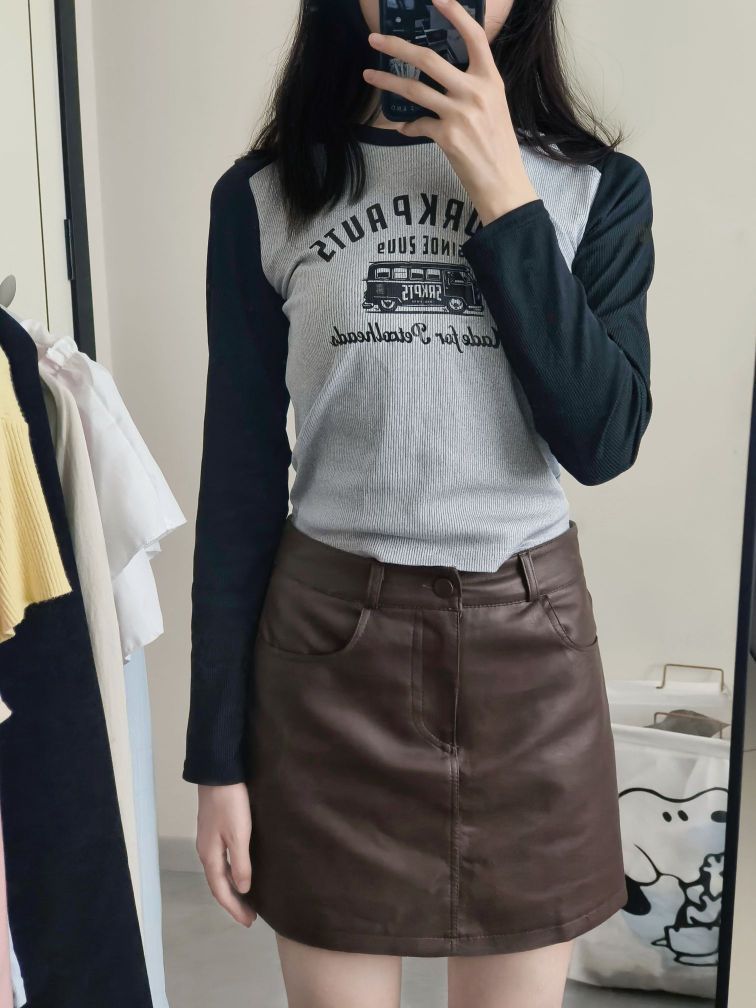 分享今日份日常穿搭✨ 浅灰拼黑色插肩袖上衣,复古感拉满的印花图案,打破单调,又带着些美式校园的松弛感,修身的版型把身材线条衬得刚好~ 搭配这条深棕色小皮裙,A字版型对各种腿型都很友好,利落又显气质,走路带风的飒爽感拿捏🤏 日常出街、和朋友小聚穿都很合适,轻松营造随性又时髦的氛围,舒服自在还好看,这一套谁穿谁爱上💫 生活里的小美好,从找到一套喜欢的穿搭开始~
