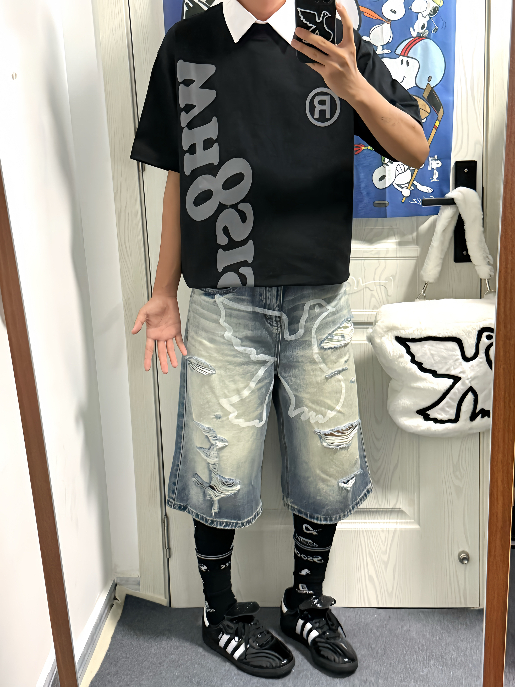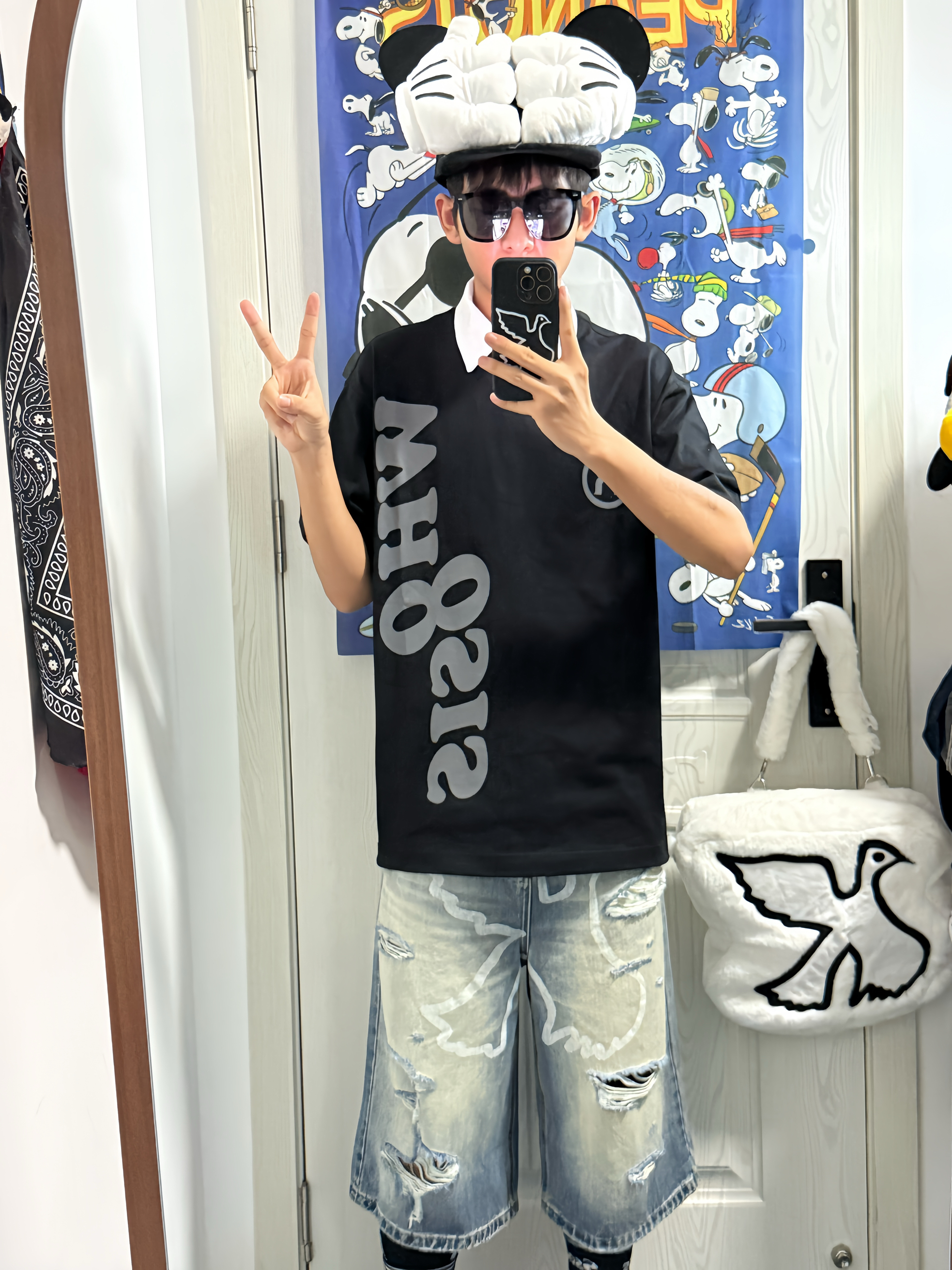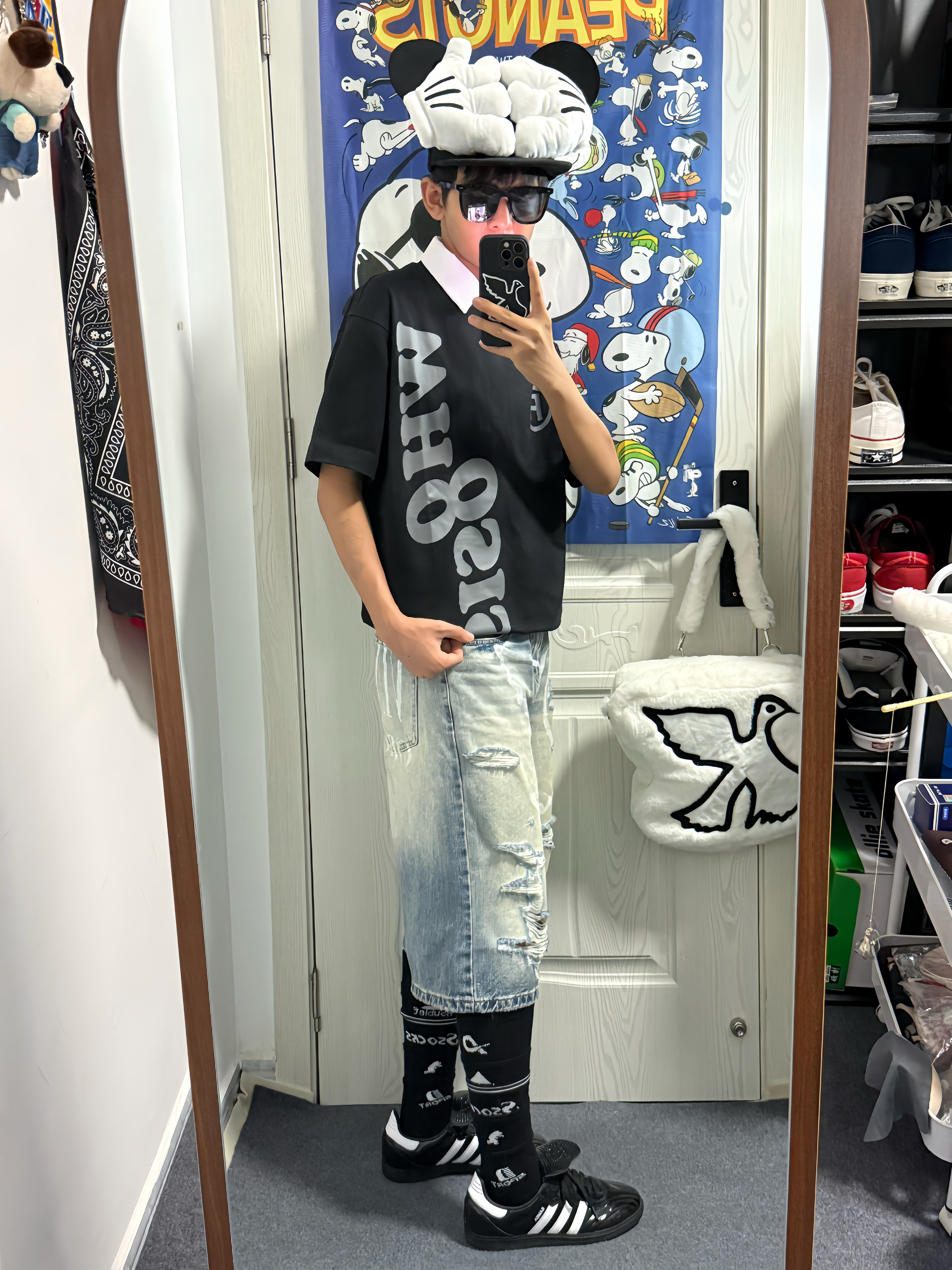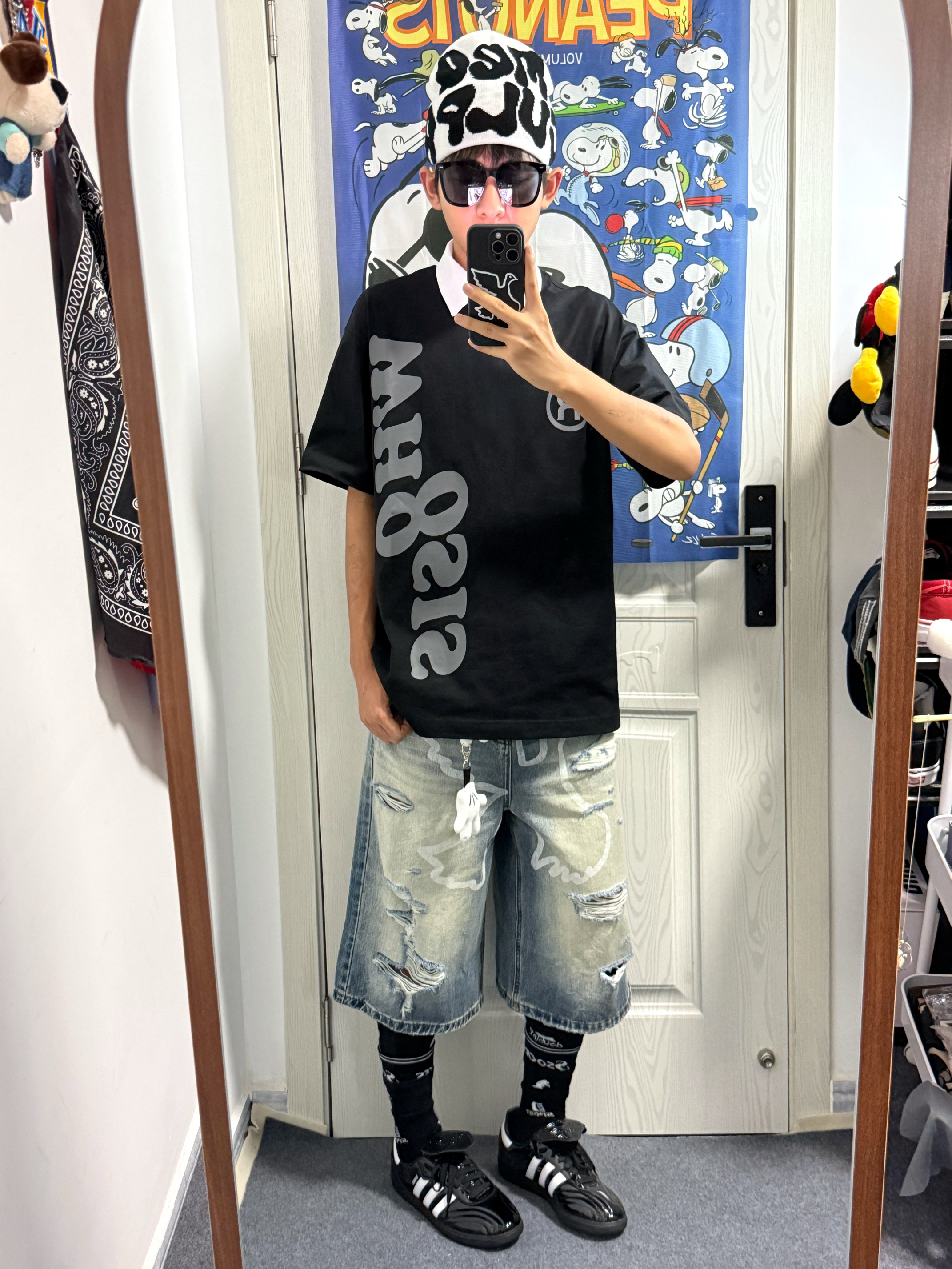 👀/今天穿的是 WHOOSIS黑色竖排幻影Logo短袖😎 搭配浅蓝色📘破洞牛仔短裤 七分裤版型刚刚好🍉 脚上的是“王安宇”同款adidas Samba德训鞋🌟 皮面材质挺好打理 再搭一双白色长筒袜⚽️ 轻松拿捏美式少年感🤓