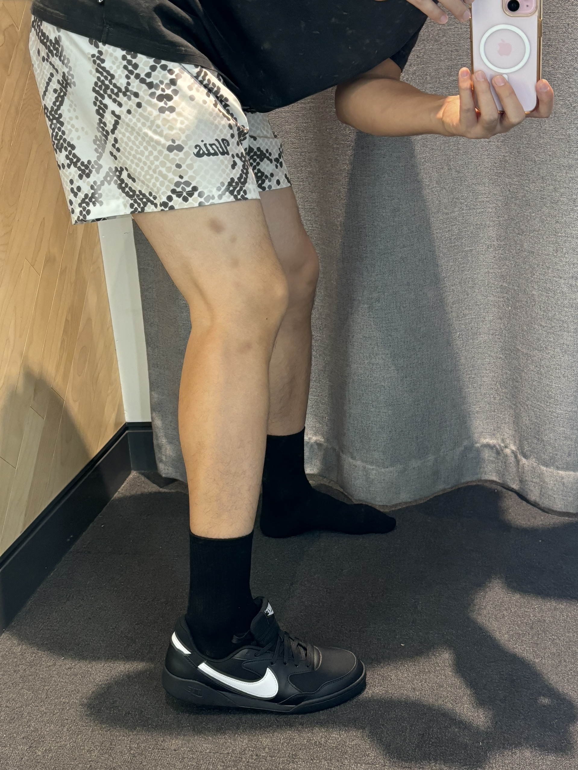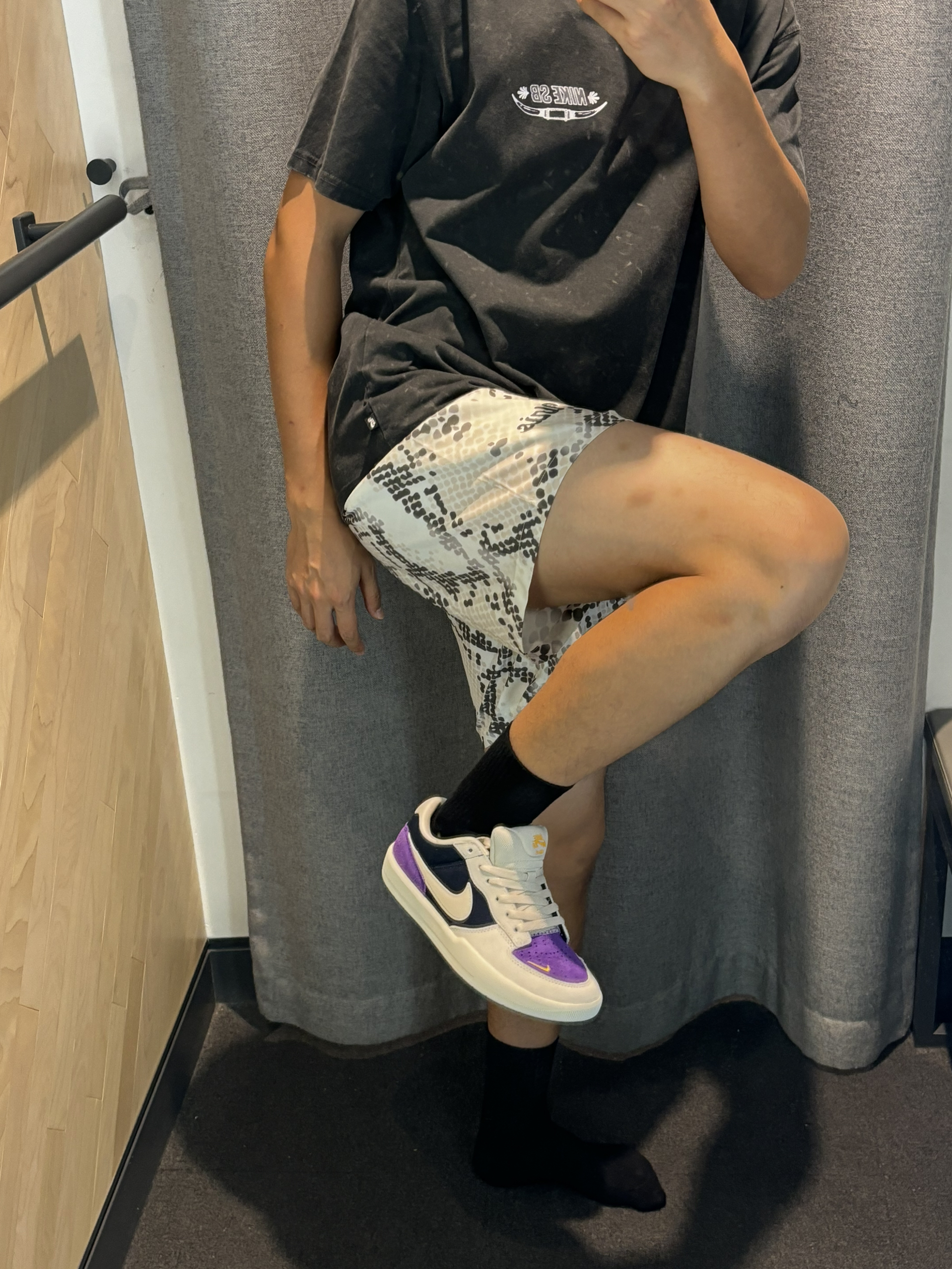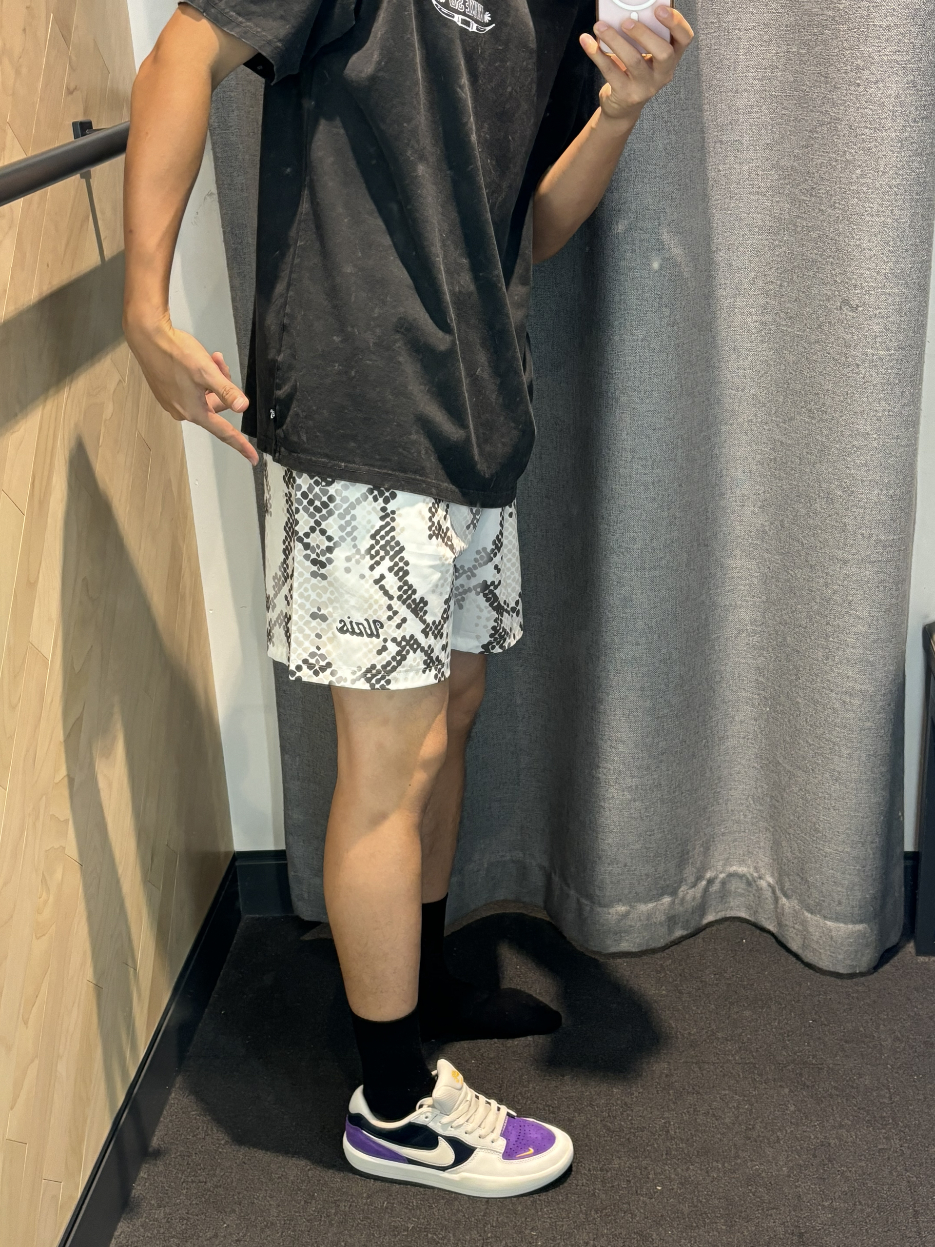 #这双没有班味 #海岛出片穿搭 #不同体型男生穿搭 #明星多巴胺私服大公开 #热夏必备通勤装 这一身搭配直接去除你的浓厚的班味 现在我指的是包括学生啊 也可以尝试着两套 黑色带一点磨砂质感的短袖 蛇纹四分裤 白紫色和棕色的薄底耐克鞋 今年就很流行这种薄底鞋搭配短裤 很有街头感,班味直接为0