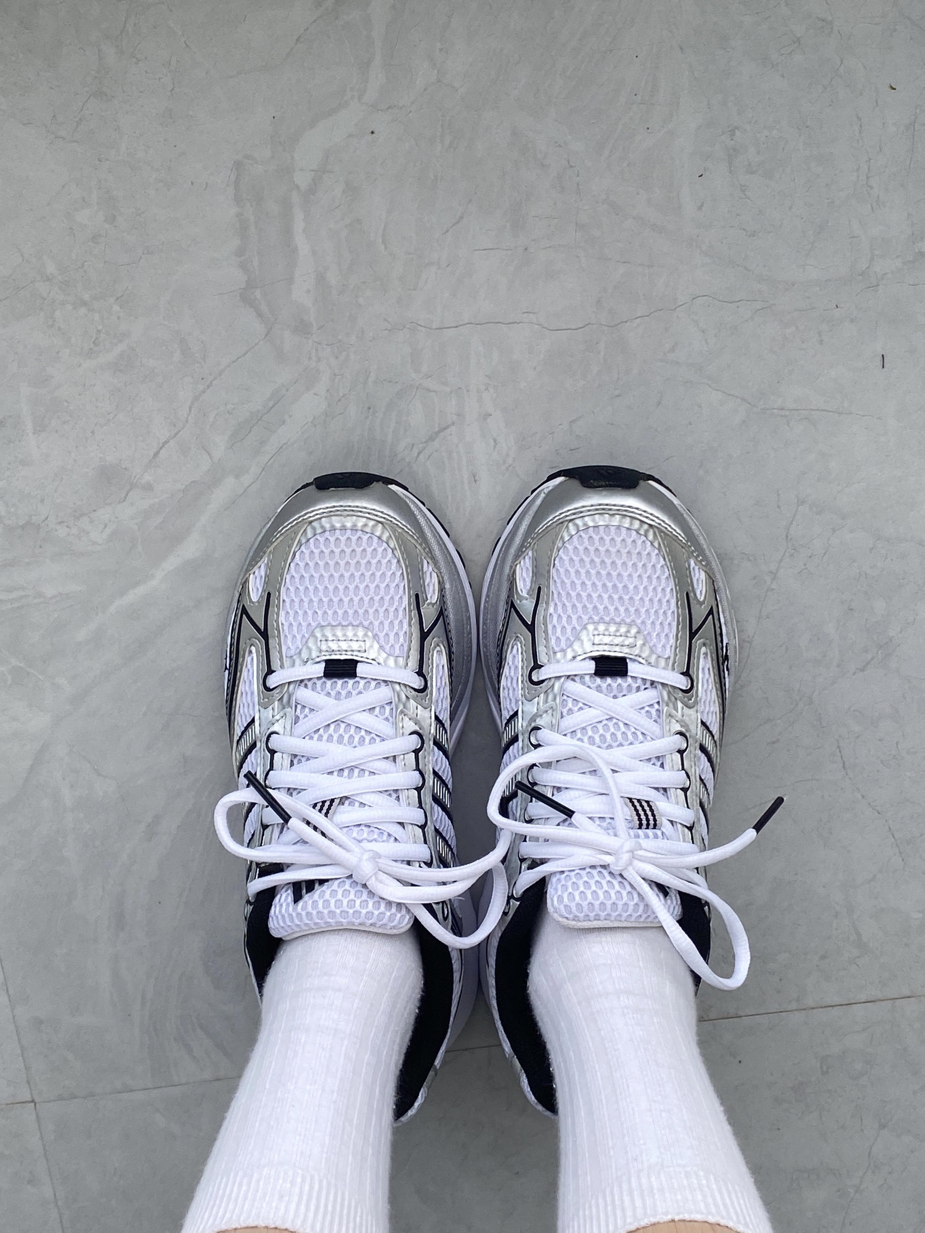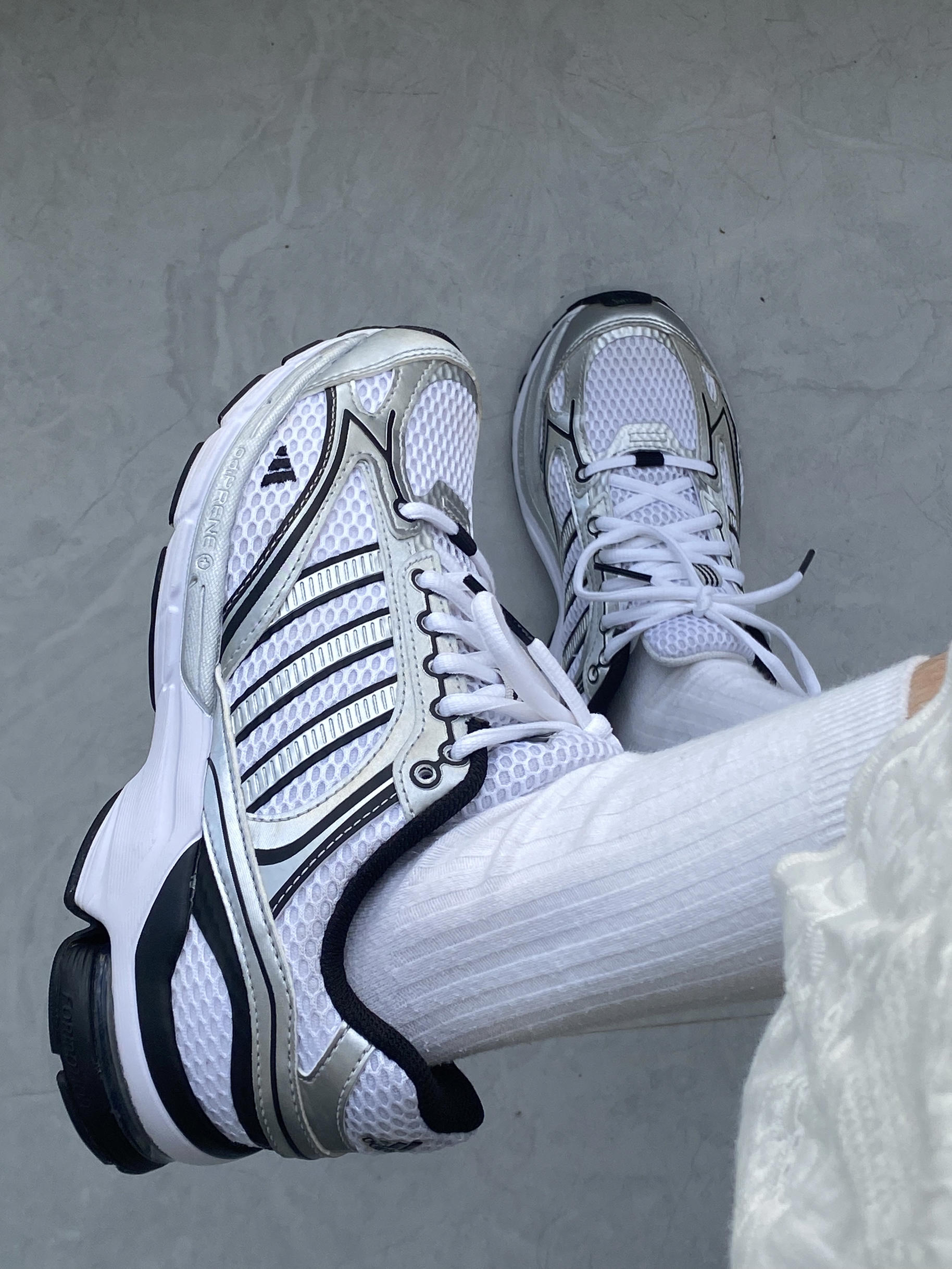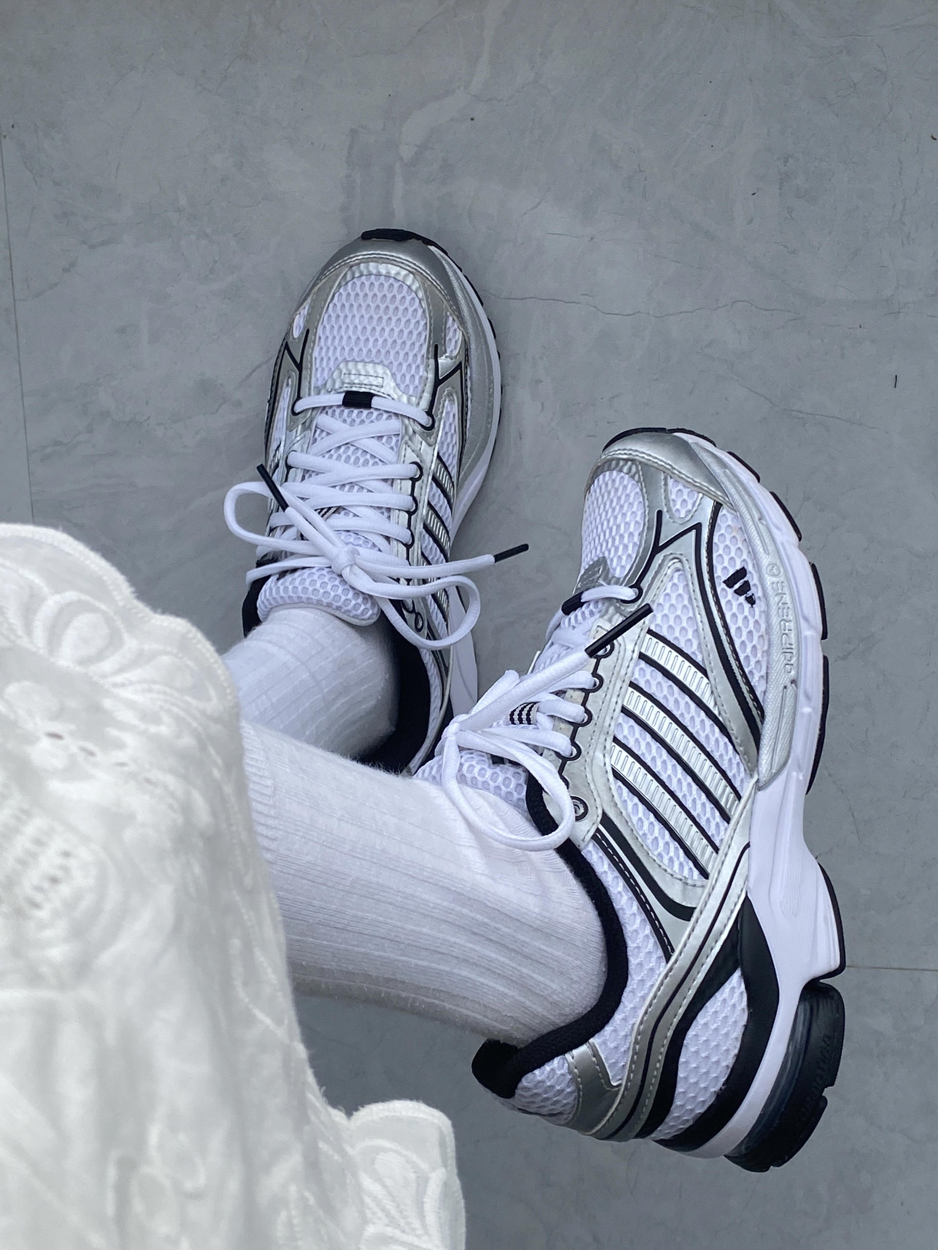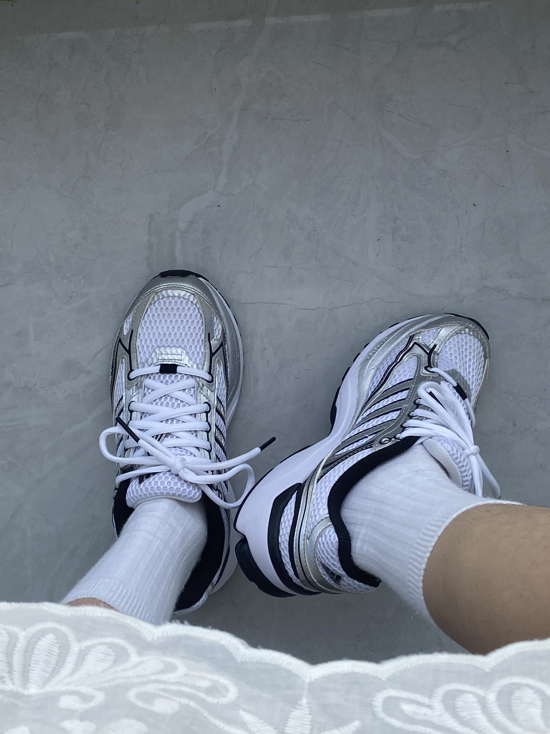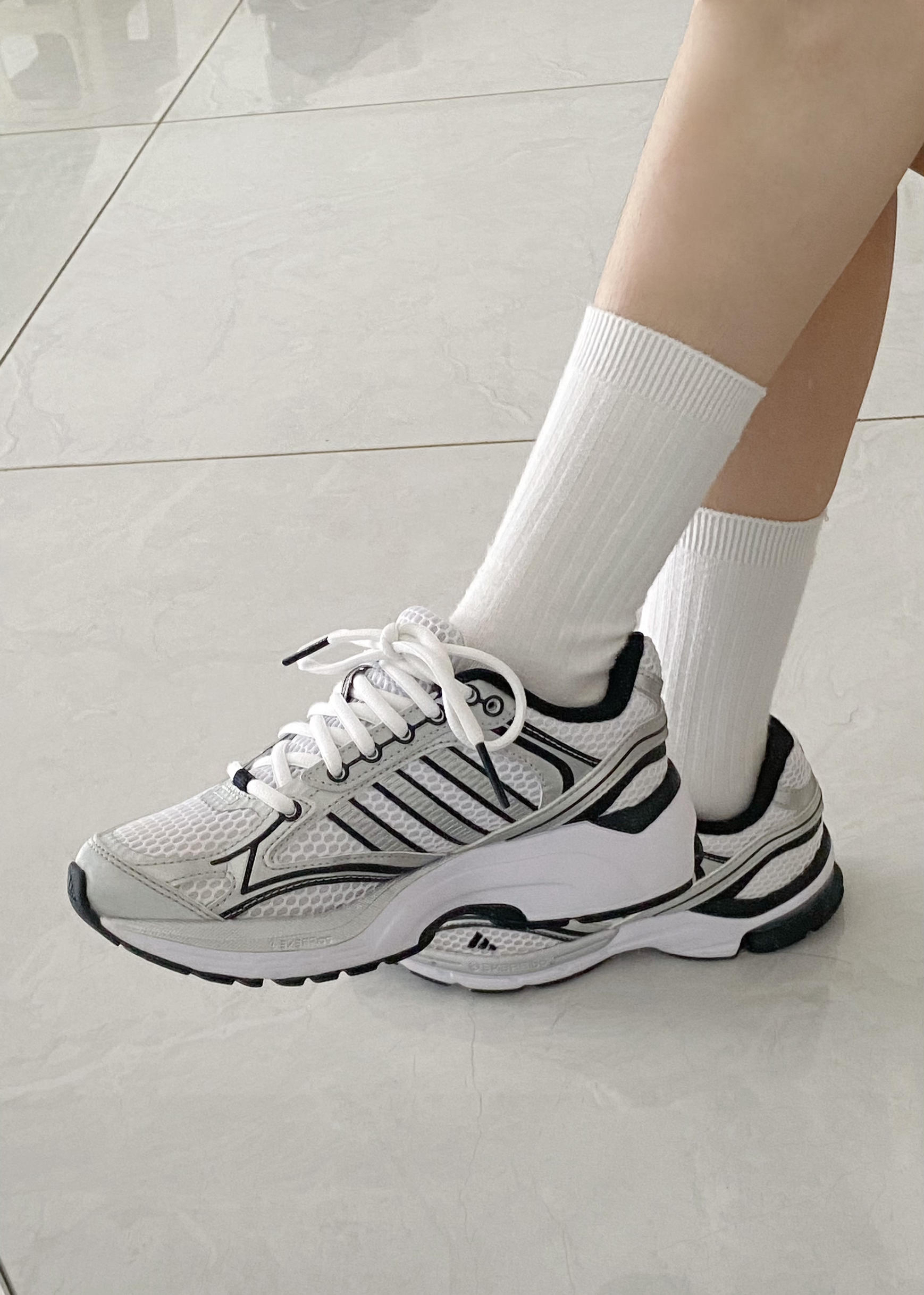 已经穿了半年了,还是好喜欢😍 这双阿迪达斯鞋子采用透气网面材质,日常通勤或运动时穿着都很舒适,上脚舒适,鞋底很软,走路久了也不累脚,还带着一点增高效果,真的是小个子女生的福利 黑白银配色真的好高级,日常很好搭配,我一般会搭配白色短裙,还会搭配牛仔裤,或者白色裤子,很百搭,随便搭配都很好看!