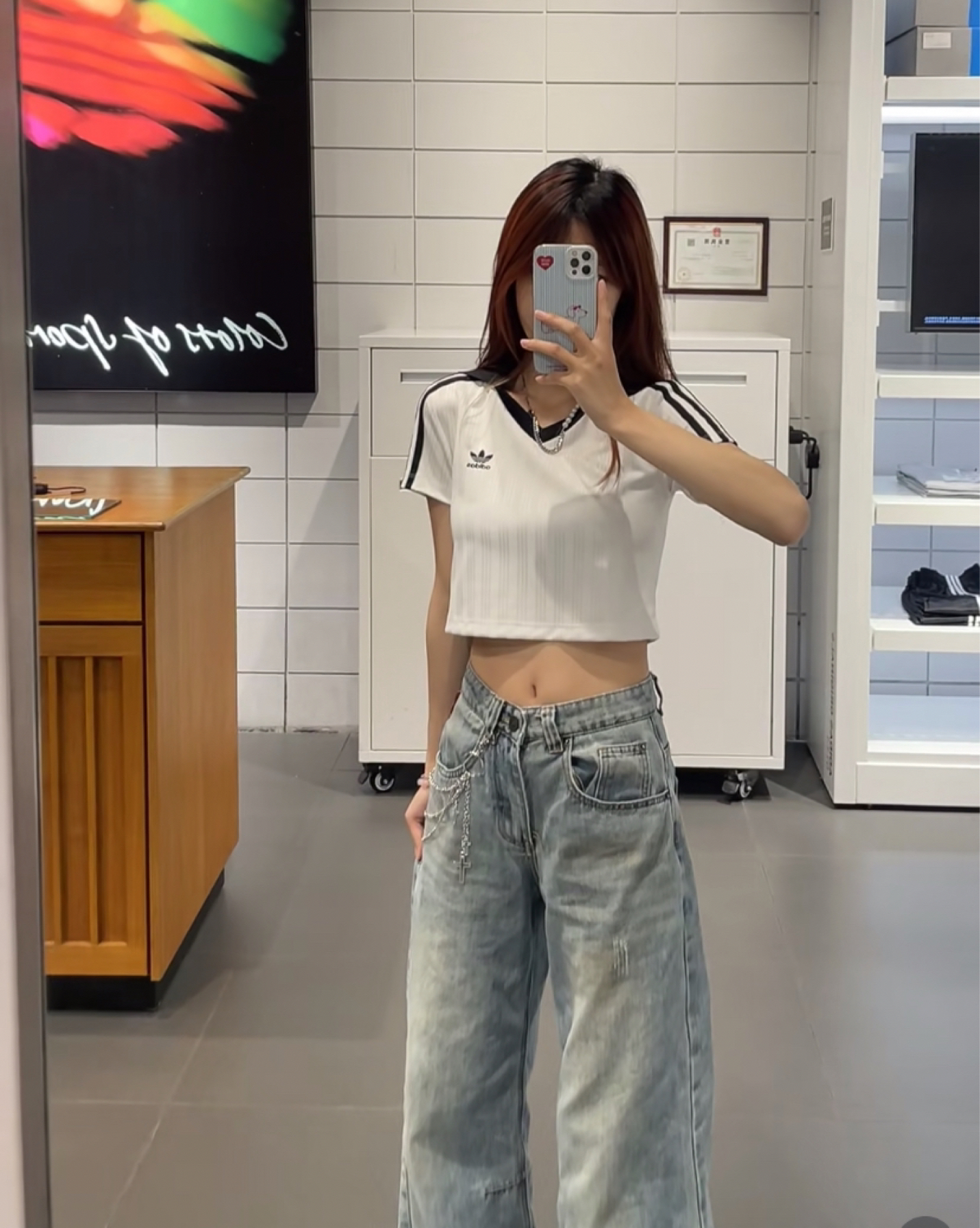 ▪️ 女明星私服get✅娜比同款短袖Polo衫 v领设计显瘦又带点小性感! ▪️ 短款版型拉高腰线,搭配高腰裤/裙秒变大长腿✨ ▪️ 经典三叶草logo简约不简单 复古运动风直接拉满~ ▪️ 透气面料 夏天穿完全不闷热 运动出街都超舒服!