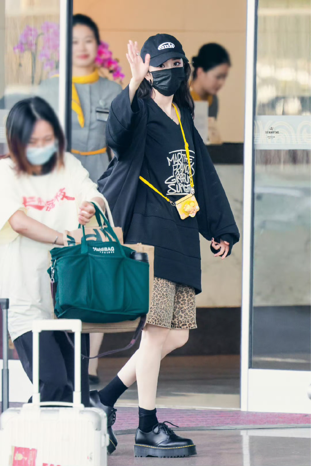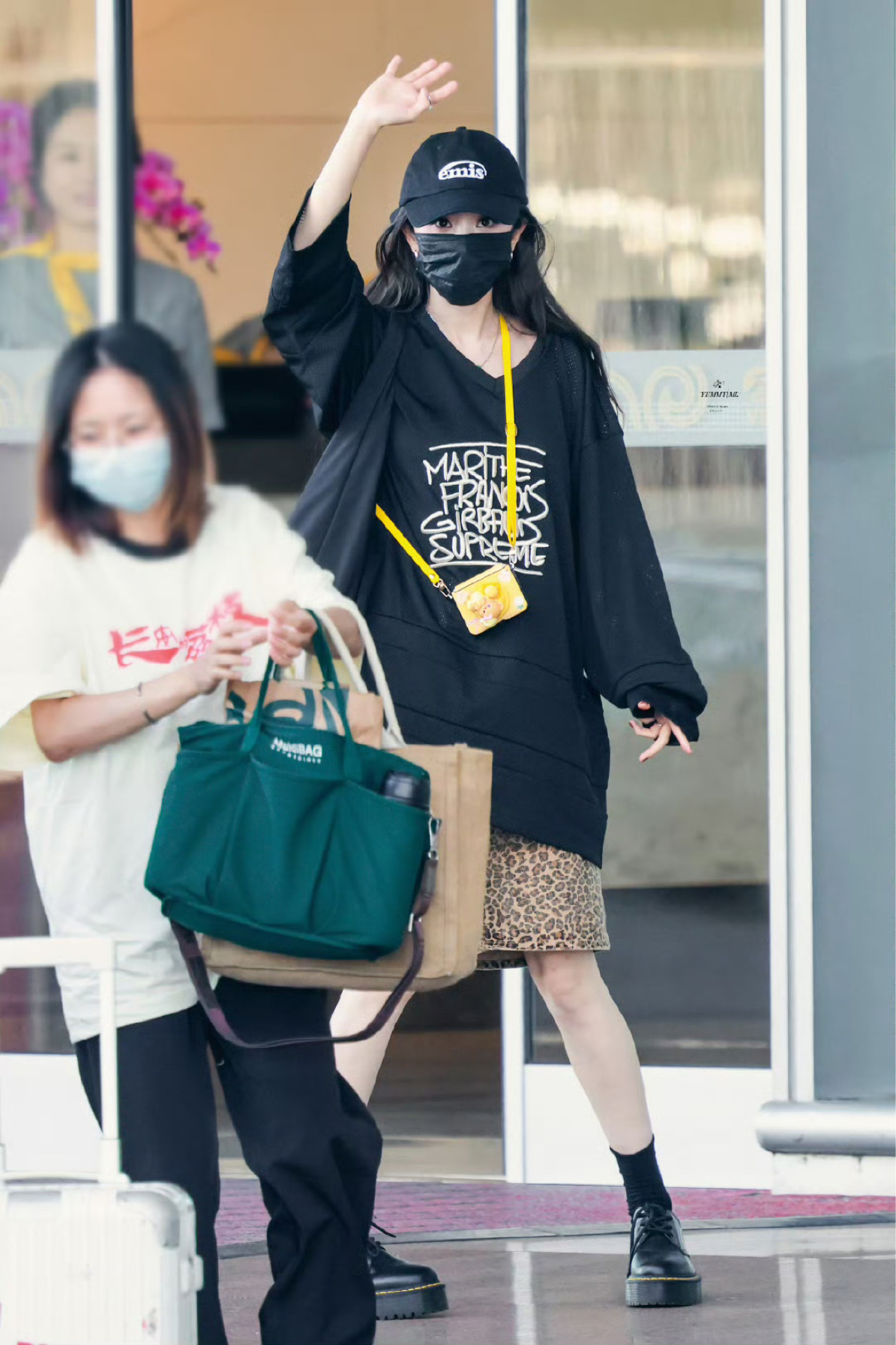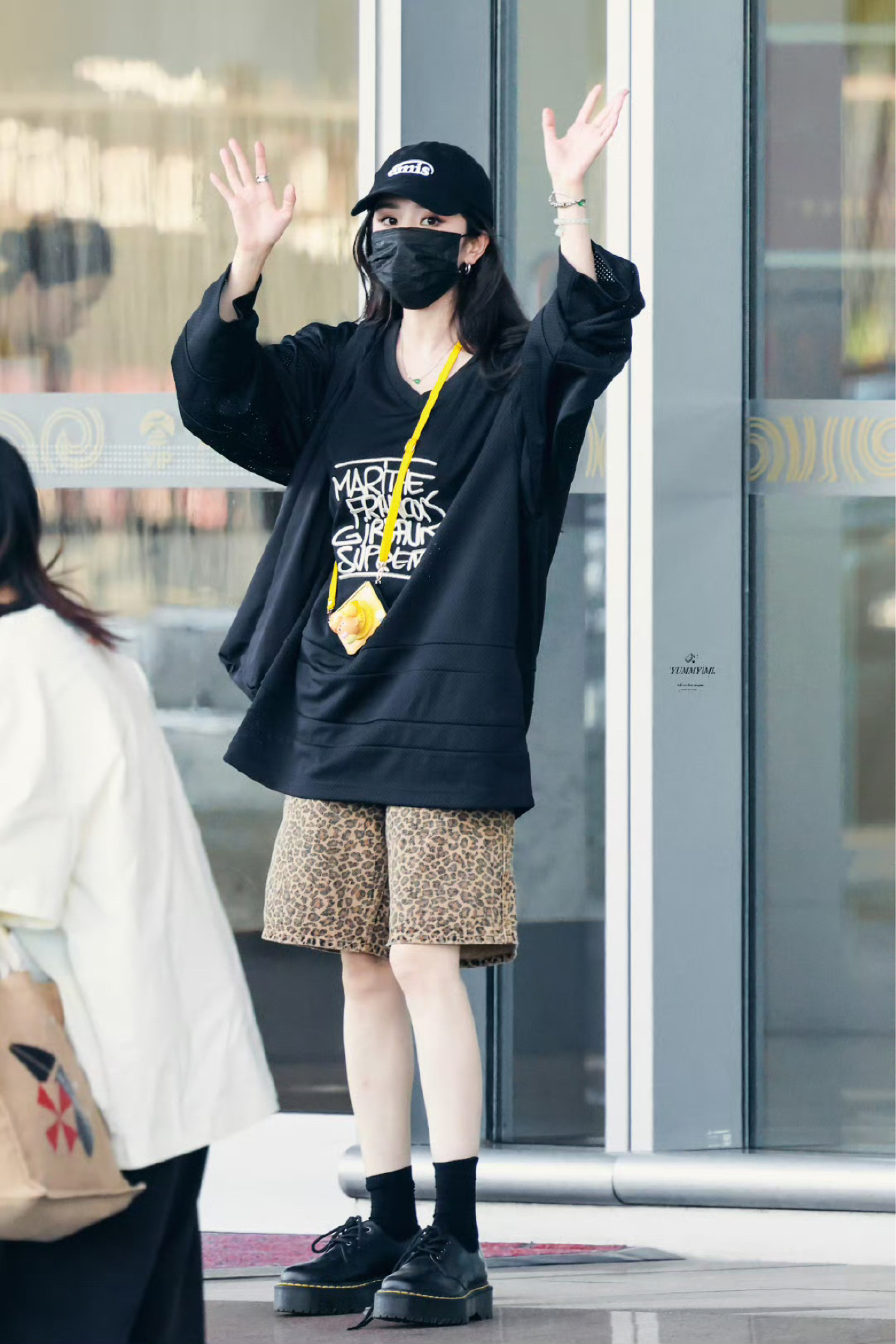 杨幂更新了7月17日机场私服,黑色T恤下搭五分五分豹纹短裤,下搭马丁靴,酷飒小幂! CR:@YUMMYMI杨幂 上衣: Supreme 裤子: Stussy 帽子: emis 包包: FILA FUSION