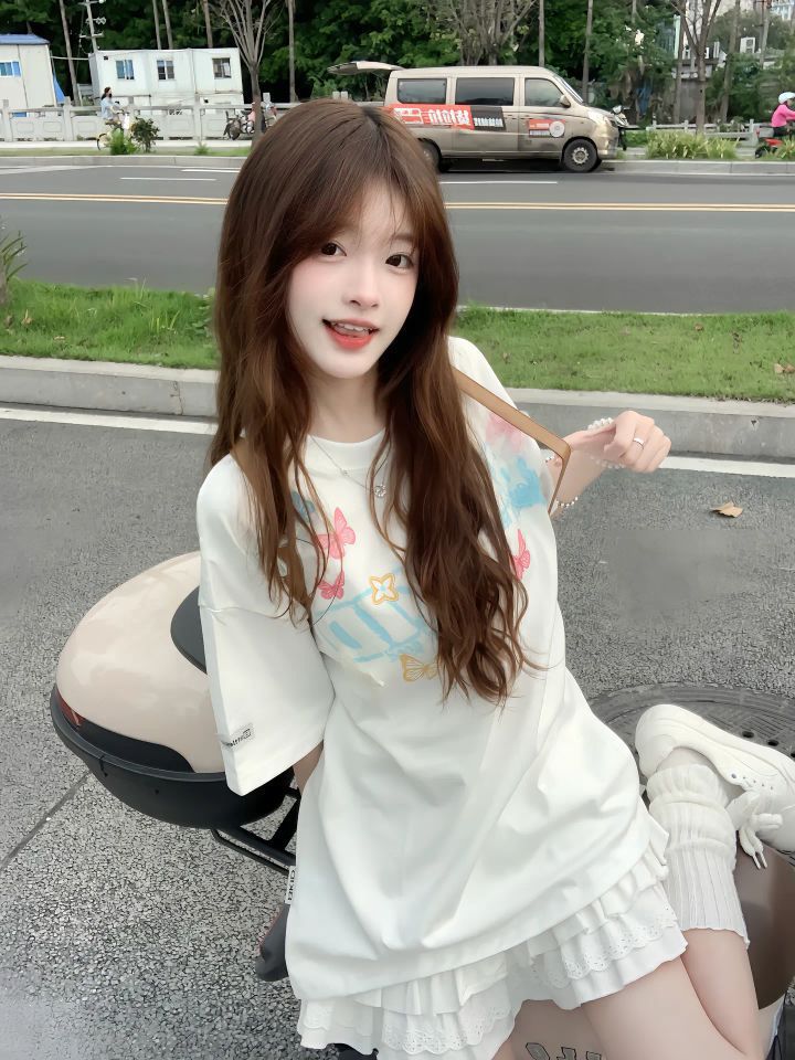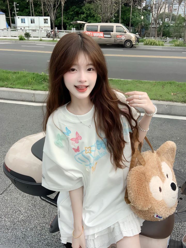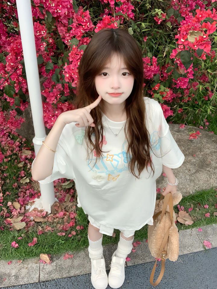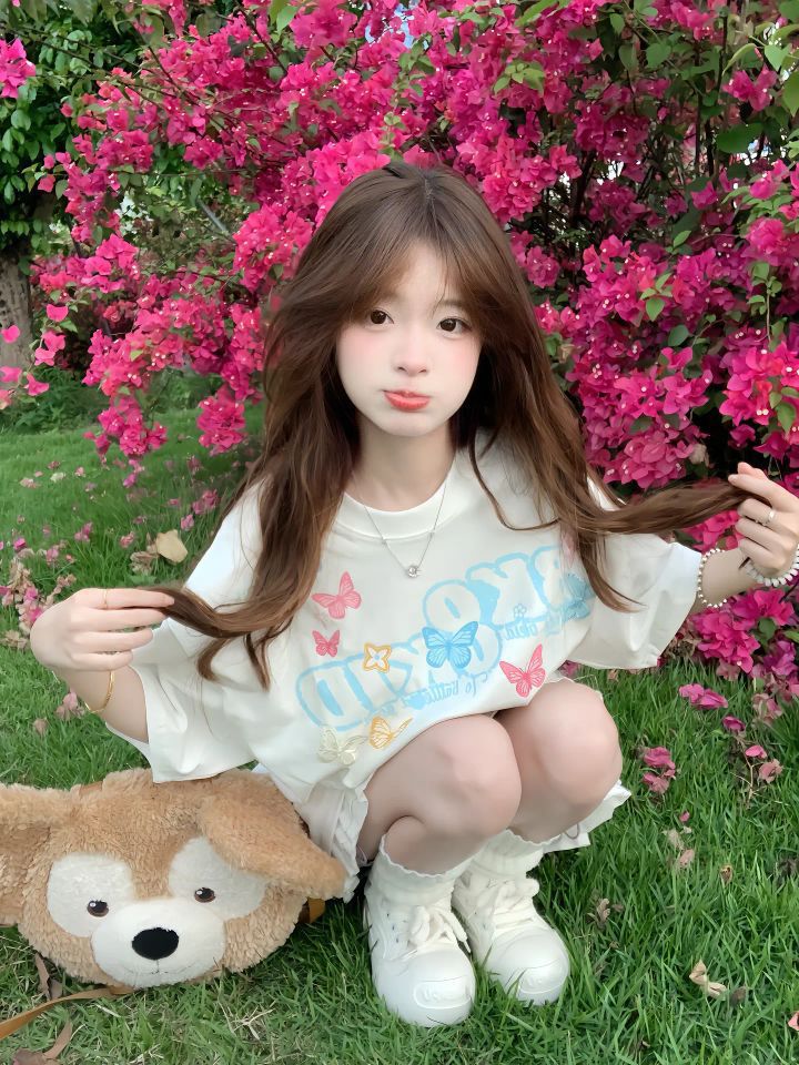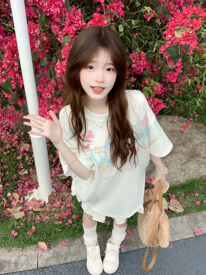 谁懂啊!夏日街头偶遇甜妹,被这件蝴蝶印花短袖狠狠拿捏 。奶呼呼的米白色调,自带温柔滤镜,宽松版型藏肉又随性,仿佛把慵懒松弛感穿在了身上~ 一、设计巧思,甜酷氛围拉满 印花是灵魂!彩色蝴蝶错落分布,搭配清新字母,像是把春日花园的浪漫都印了上去 。不会过分花哨,却又藏着满满的小心机,甜妹感直线飙升~下摆不经意露出点小裙摆,若隐若现的俏皮,谁穿谁是人间水蜜桃 ! 二、面料宝藏,舒适到不...