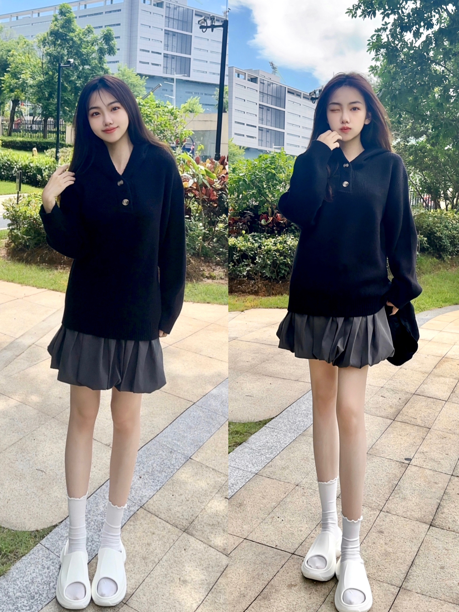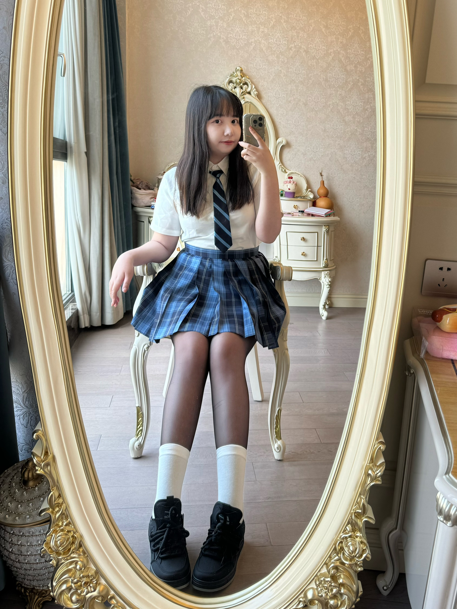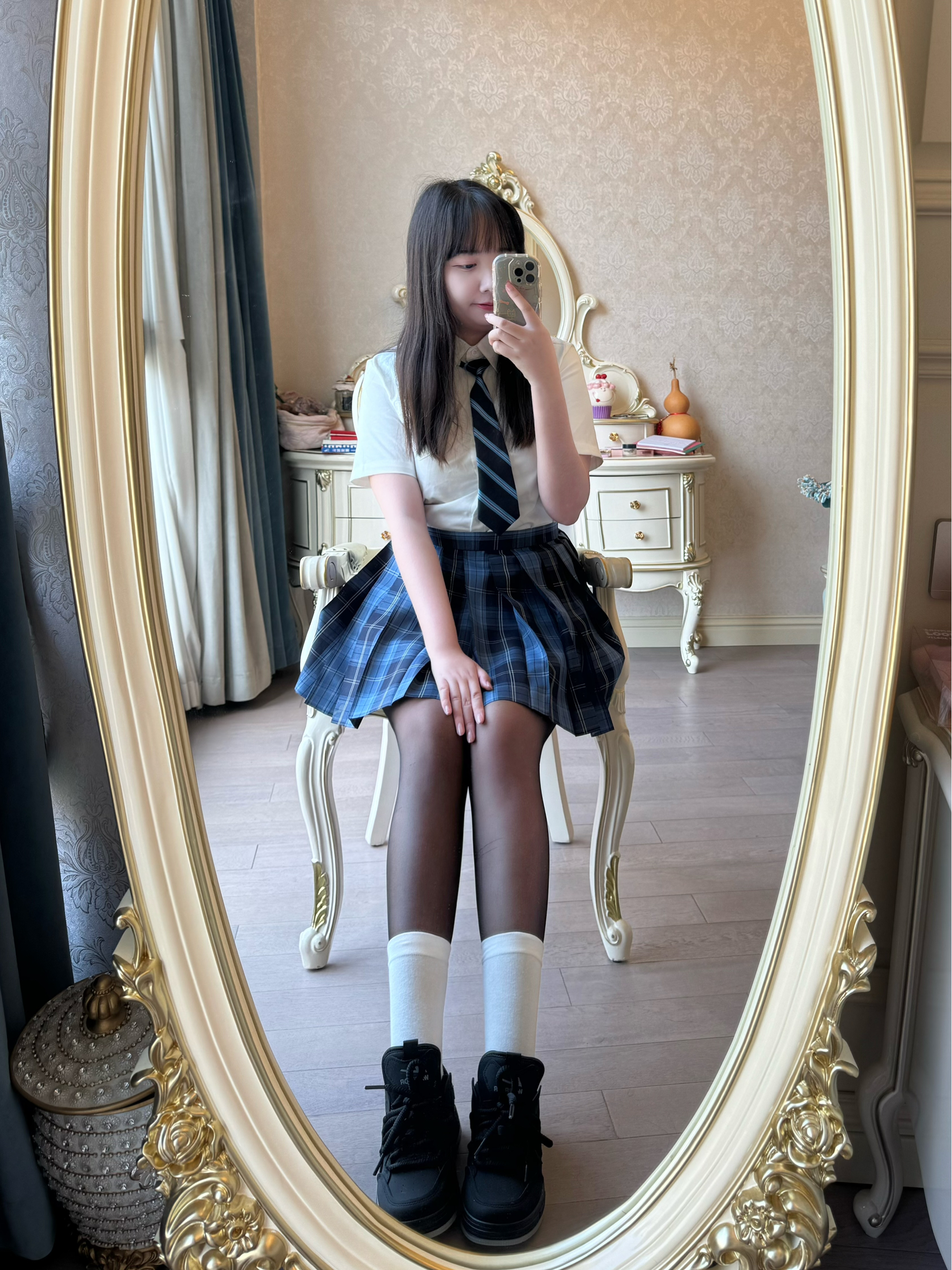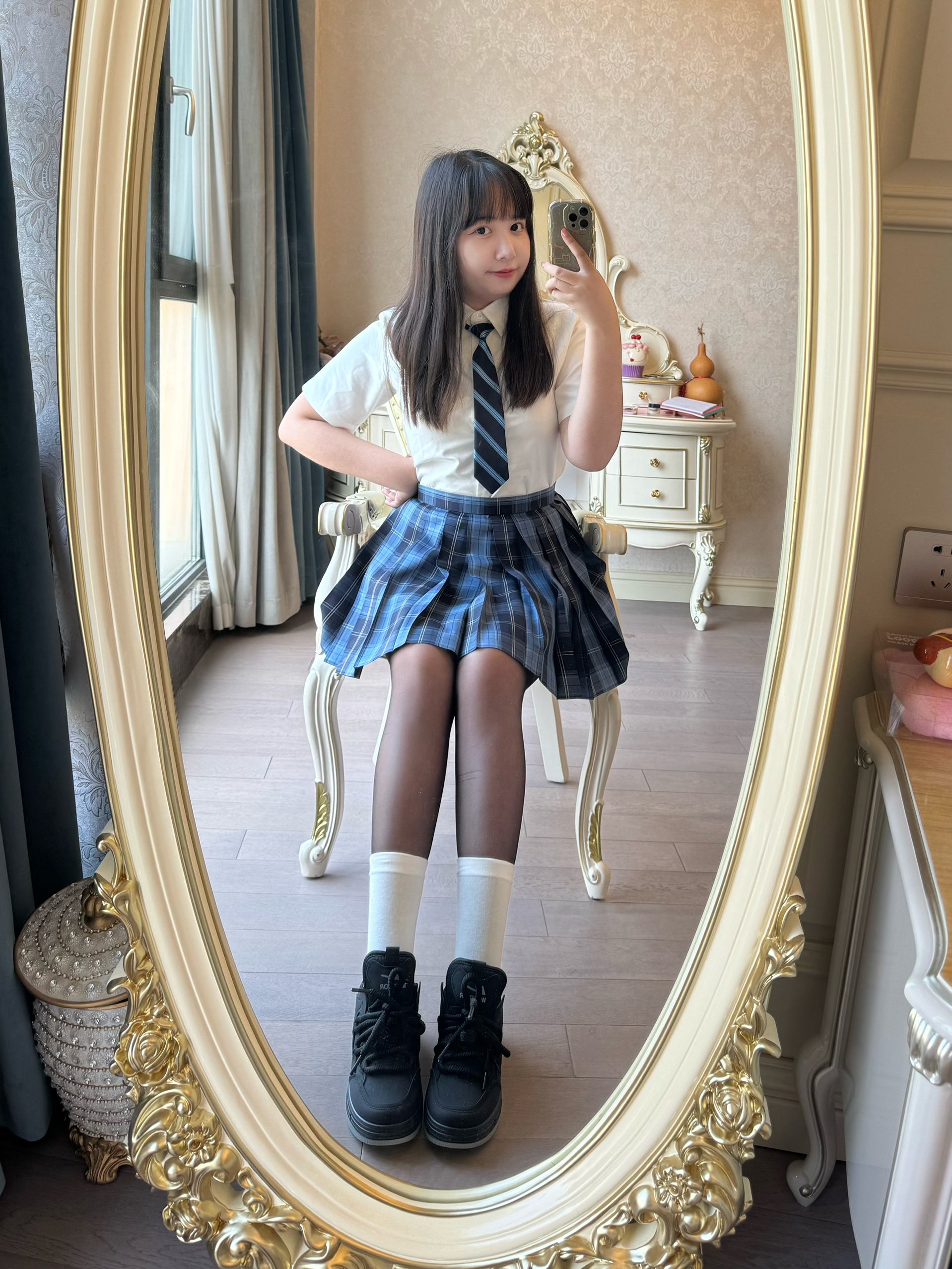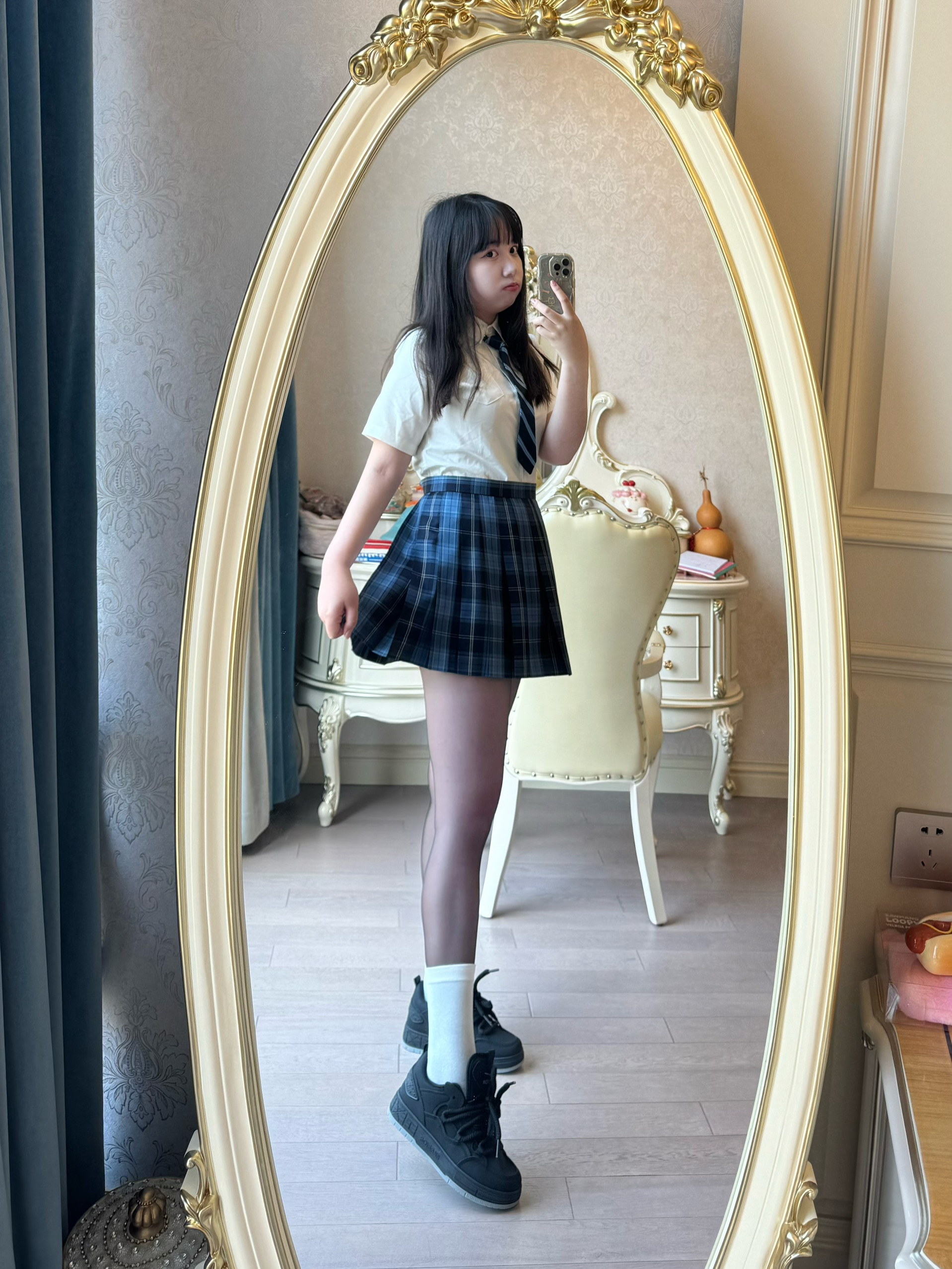 蓝色jk格裙yyds!领带更添学院风,我爱啦!今日OOTD超级飒爽!