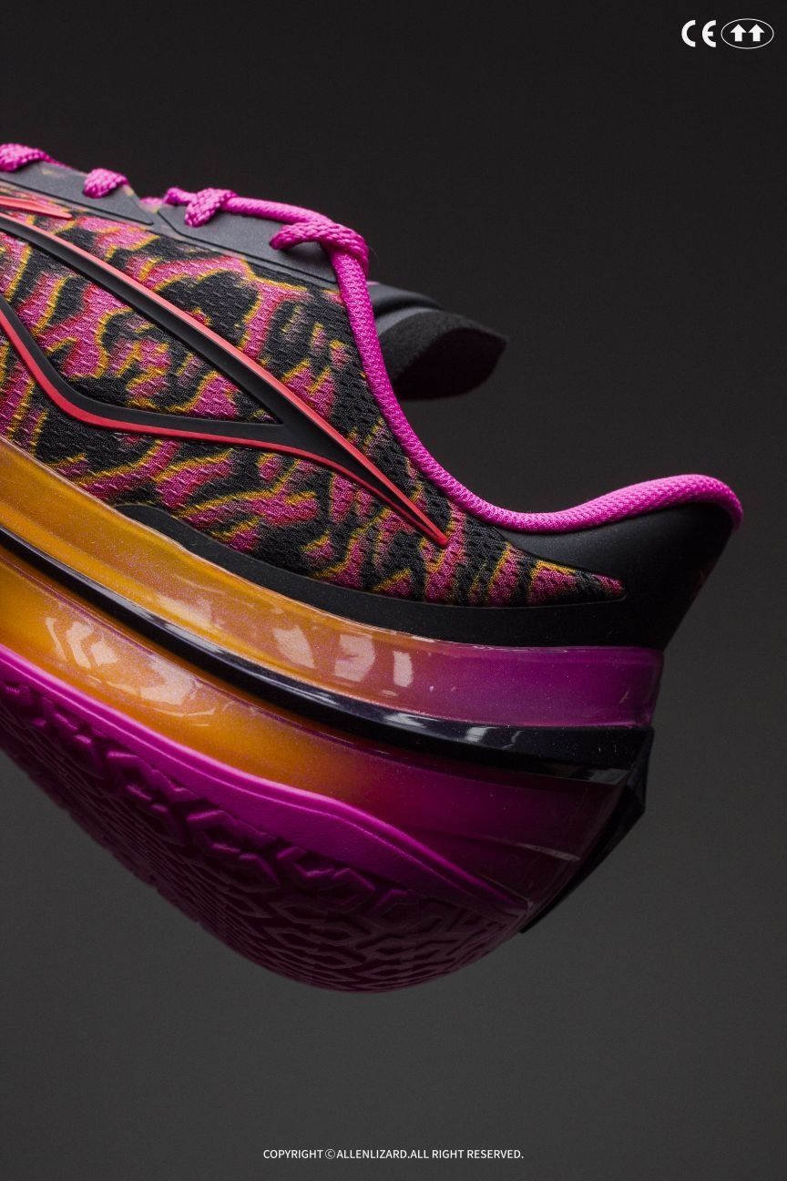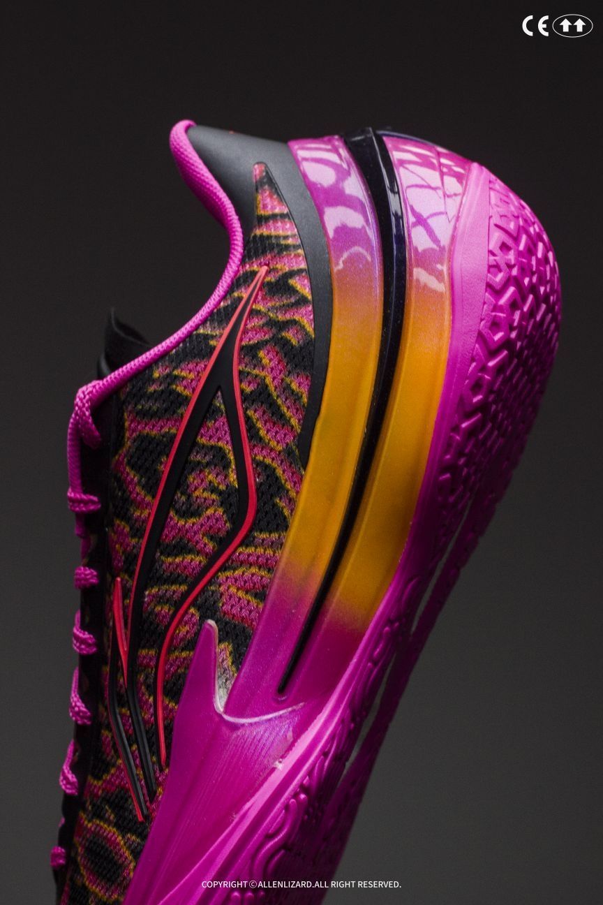 李宁这次把渐变玩到爽了!中底TPU从火焰橙过渡到芭比粉,鞋面不规则裂纹像打翻的霓虹颜料罐,上脚瞬间变身球场焦点✨ 说是“碎影”,我倒觉得像“幻焰蔷薇”——猛男粉里藏着暗黑裂纹,中段虎爪式TPU支撑推进感觉不错,配上全掌䨻+PEBAX聚核芯中底,静态上脚就已经感觉缓震明显但又不是一味的软,启动时又利落得像猛虎出闸🐅 六边形战士的粉装战靴!要骚气要性能?成年人当然是全都要!