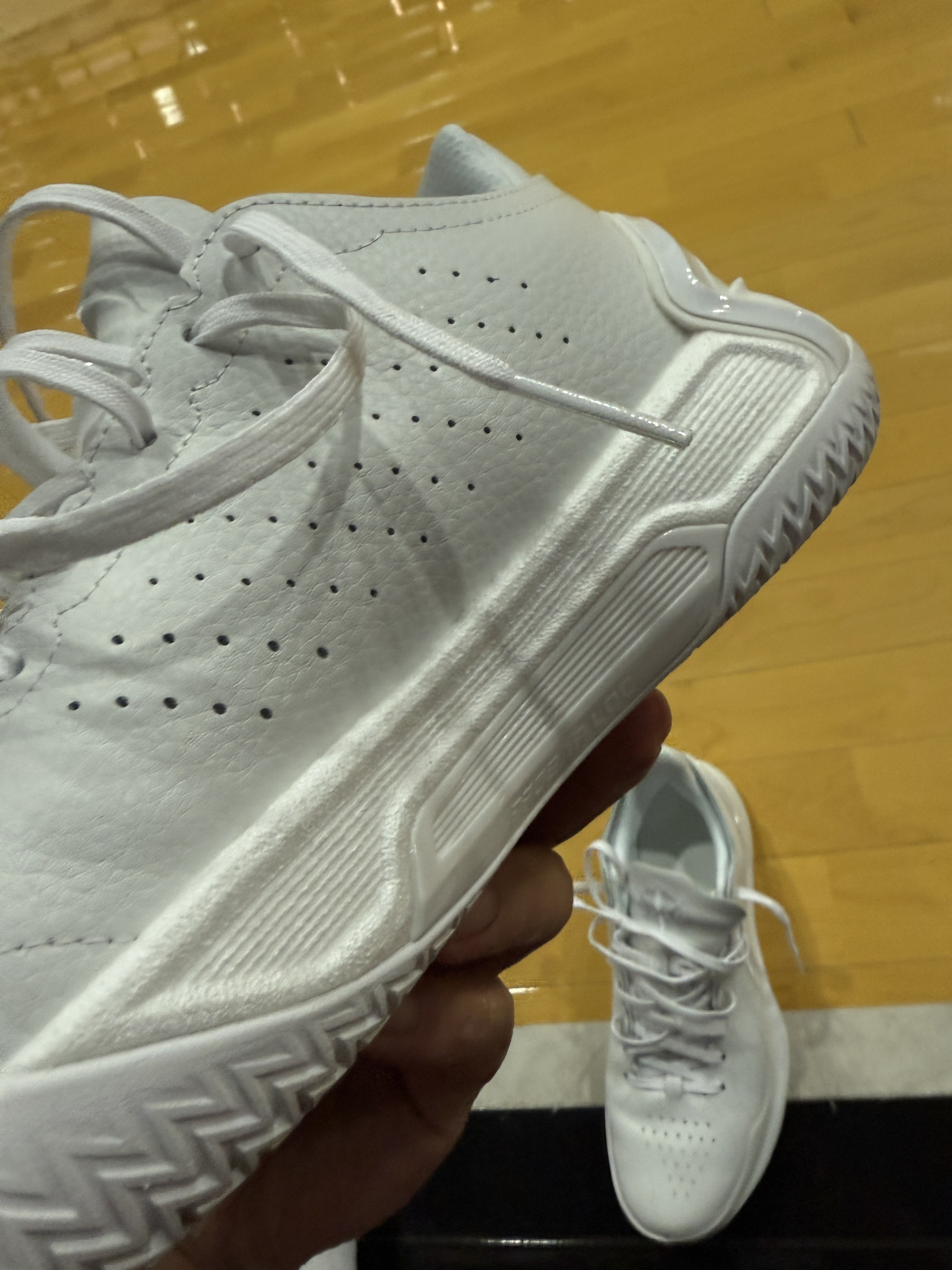 今天首战穿上了皮质版的利刃4v2 之前穿过网面的,感觉鞋底很软,足弓处内扣严重,所以就小黄鱼出了。 不过对鞋子的外型还是非常喜欢,又买了皮质版。 没想到,万万没想到,真的是两双鞋哦。 首先,皮质版的鞋面贴合度更好,尤其是薄鞋舌,包裹性提升了一个级别。 第二,皮质版的中底缓震更韧,一点不泄力,并且足弓内侧支撑更好,也没有任何内扣感觉。 这两点提升,让鞋子确实有了质的飞跃。 但也有指标下降的,就是鞋身...