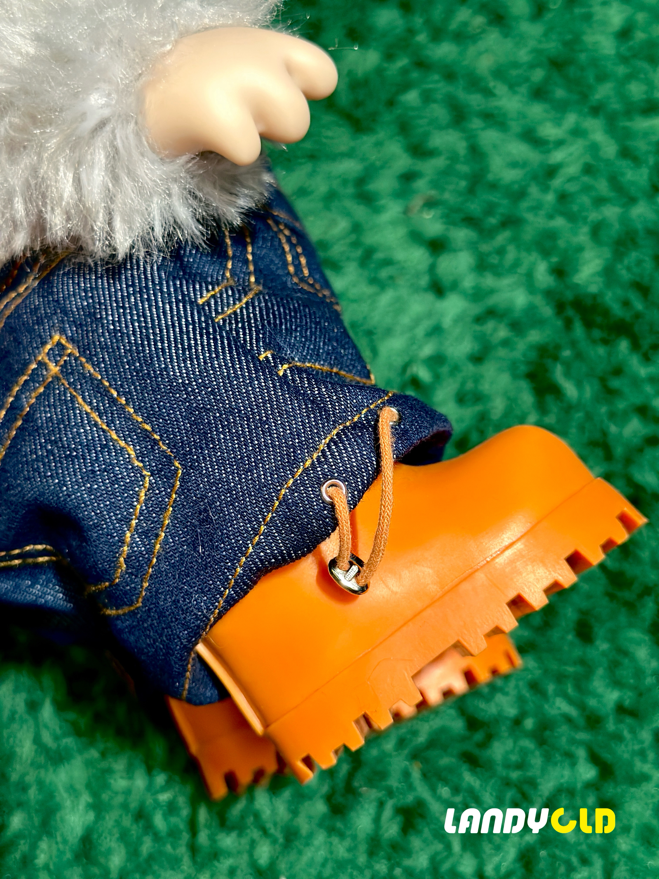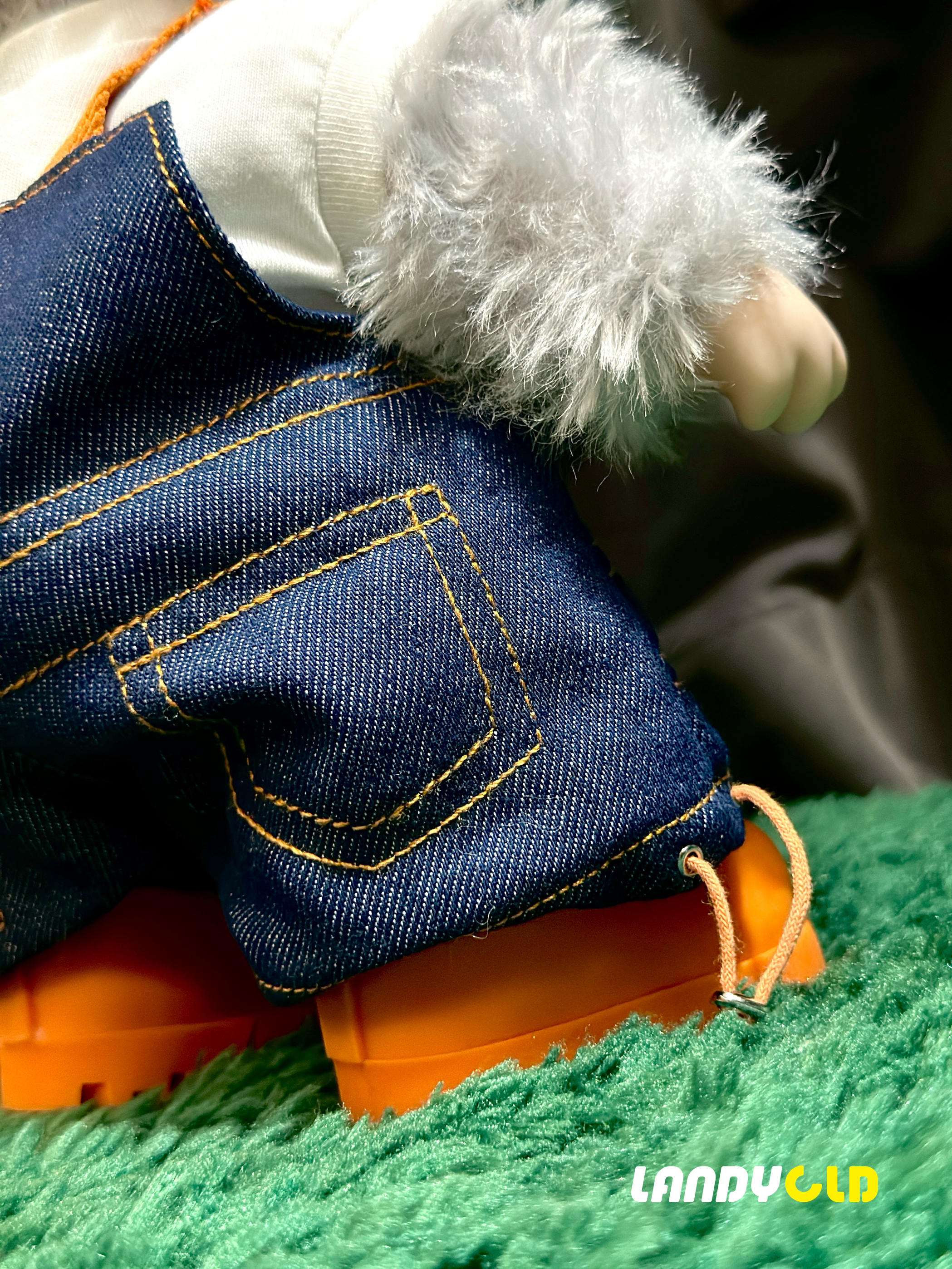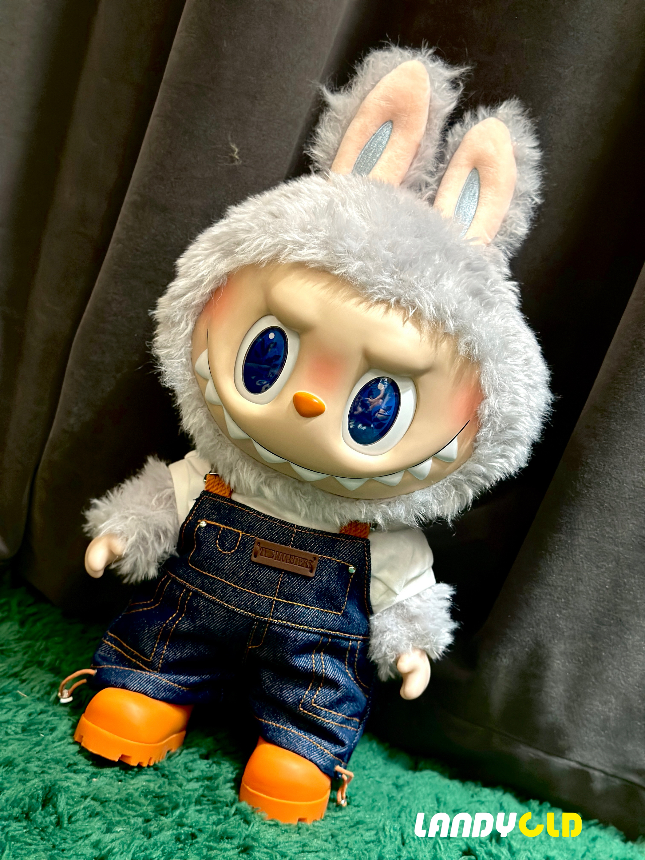这是近期入手的LABUBU的之一,他的外盒,也是我比较喜欢的,牛仔质感的外包装,挺好看。 第一个,就是他的渔夫帽,卡其色的渔夫帽, 第二个,就是他的牛仔背带裤,金属的扣带,口袋,胸前小吊牌,带拉链的T恤,有点小心意 第三个,是他那双橡胶的鞋,后面特地做了一个开口处理,也是为了更好的穿脱。