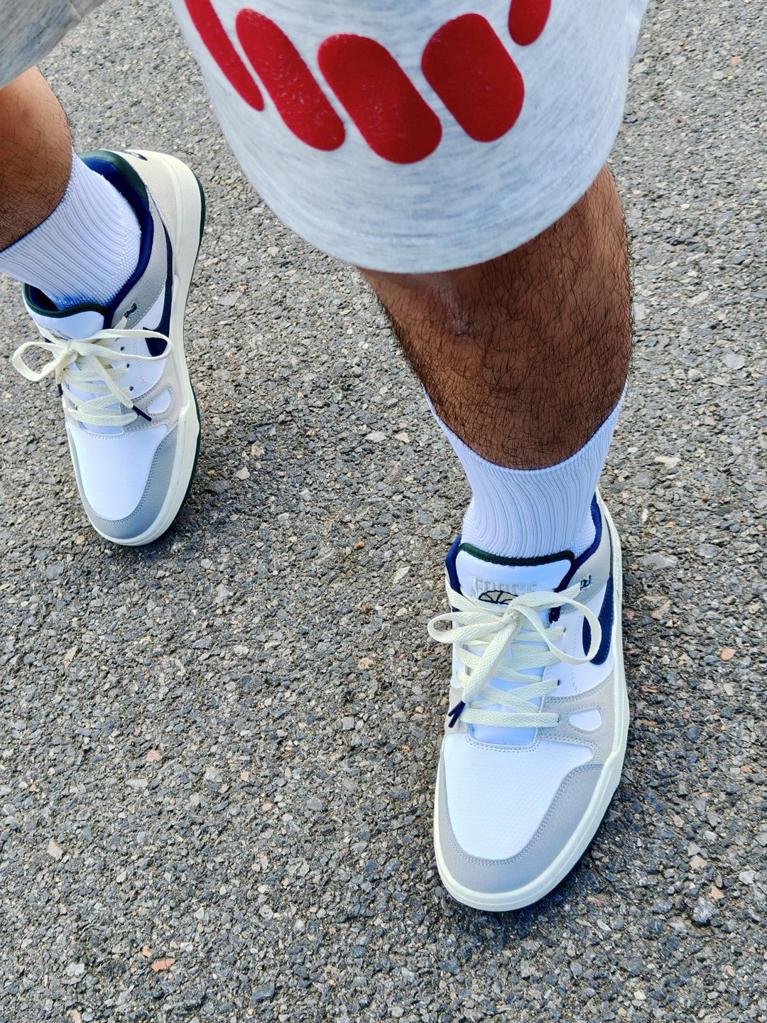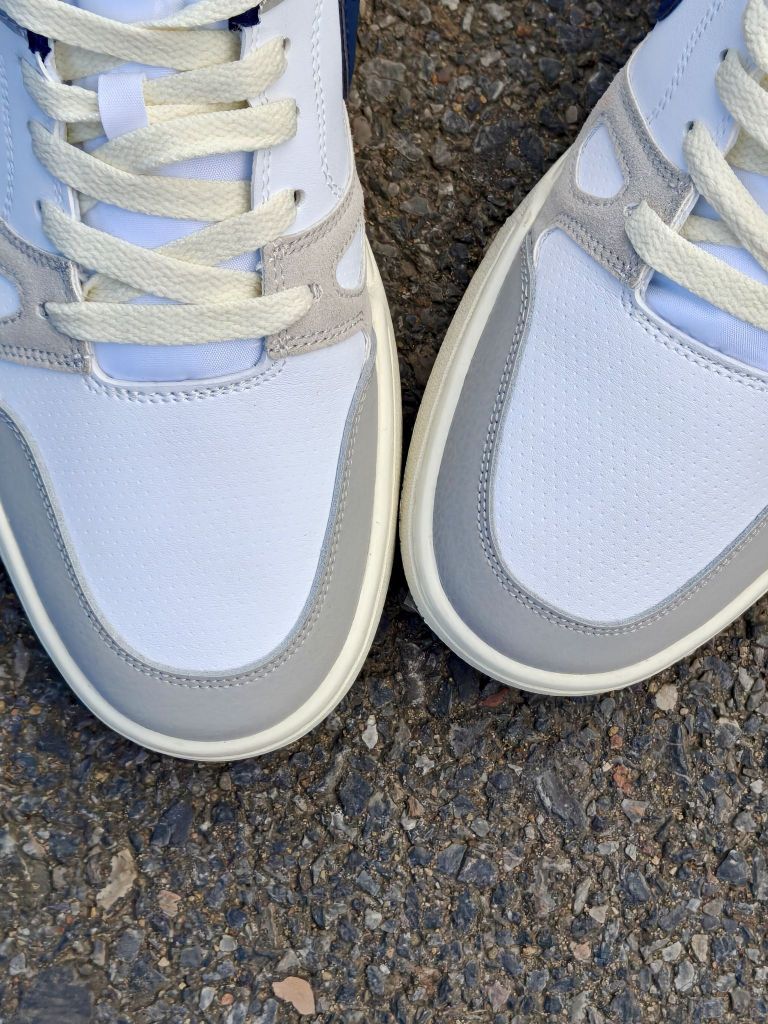鞋面采用的是皮革➕磨砂皮材质,灰色主调带点蓝勾子,看起来很有层次。皮革部分偏硬,磨砂皮软软的,摸起来质感不错 平底设计,脚感挺稳当,鞋底不太软,但走路时能感觉到一点回弹。其次就是透气方面一般,夏天搭配薄袜子穿会舒服许多
