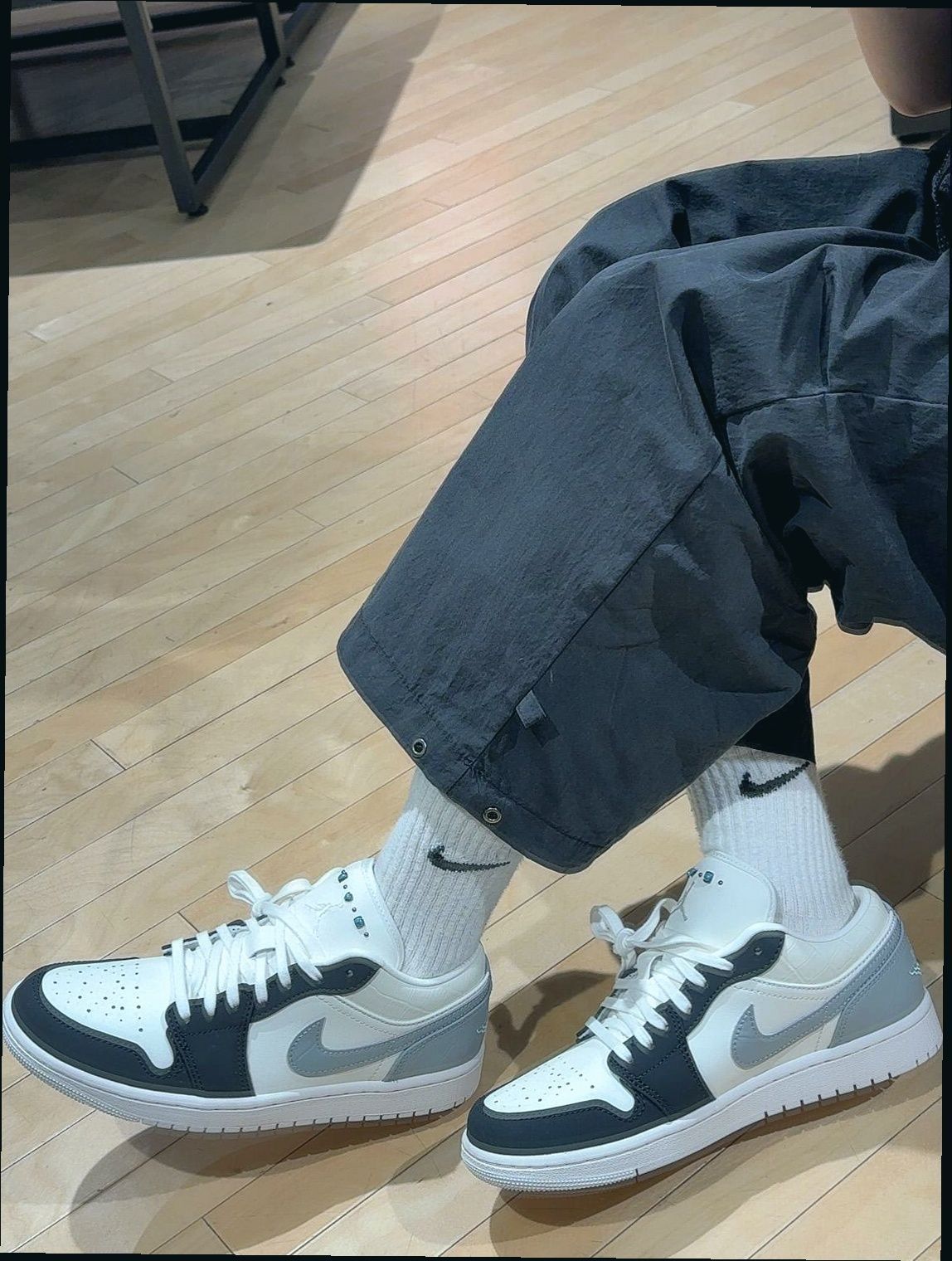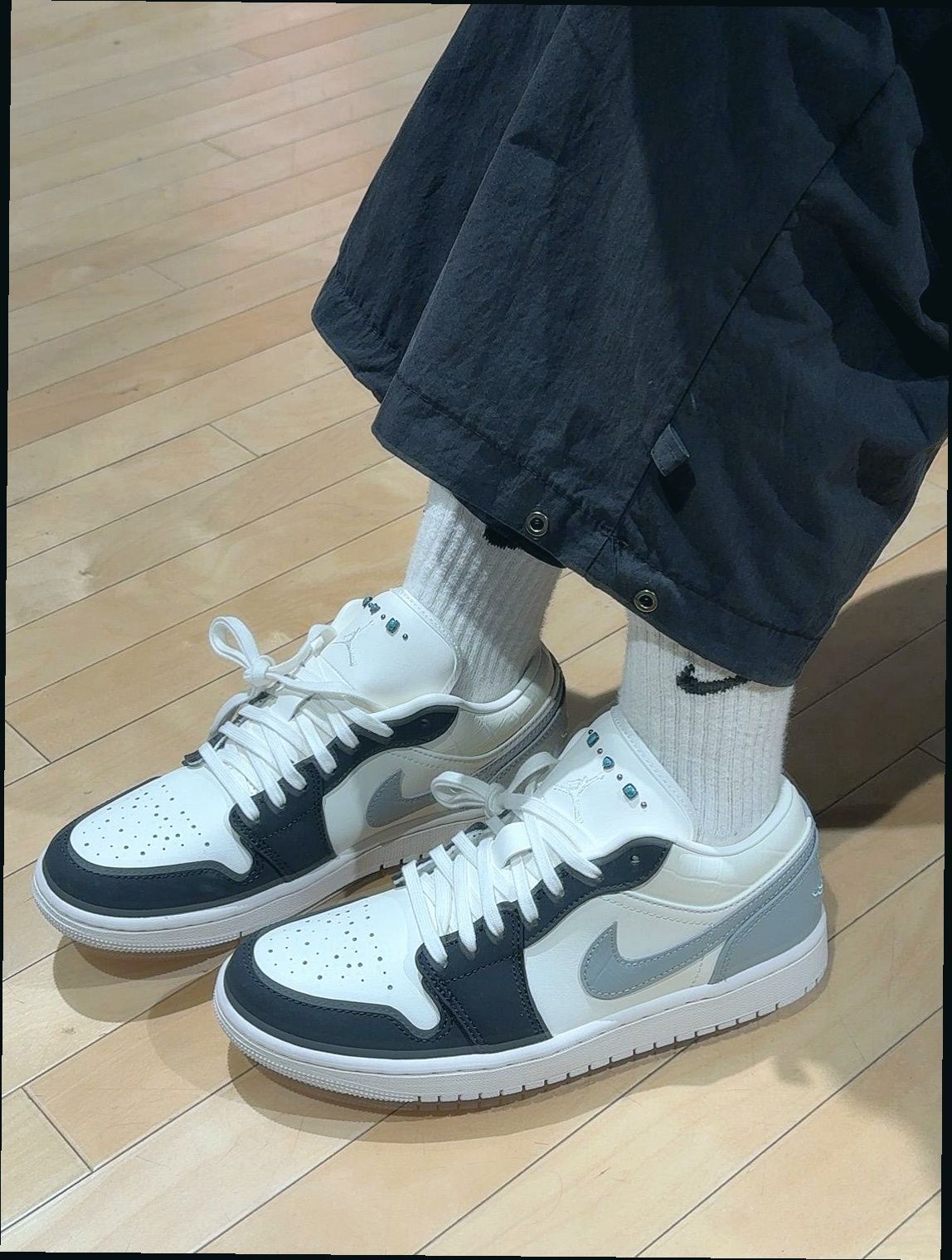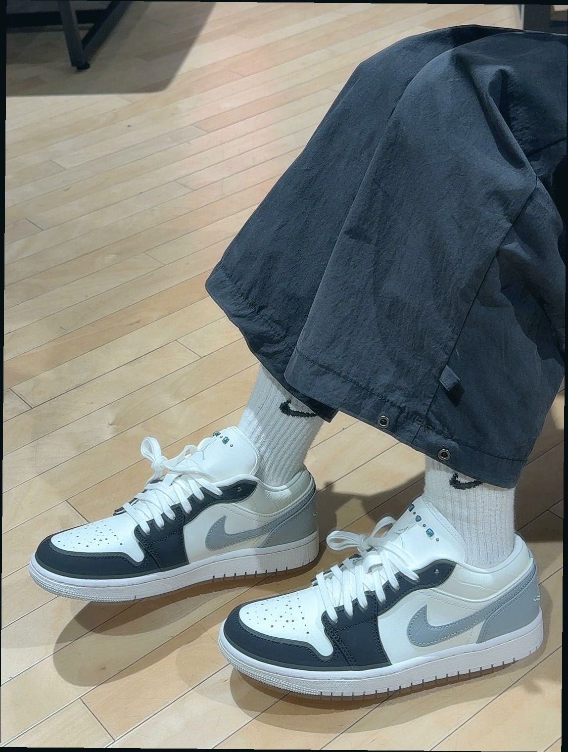 奶油白主调+灰黑Swoosh,复古又不沉闷。后跟银灰Jumpman刺绣点睛,哑光质感弱化运动感,搭西装裤不违和。