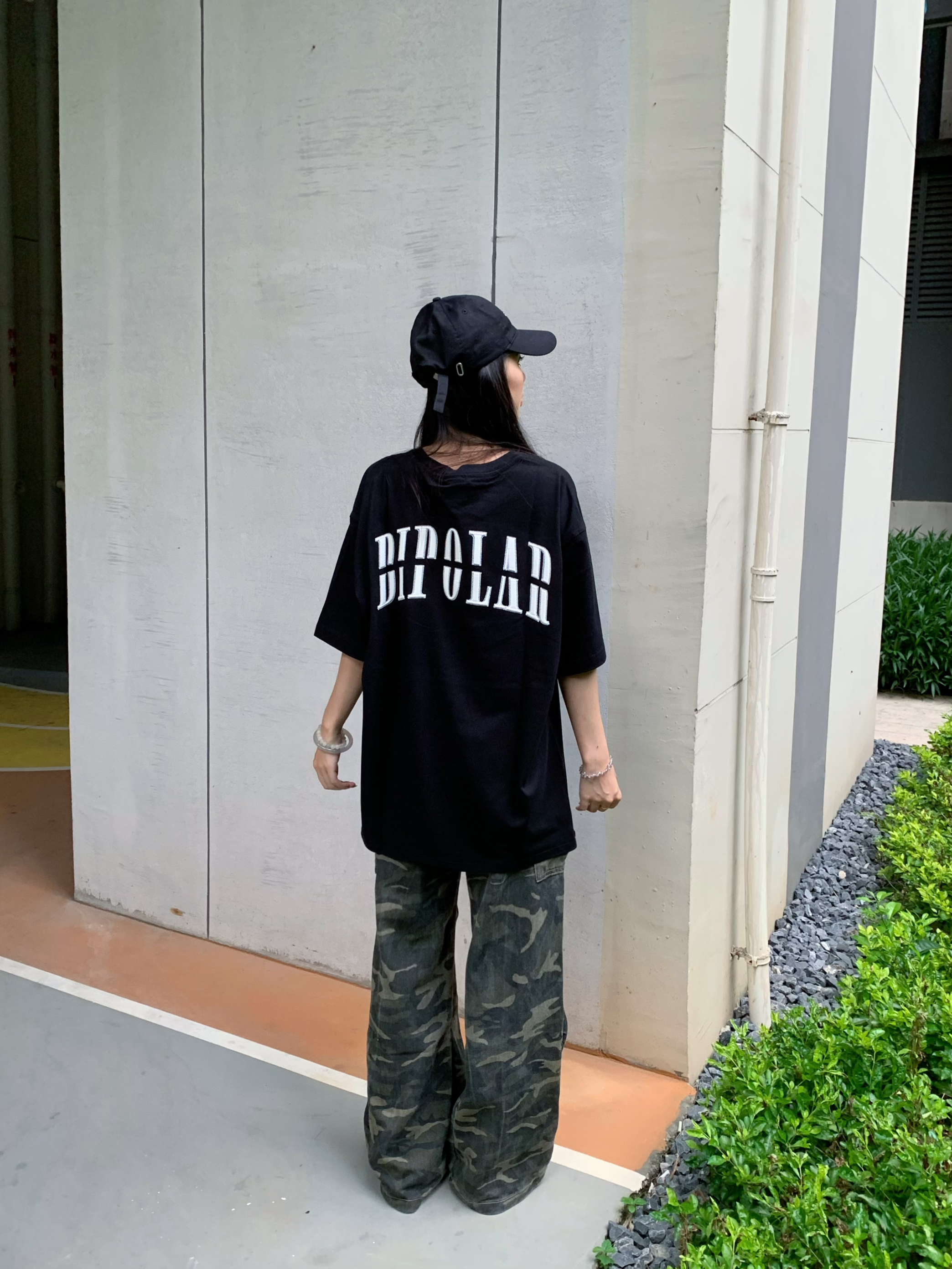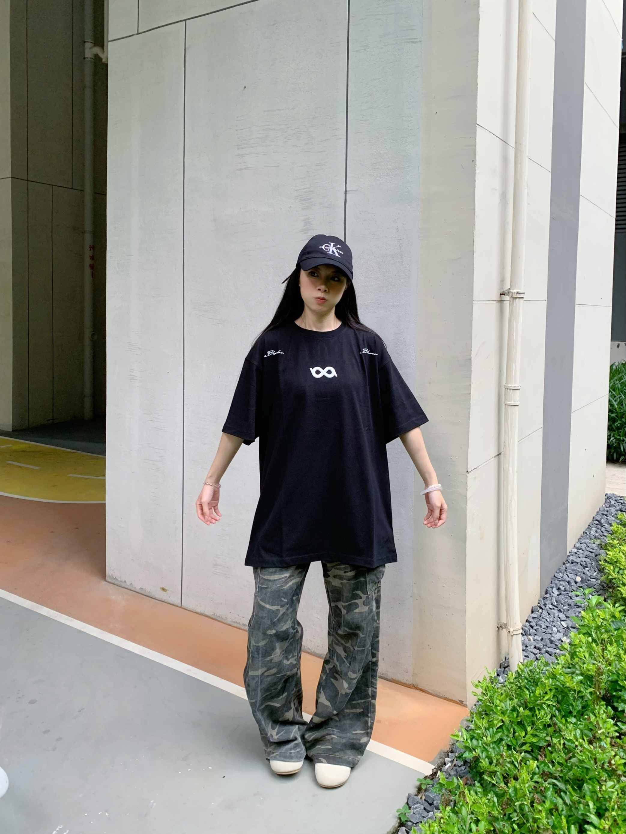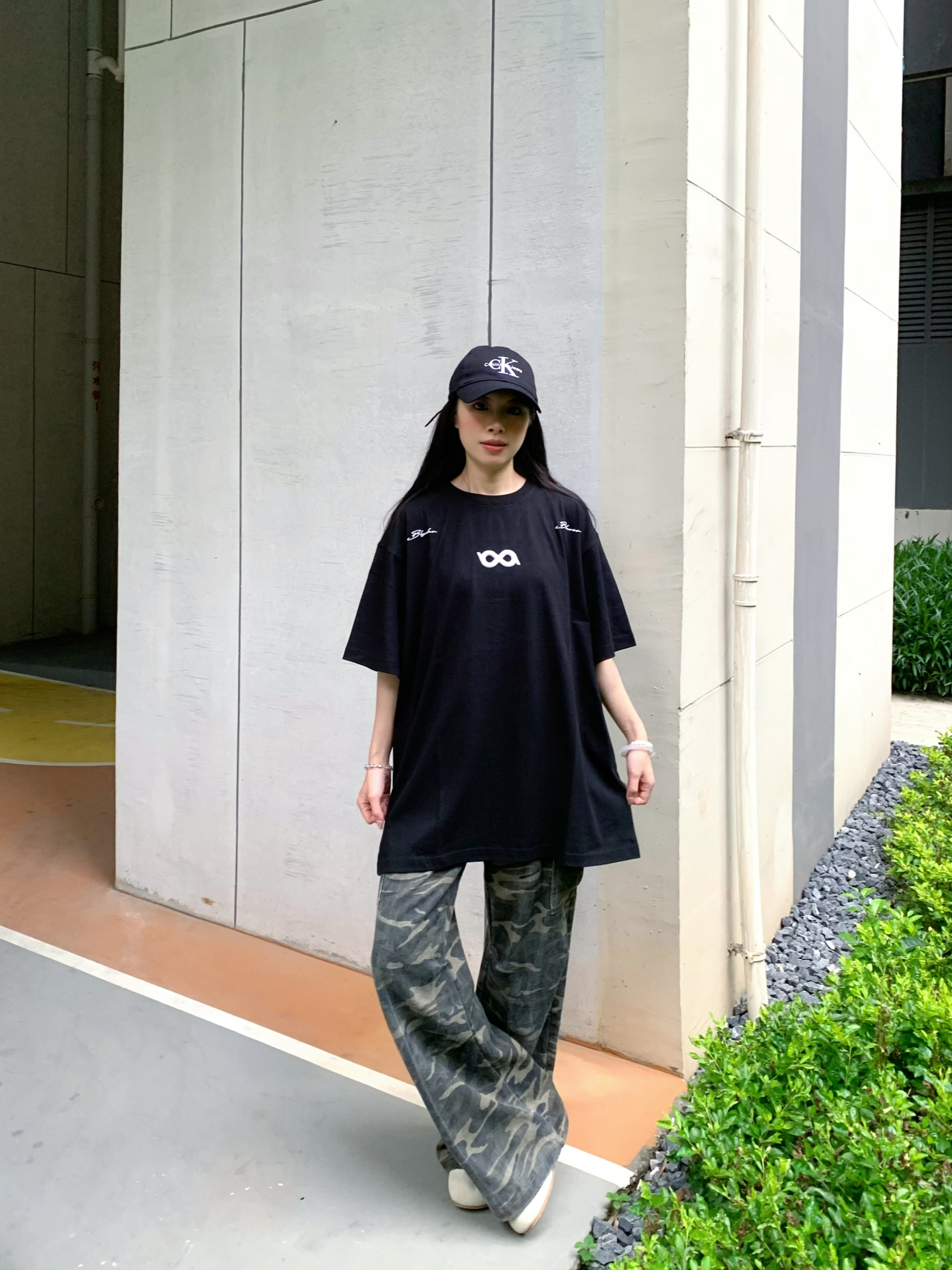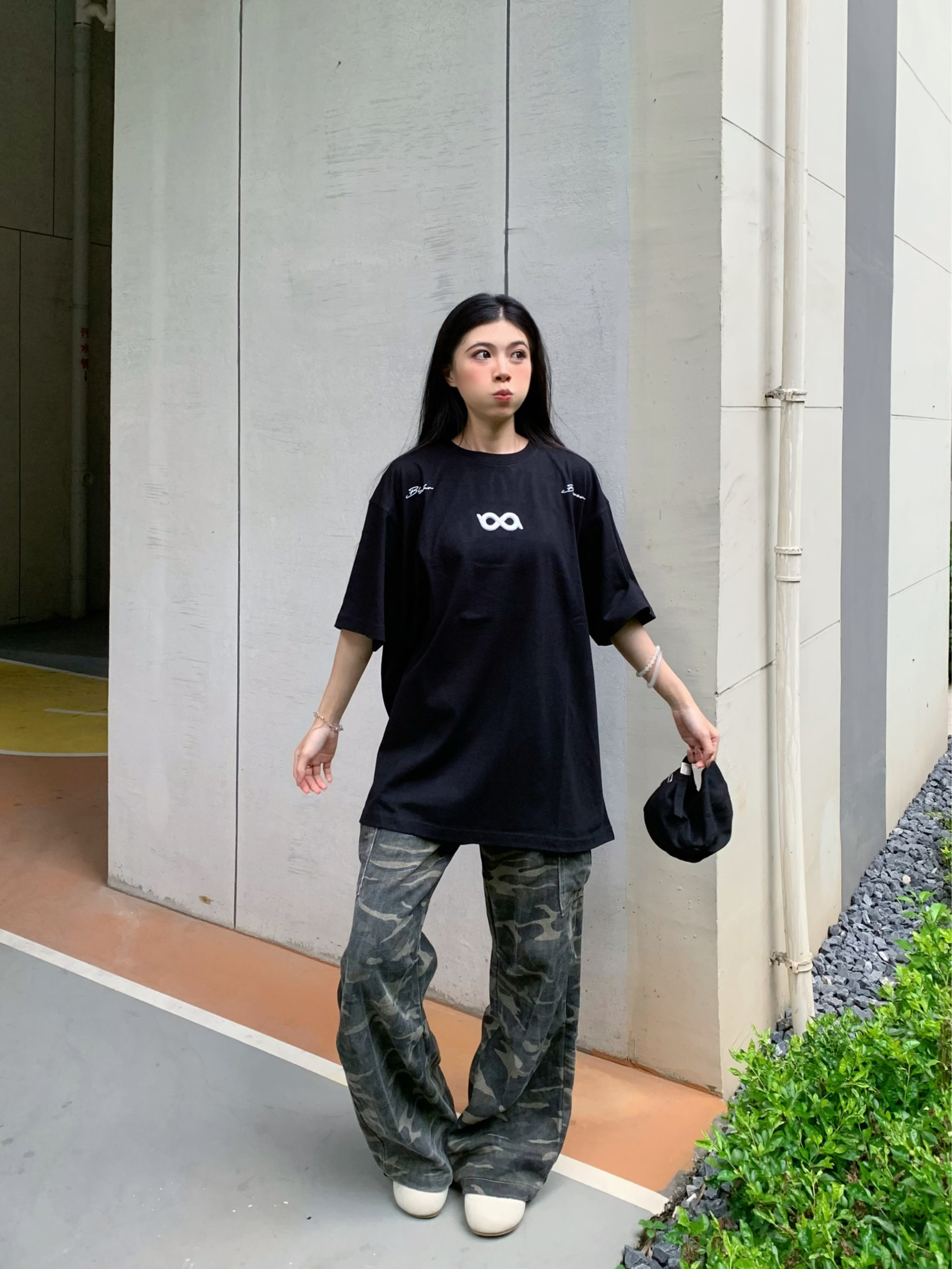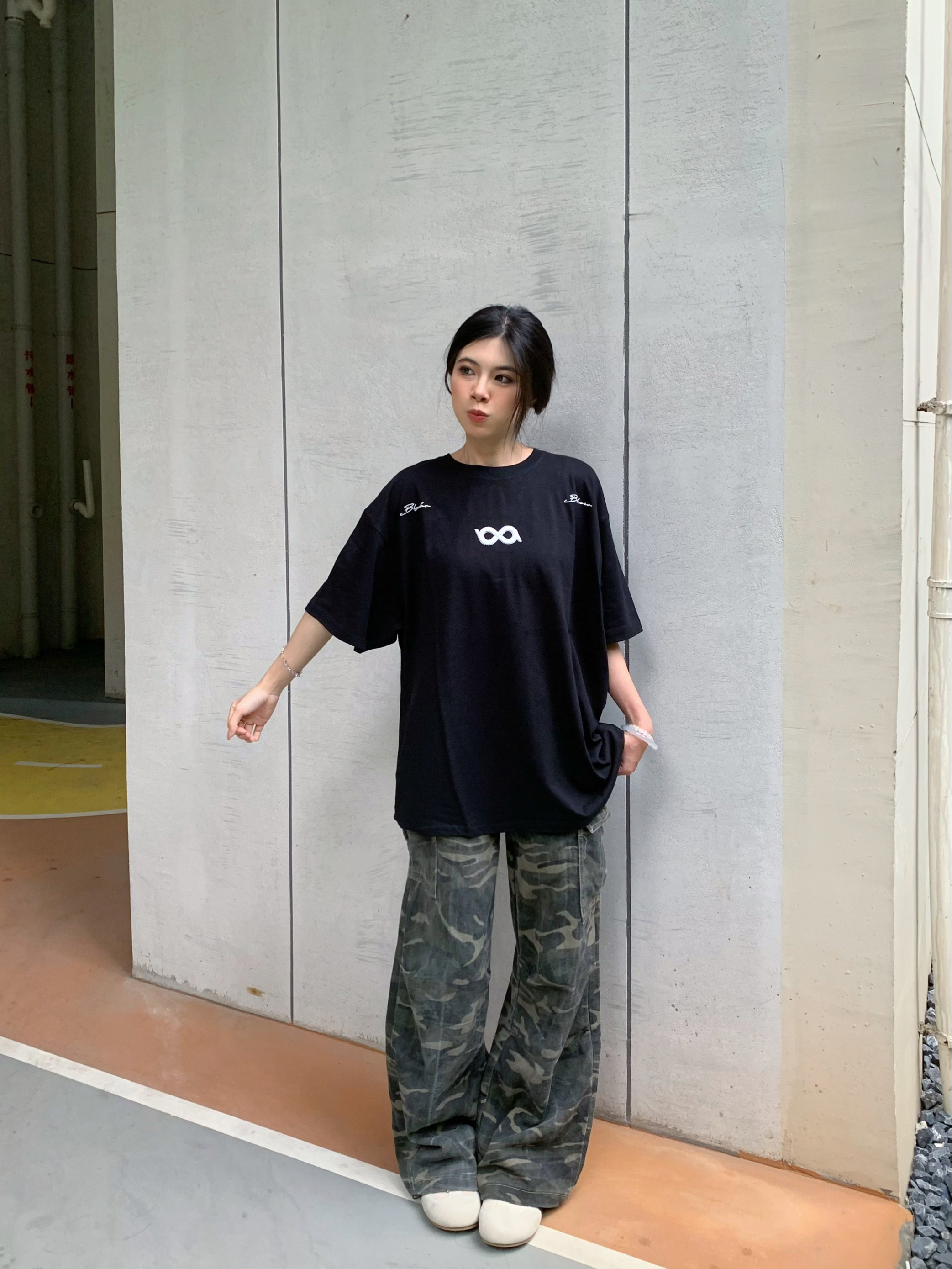 饱饱们这件T恤好酷炫呀!!面料蛮柔软的,而且宽松版型藏肉又自在,简约莫比乌斯环白标点缀,很显高级又潮流。 我觉得搭迷彩阔腿裤,混搭出随性松弛,简约不简单~搭配配牛仔短裤也可以!清爽利落~日常出街、闲逛打卡,轻松拿捏街头酷飒。