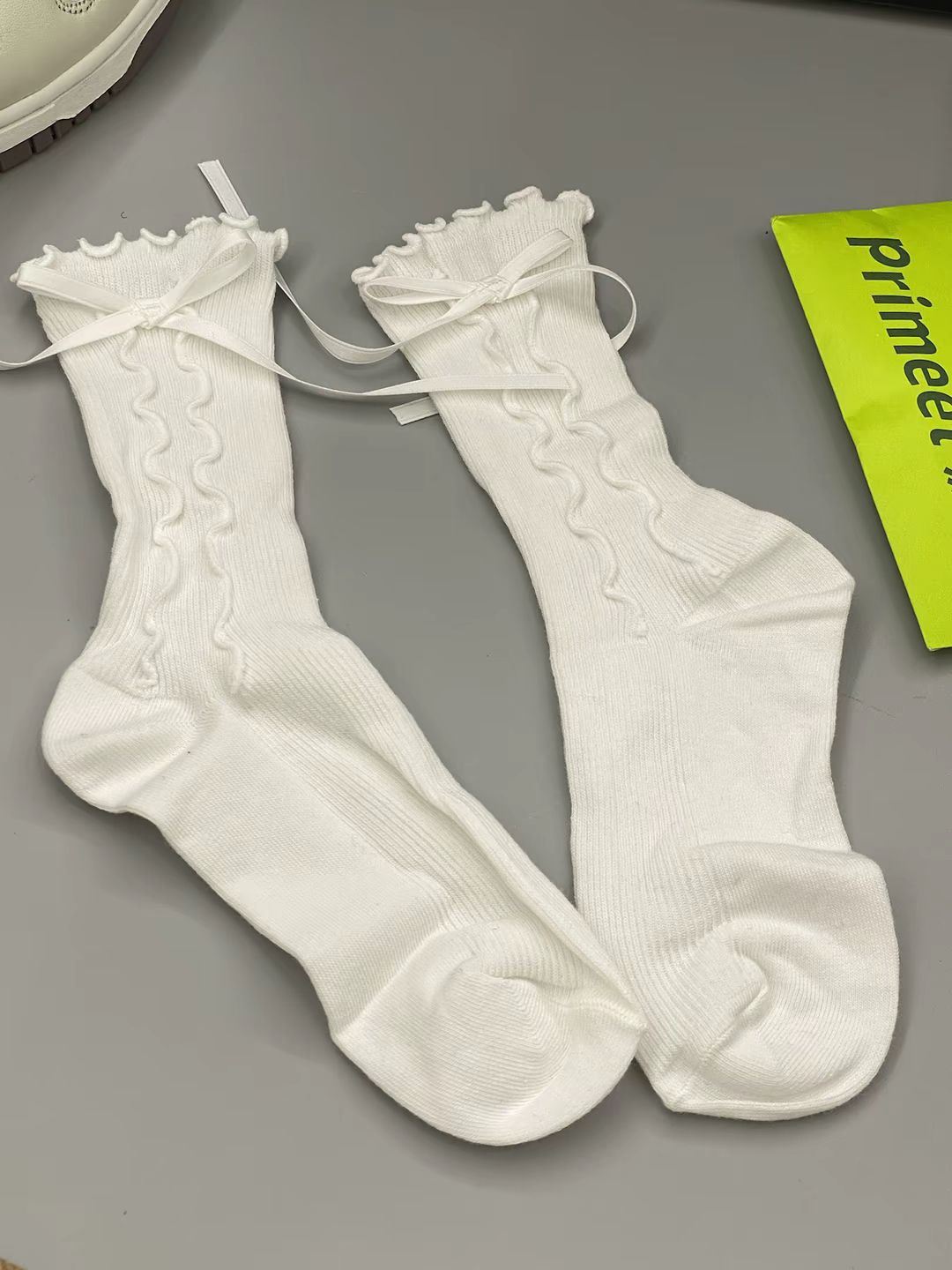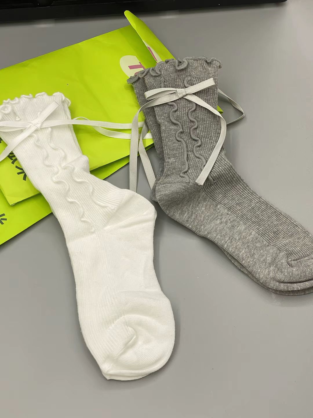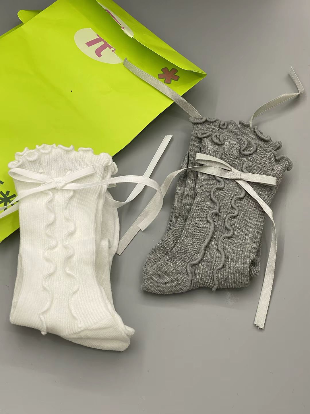是芭蕾风的袜子 一双白色一双灰色 我觉得挺百搭的 穿着舒服 冰冰凉的感觉 我感觉穿着拍照挺出片的呀 ~