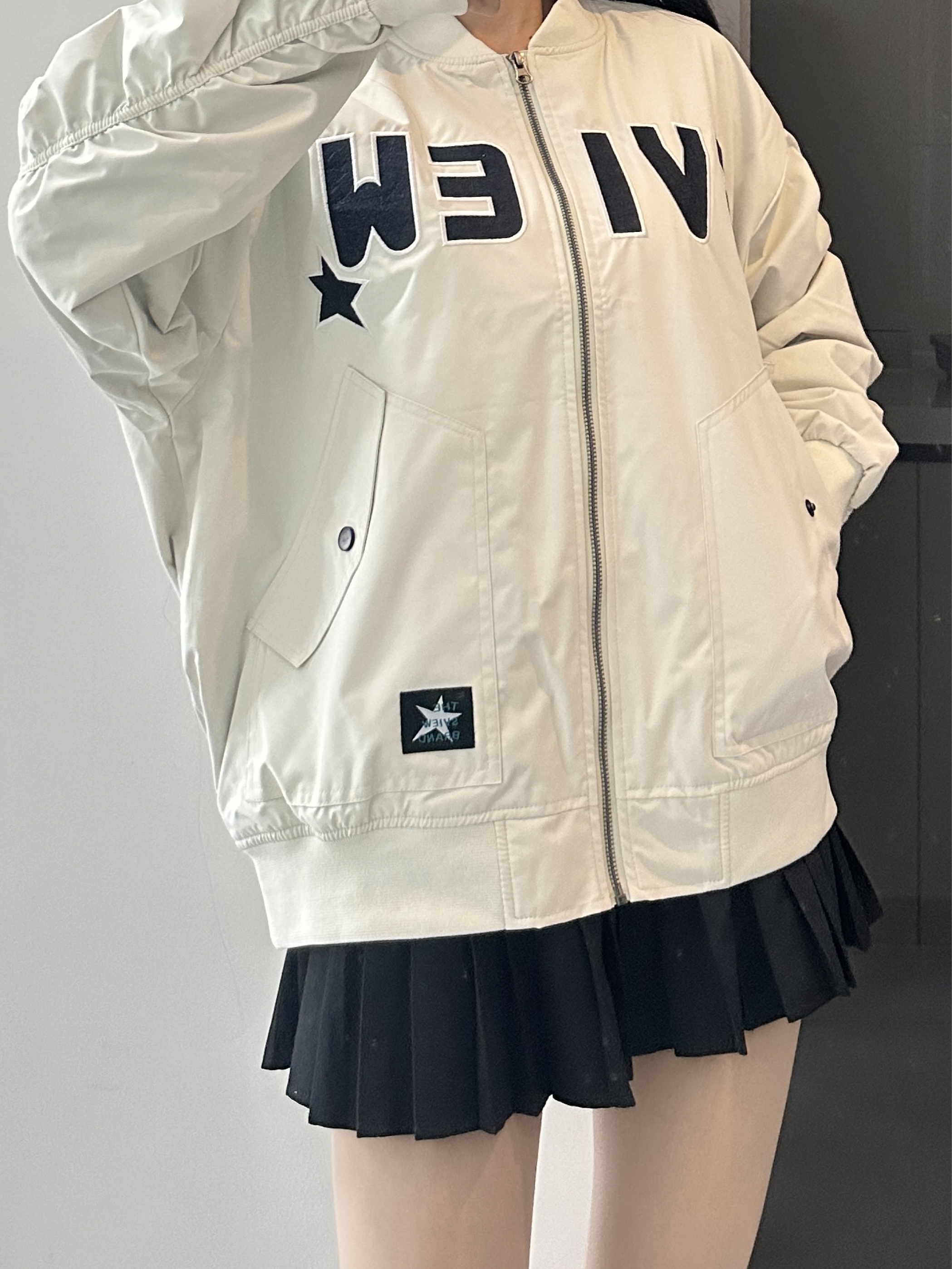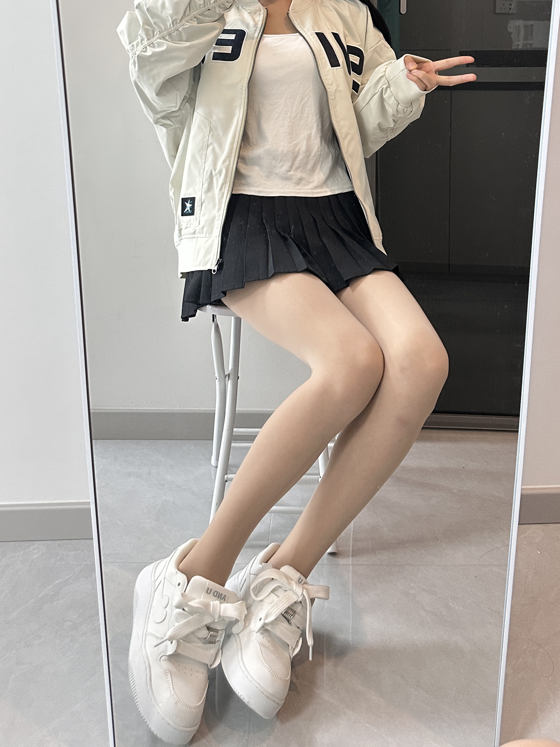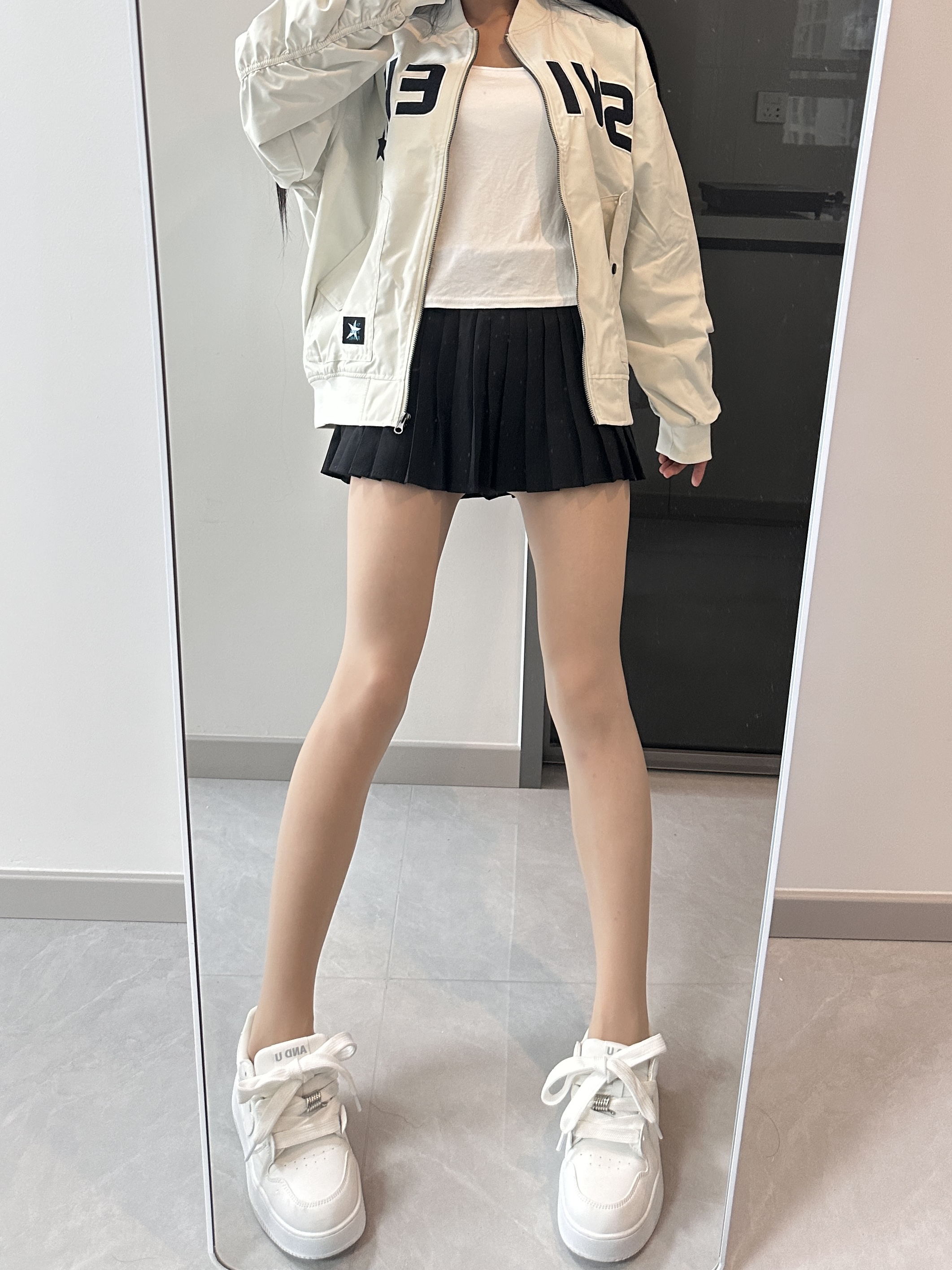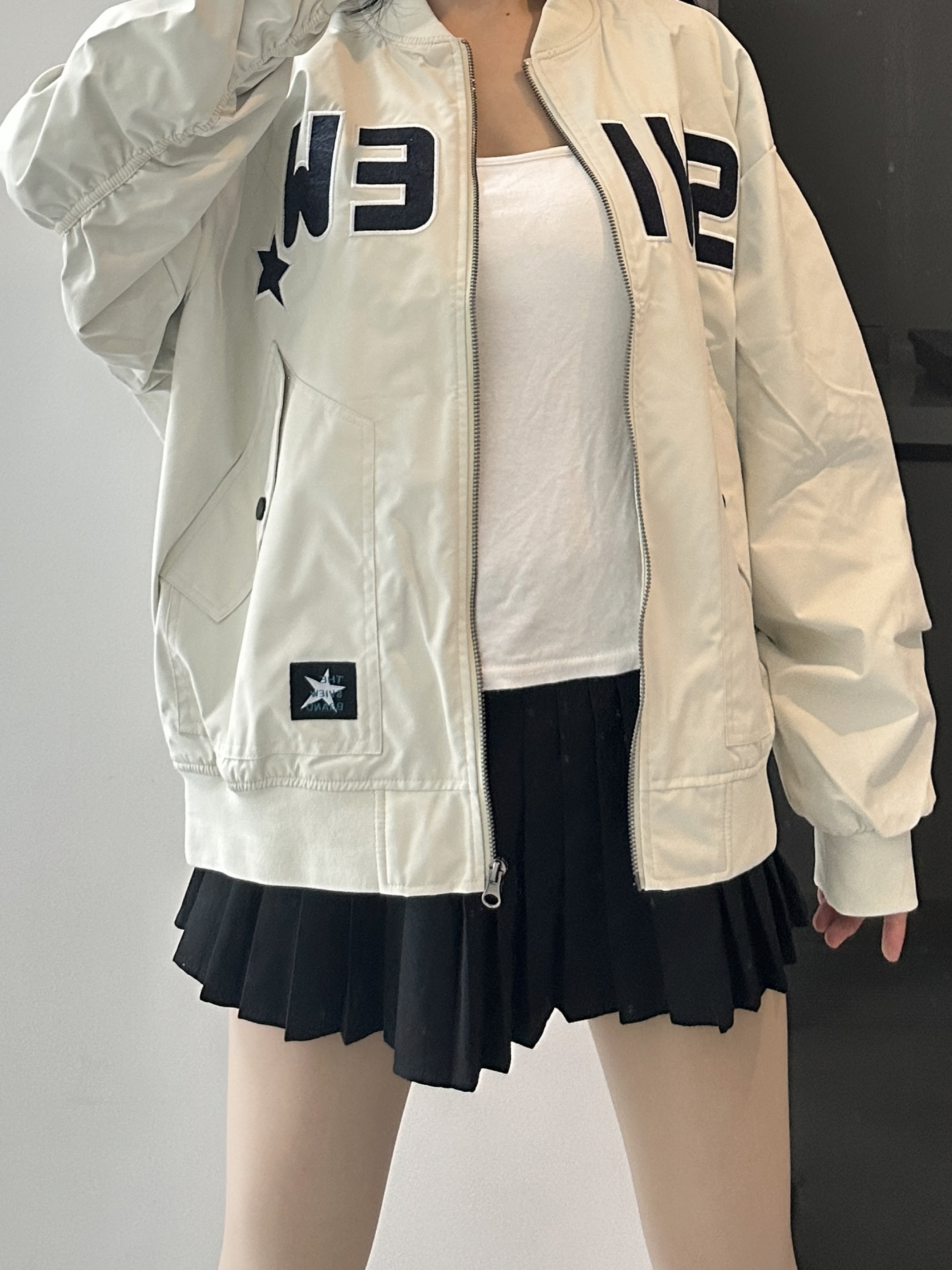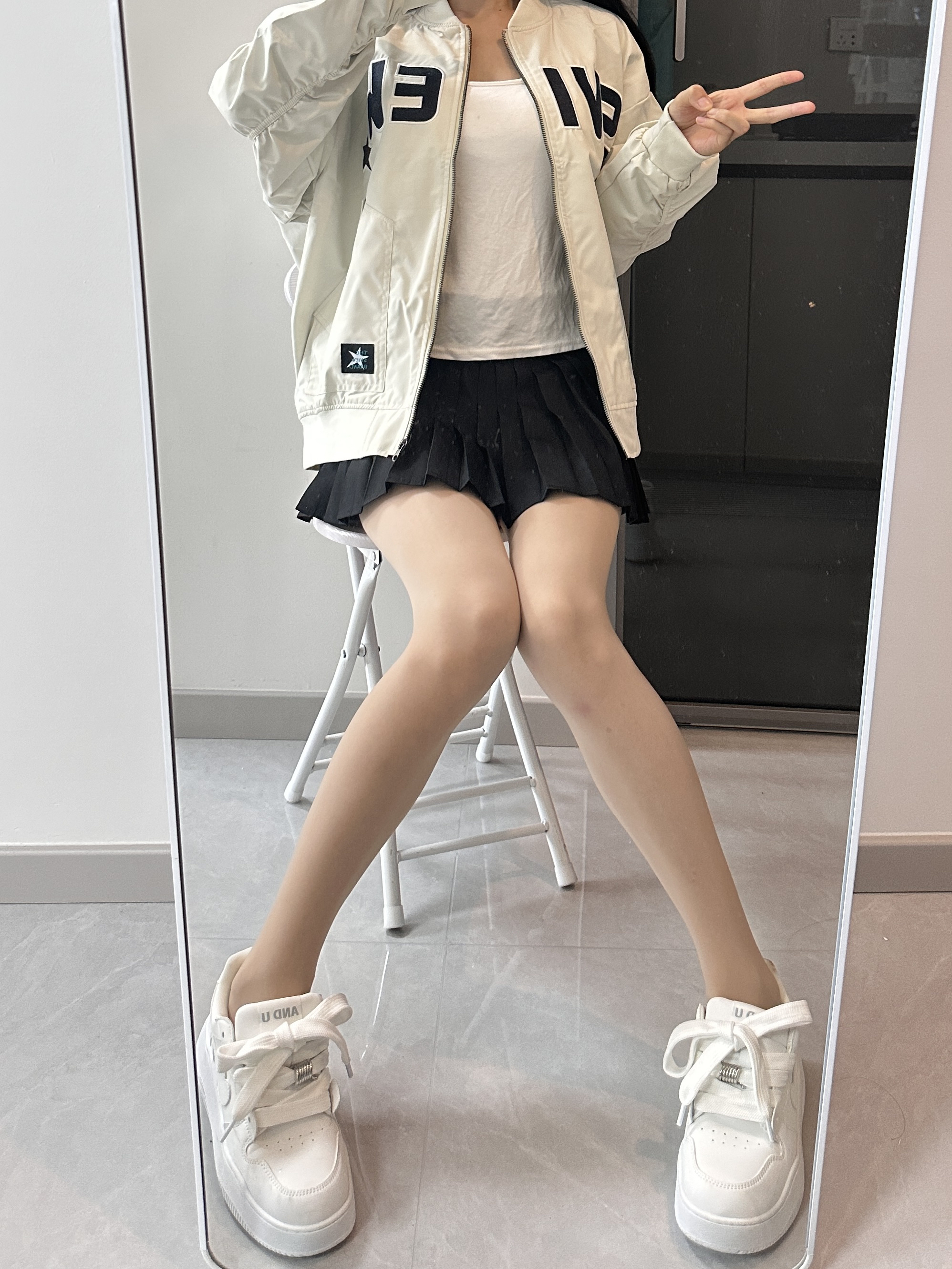 上身穿的这件灰色夹克好酷呀🖤 面料摸起来滑滑的 上身不厚重 胸前的字母刺绣🪡耐看又高级 下身搭配了一条黑色短裙 显瘦显腿🦵长 学院少女感十足