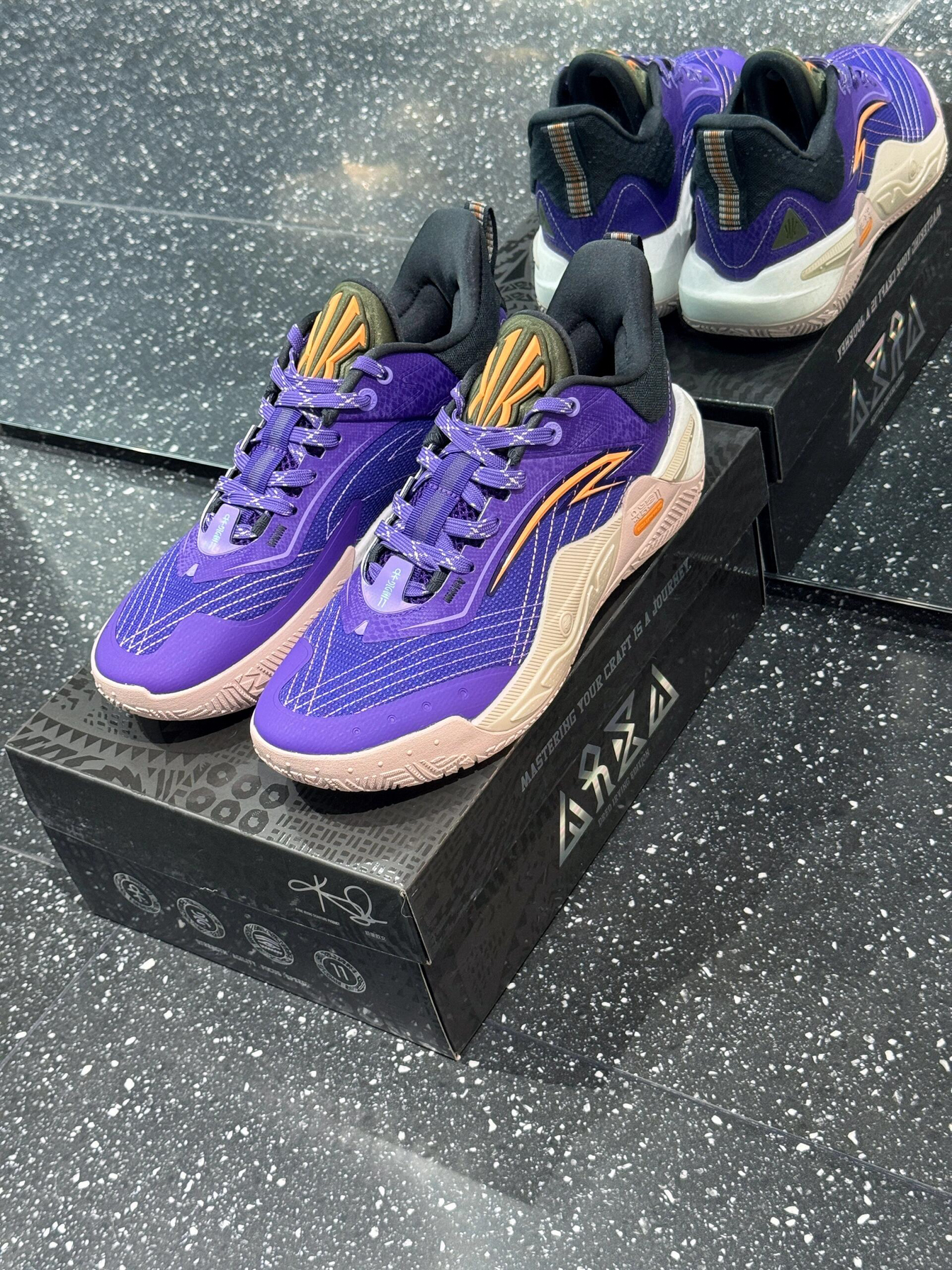我勒个湖人紫配色的KAI SPEED‼️先驱一代紫金配色🟣🟡 👁️🗨️综合来看是一双类似狂潮5pro 但是没有5pro那么薄底🆕 脚感会好很多💭 ⏭️TPU抗扭片没有碳板那么激进 但是实战也是够用🔁 #安踏[话题]# #欧文先驱一代[话题]# #篮球鞋[话题]# #篮球鞋推荐[话题]#