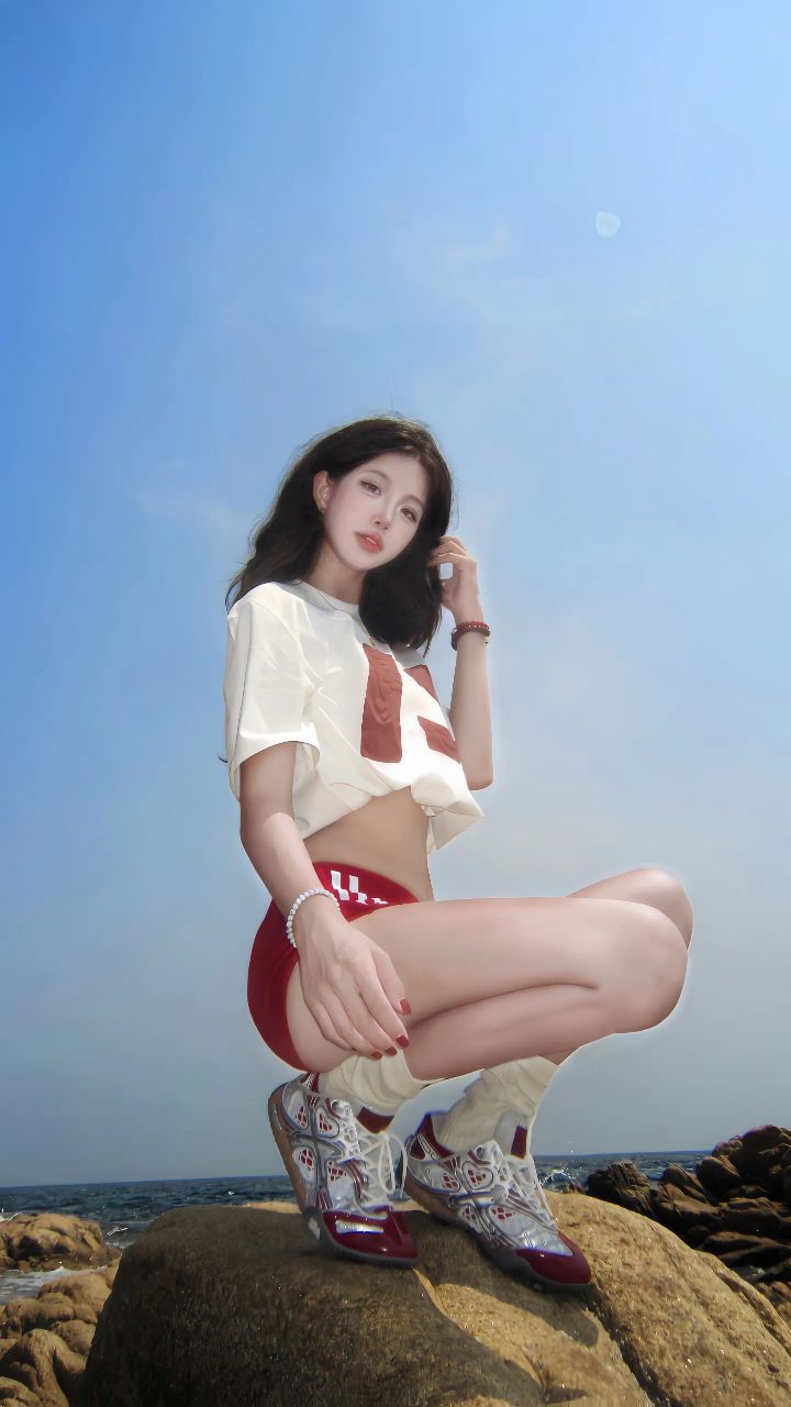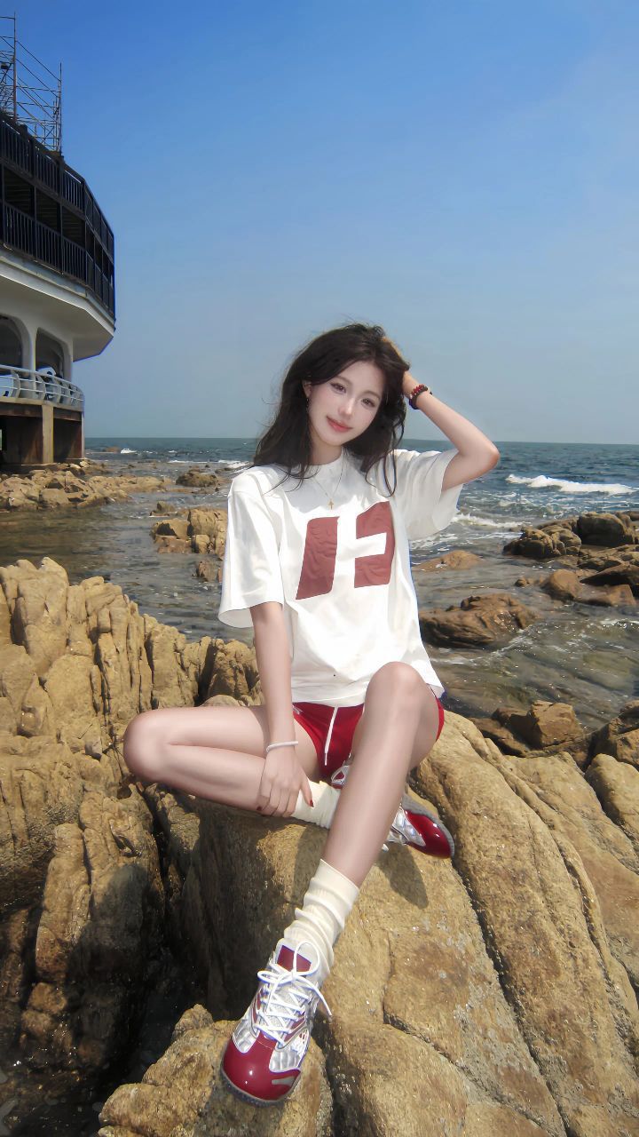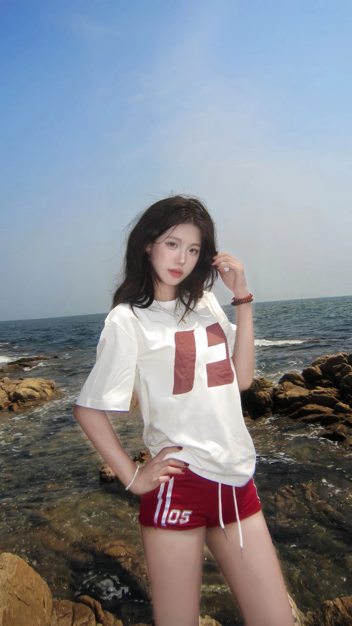 当海浪拍碎在礁石上,她站在阳光里,白T恤上的红字母随海风轻轻晃。短款剪裁恰到好处地露出腰线,在一片蓝白的海岸风景里,像跳动的火苗般夺目。这一幕,让我突然懂了:夏天的穿搭胜负手,往往藏在一件「会讲故事」的短款T恤里。