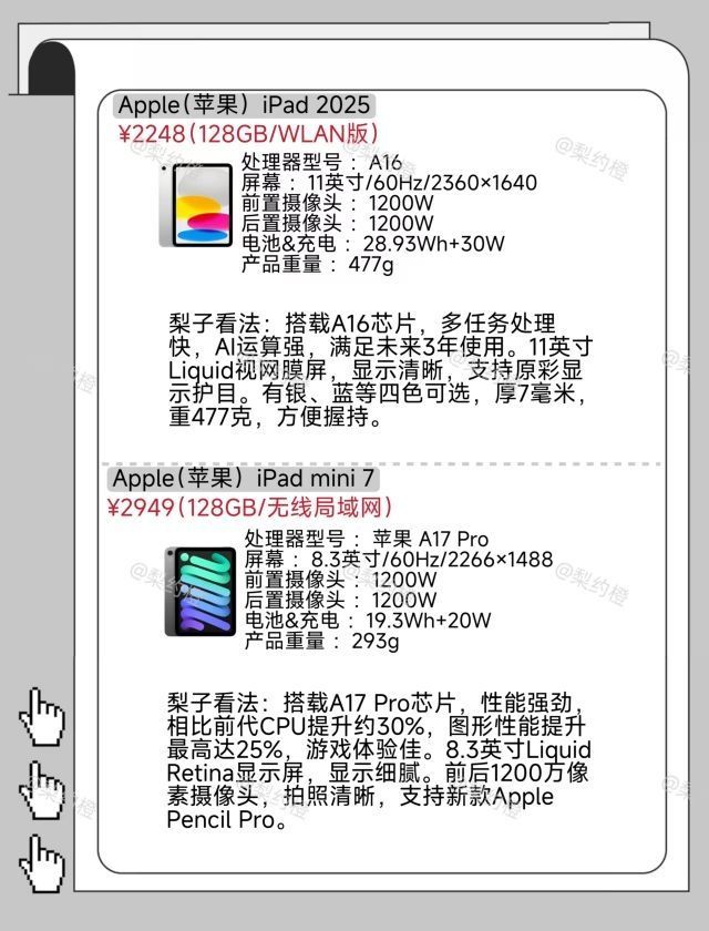 预算3000左右,想挑款合适iPad,看这几款就够啦! _ 追求极致性价比——iPad 2025 _ 如果预算有限又想体验苹果生态,iPad 2025是首选。它搭载A16仿生芯片,性能强劲,日常学习、办公、刷剧毫无压力。11英寸Liquid视网膜显示屏,色彩鲜艳。价格亲民,3000预算能拿下128GB版本,很适合学生党和普通上班族。 _ 小巧便携之选——iPad mini 7/iPad mini ...