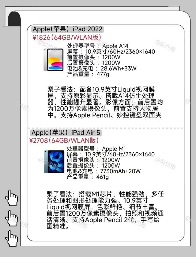 本篇笔记关联了Apple/苹果 iPad Air 5 2022款 10.9英寸 平板电脑 局域网 蜂窝版 学习 办公 大屏 护眼 蓝色、Apple/苹果 iPad Air4 2020款 10.9英寸 平板电脑 全面屏 触控 银色、Apple/苹果 iPad 8 2020款 10.2英寸 平板电脑 护眼 深空灰等商品,为用户提供真实的使用体验和购买参考。