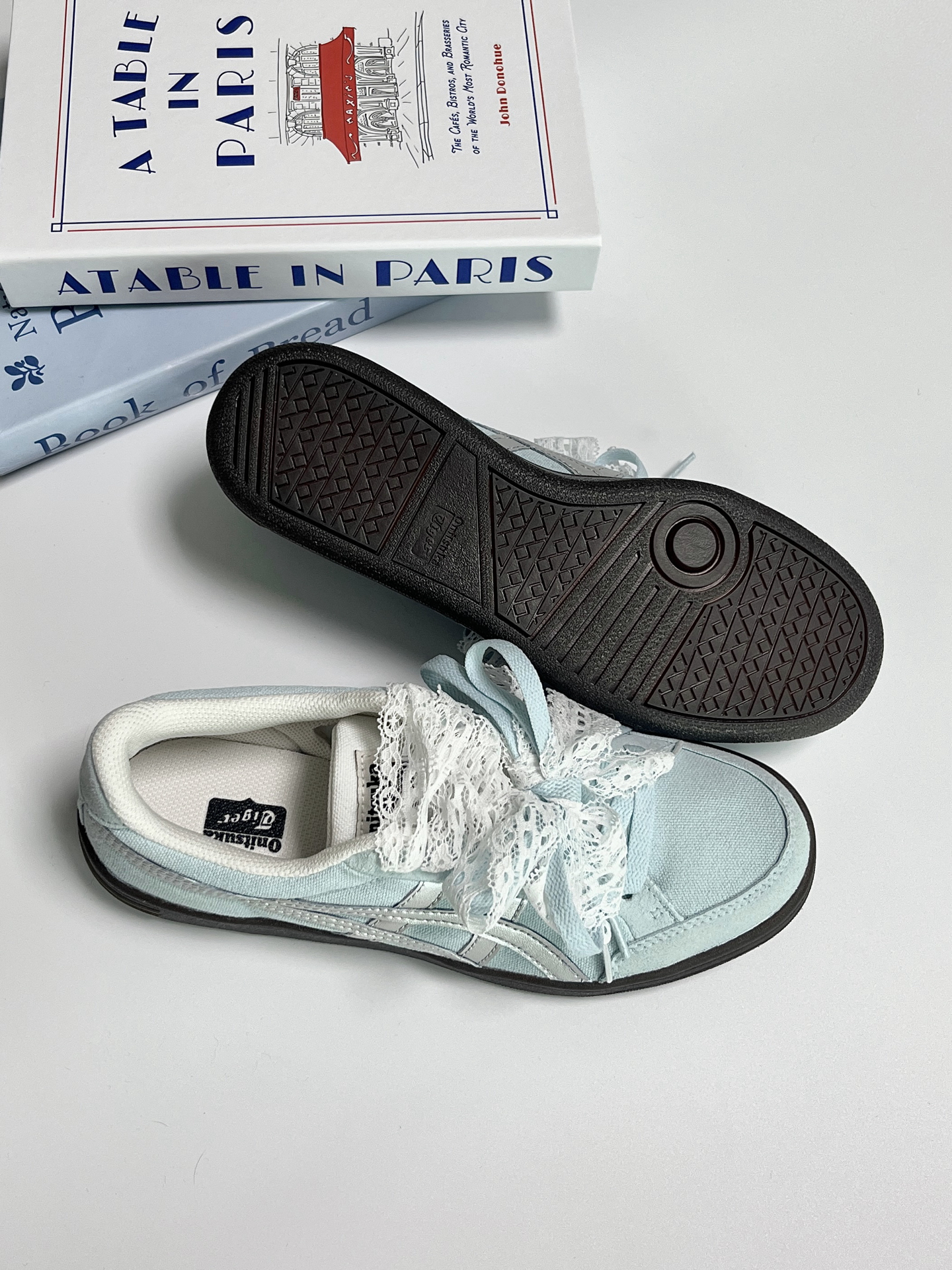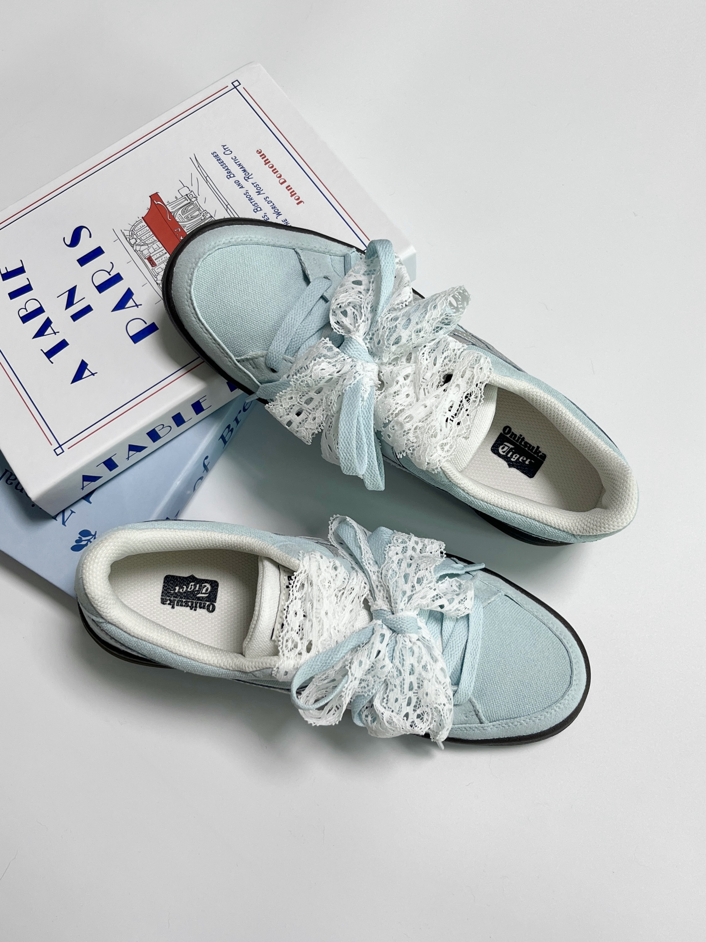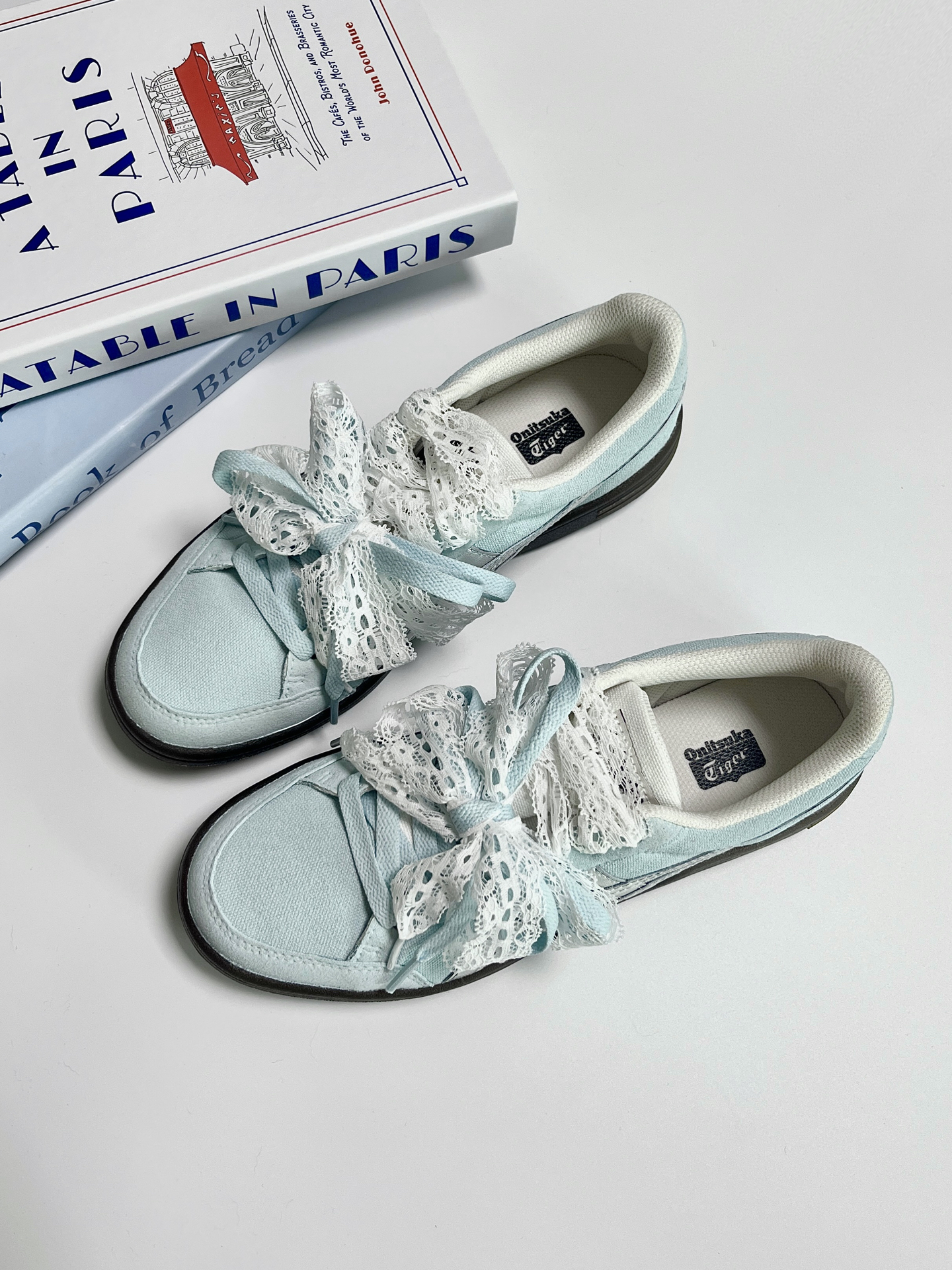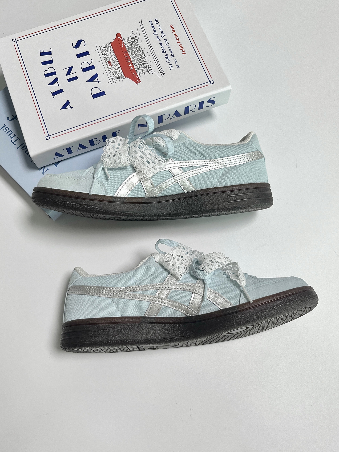 我最近挖到一双超心水的板鞋💙。 浅蓝的色调超级友好,上班配卡其裤或西装裙不突兀,下班换条牛仔短裤立刻切换休闲模式。 最吸睛的是那双层鞋带! 硬朗的蓝色棉绳和柔美的银色蕾丝缠绕在一起,每次低头系鞋带都觉得这个设计好妙——既有力量感,又不失女孩气
