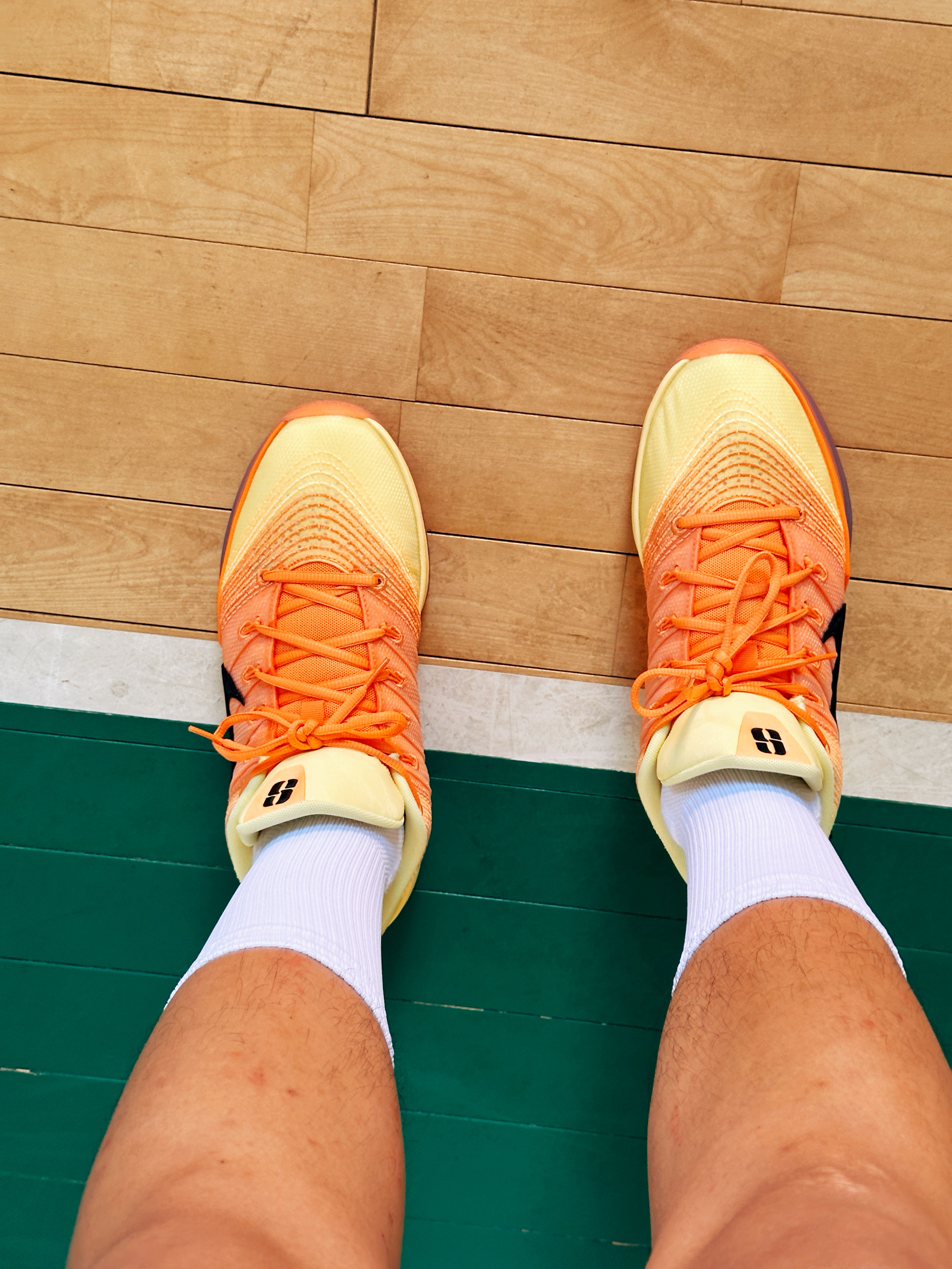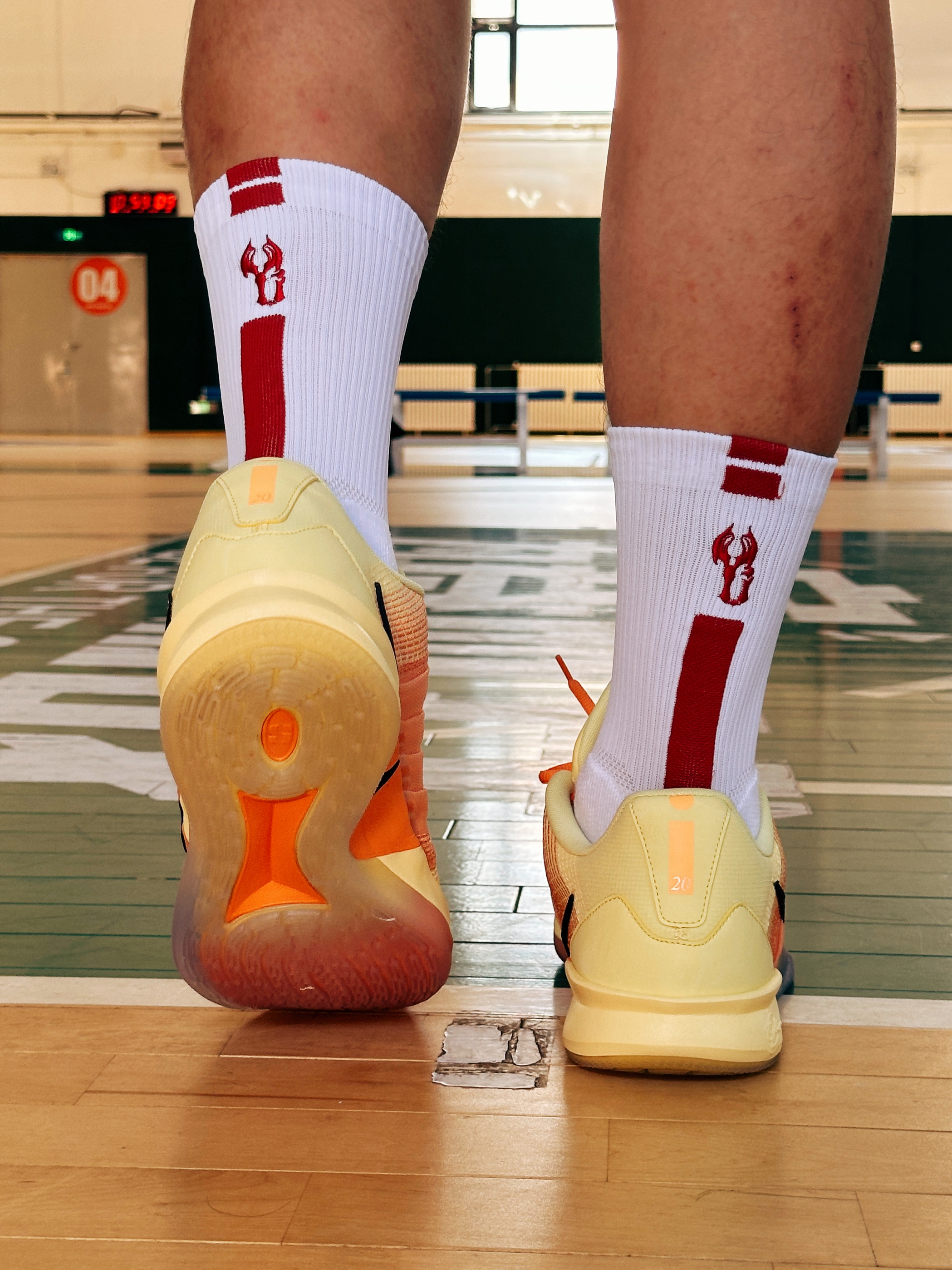 抓地方面:全掌的纹路基本就是 S 的变形,设计的过于简单再加上全掌水晶底所以耐磨就差点意思了,但是抓地效果还是可以的,不管是紧急制动还是撤步横移都不在话下,没有出现打滑的情况,很适合急停跳投呀!