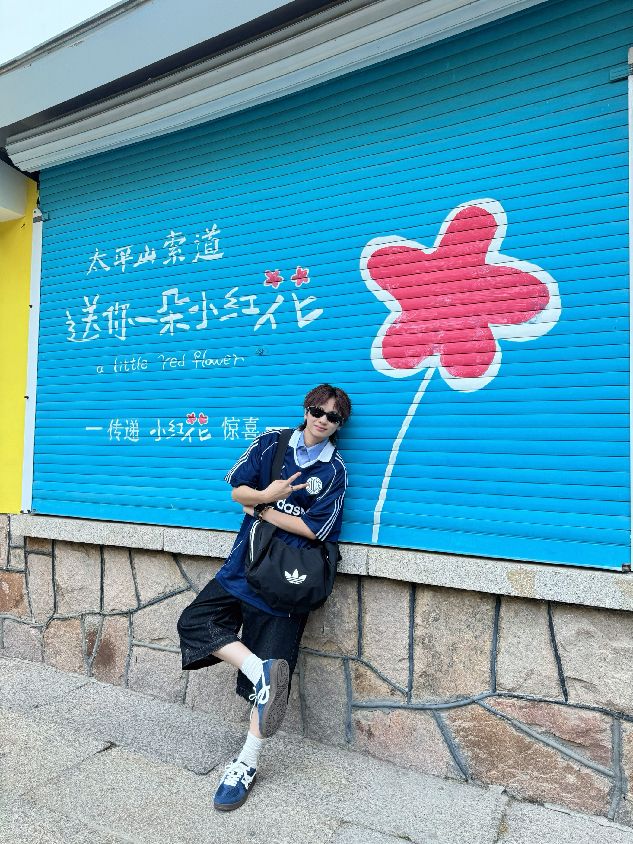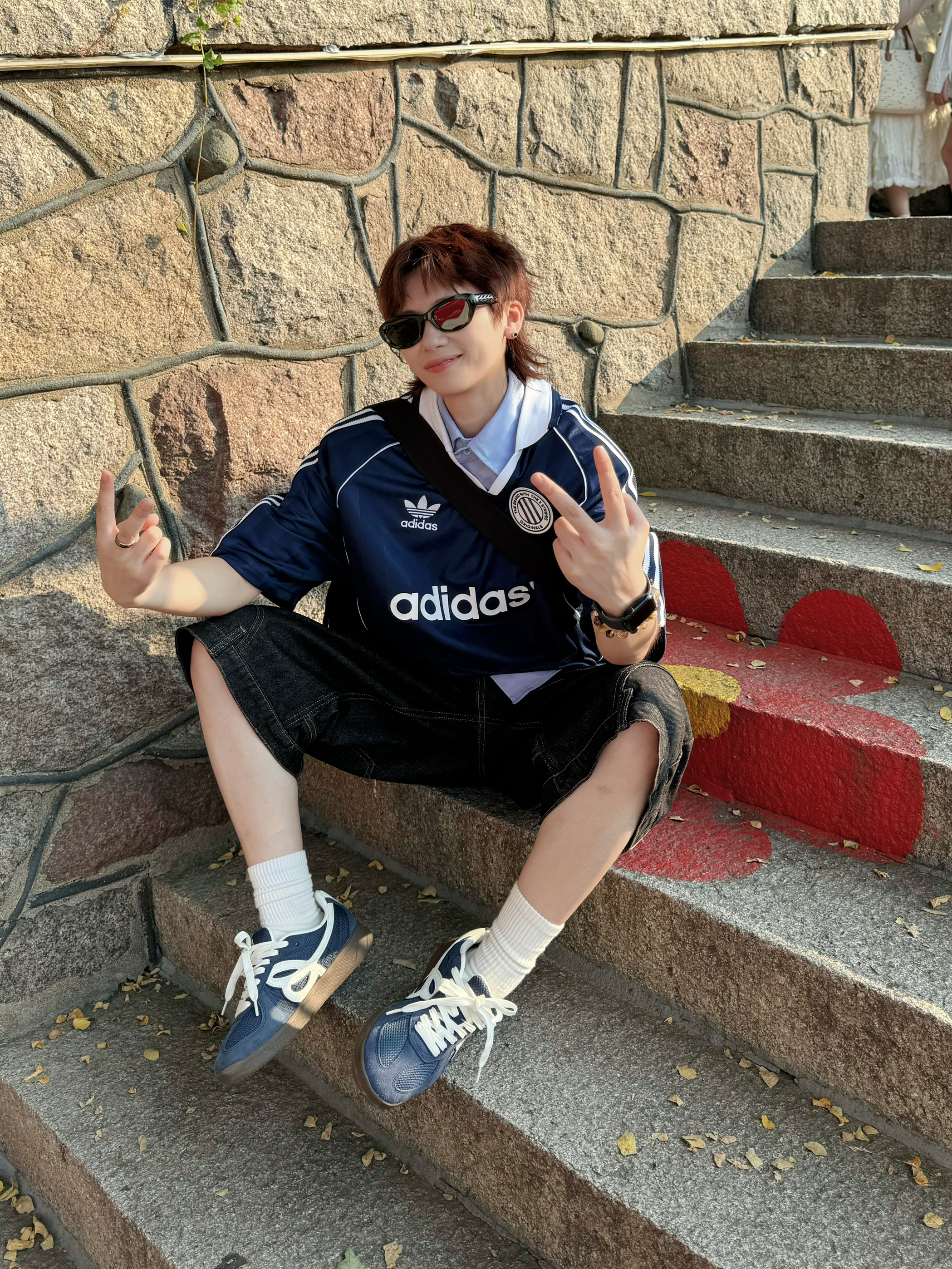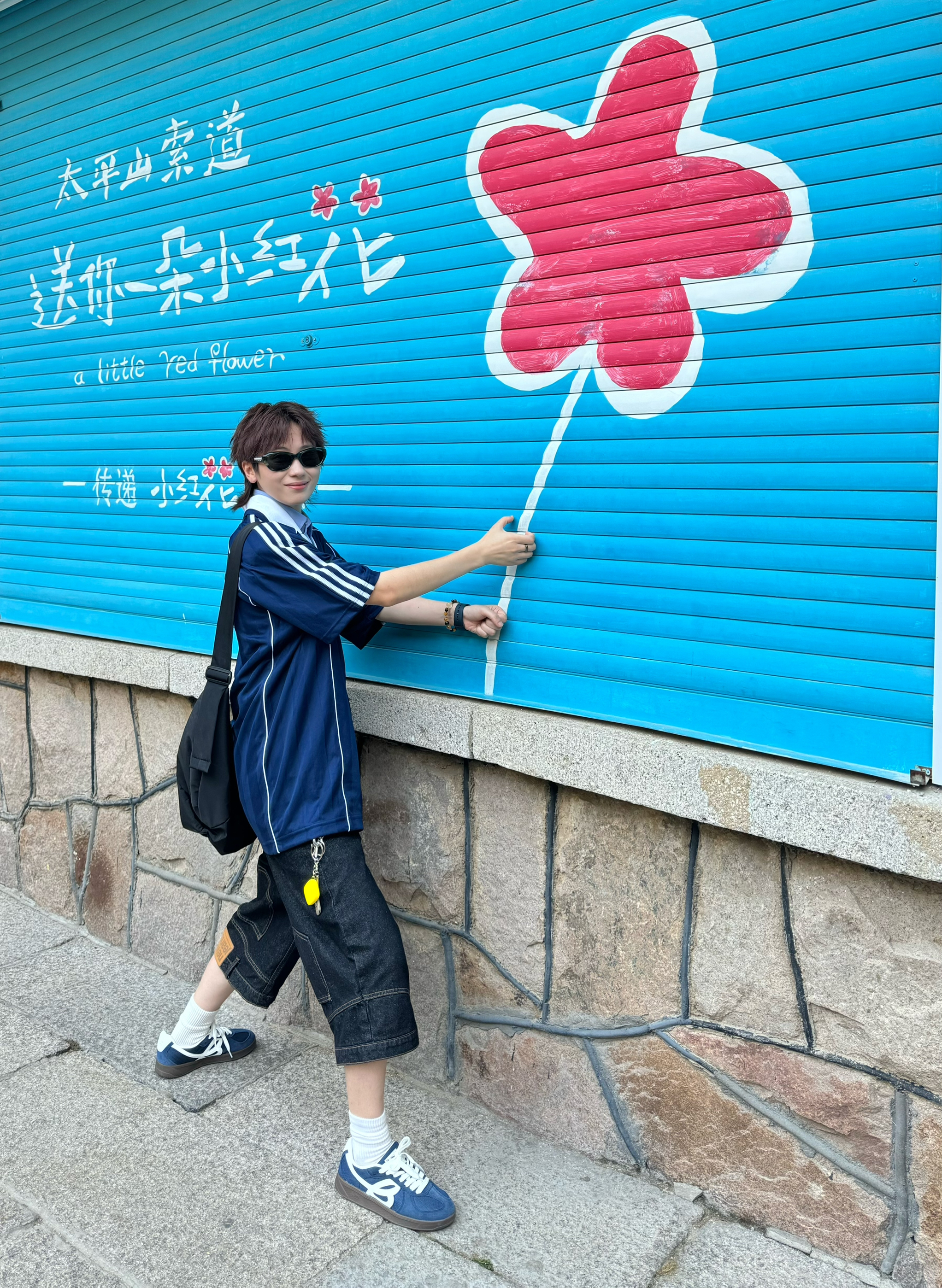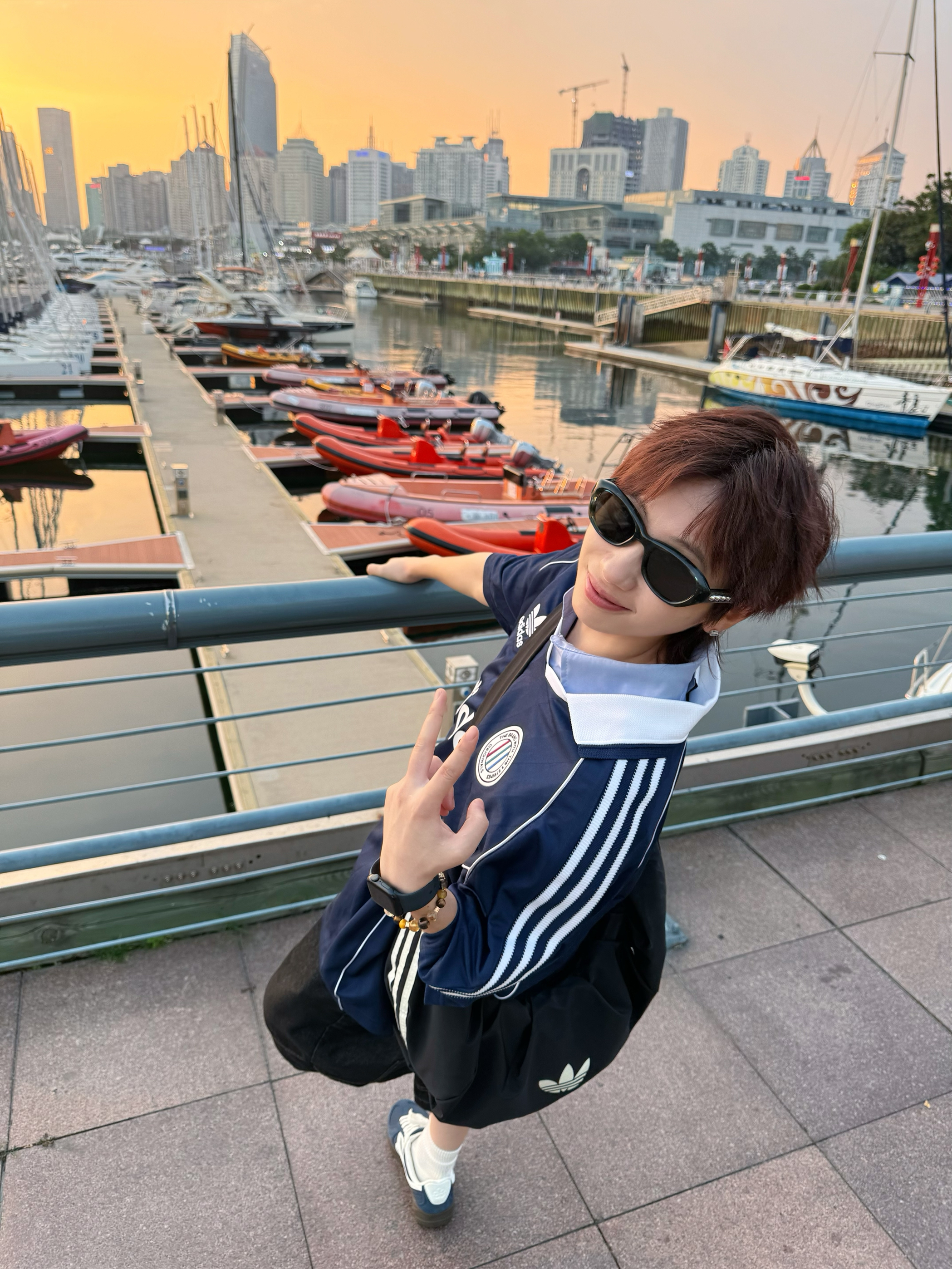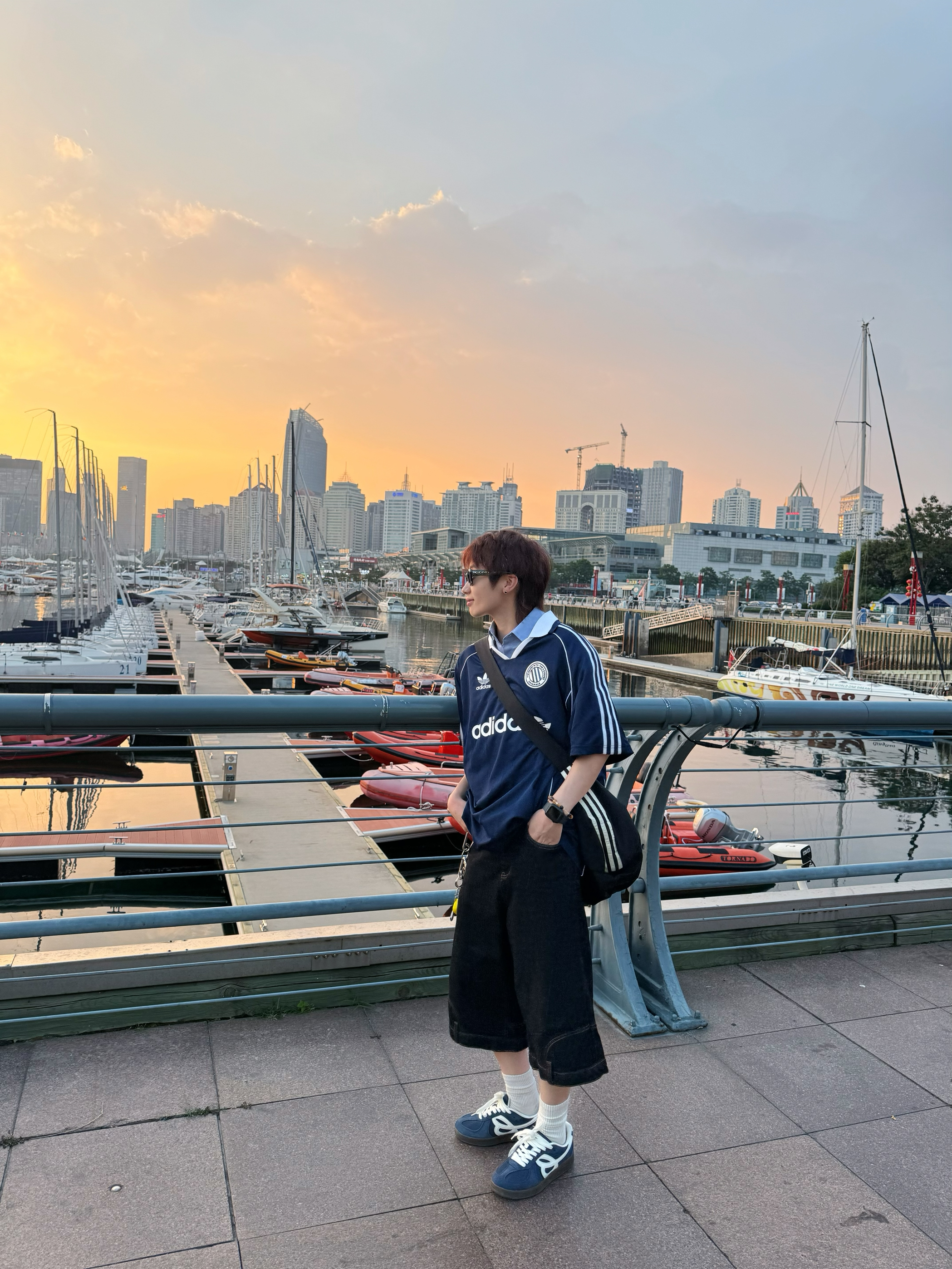 来青岛奥帆中心和太平山打卡一下📍 p5-8是千玺的一朵小红花拍摄地 今日份海岛ootd 上身选了件蓝色的球衣T恤 内搭同色系衬衫,老王哥同款get 下面搭配黑色七分裤 和一双同色系的德训鞋 复古蓝色百搭又出片 脚感软弹,出门逛了一天都不累