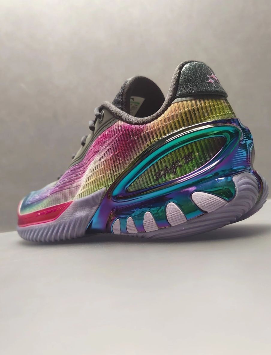 上脚感觉,包裹性特强,勒紧鞋带,脚被稳稳固定住,安全感拉满。 鞋底纹路简单实用,抓地力强,塑胶和木地板都能hold住,急停变向不打滑。缓震是A - SHOCK PRO科技,启动时反馈迅速,爆发力足,落地也能很好缓冲。不过中底偏薄,大体重朋友可能觉得缓震差点意思。 鞋面是透气材质,打一场球下来,脚不怎么闷汗。鞋身外侧有加宽设计和TPU支撑,防侧翻性能也不错