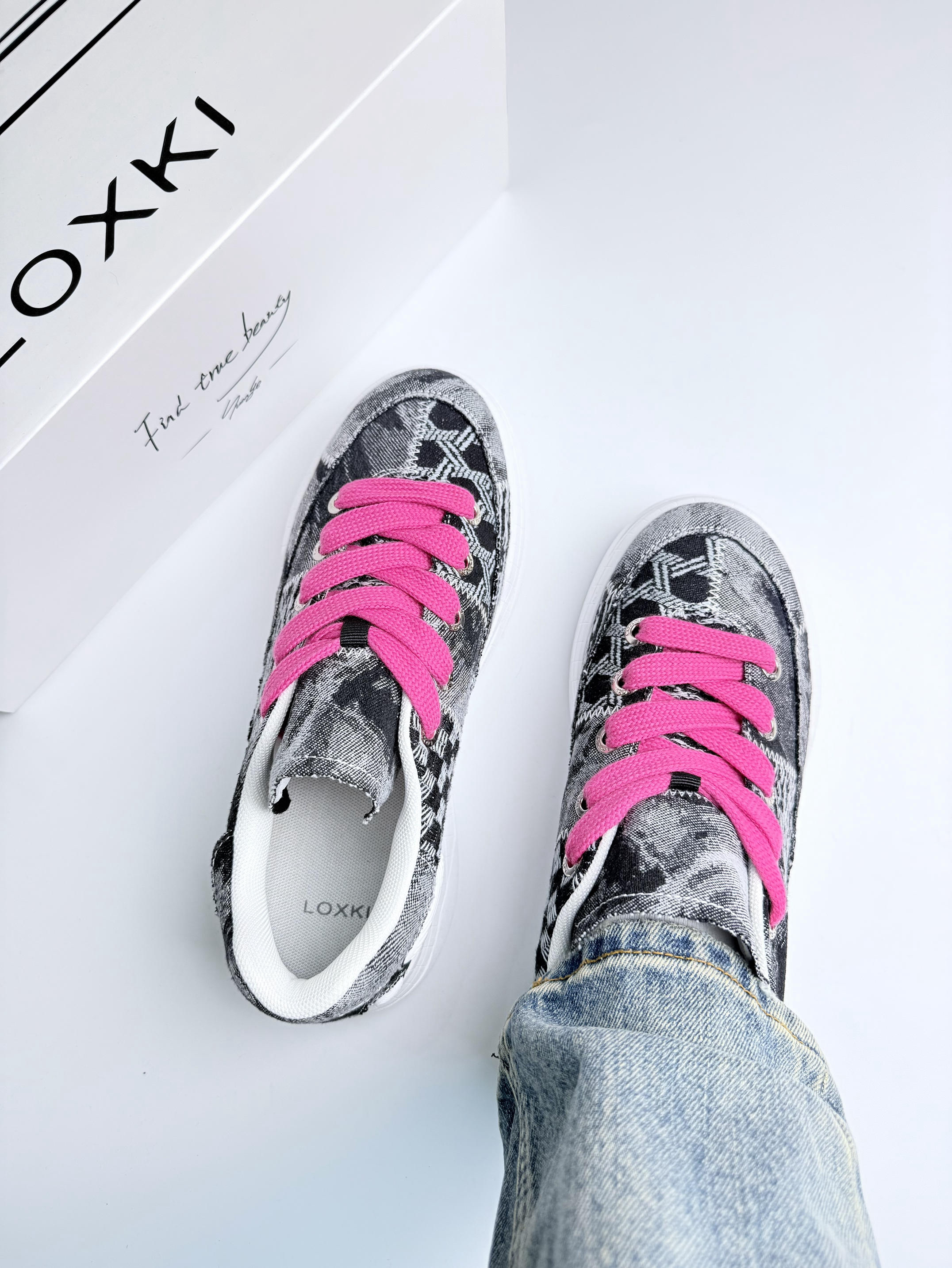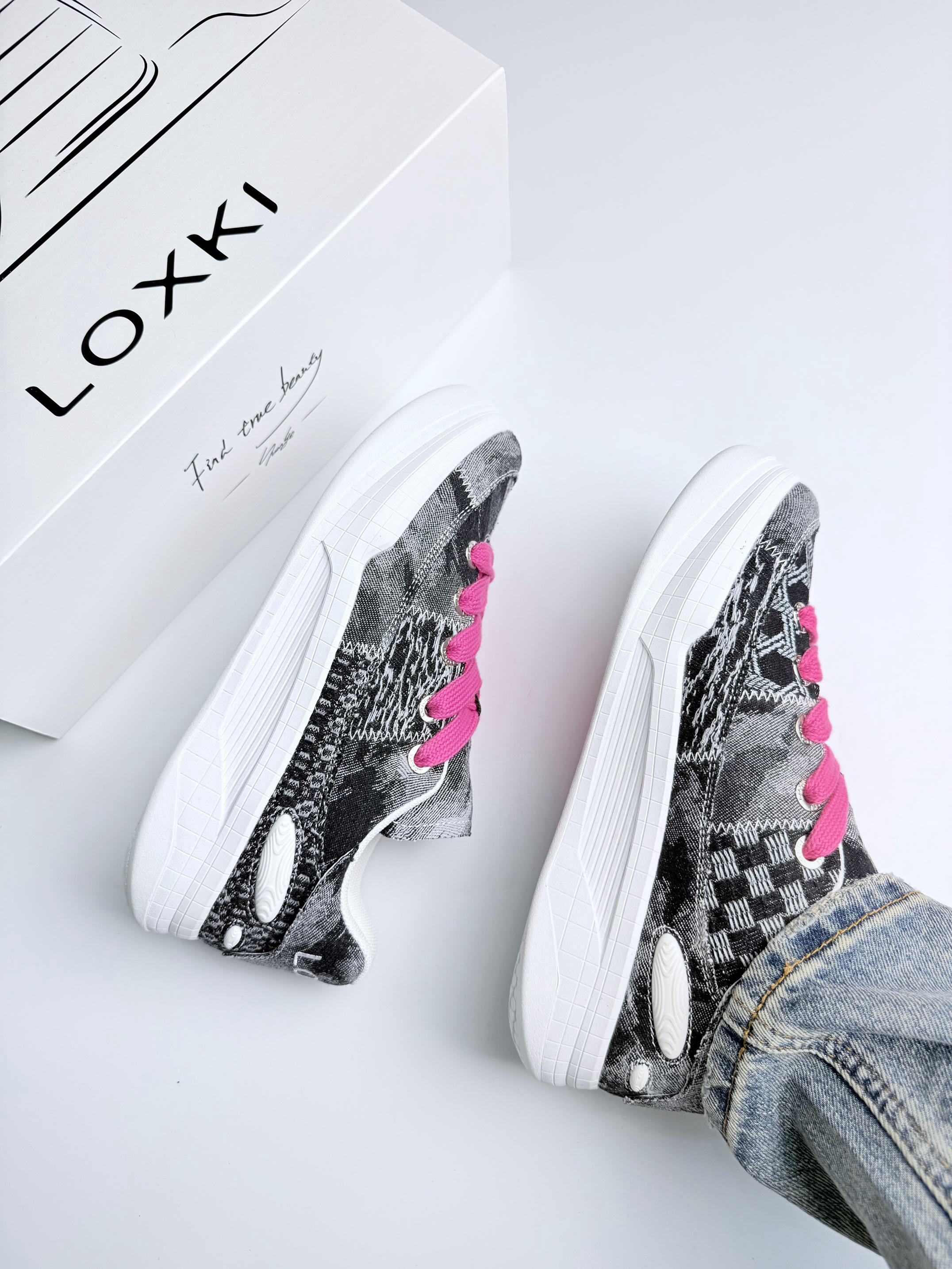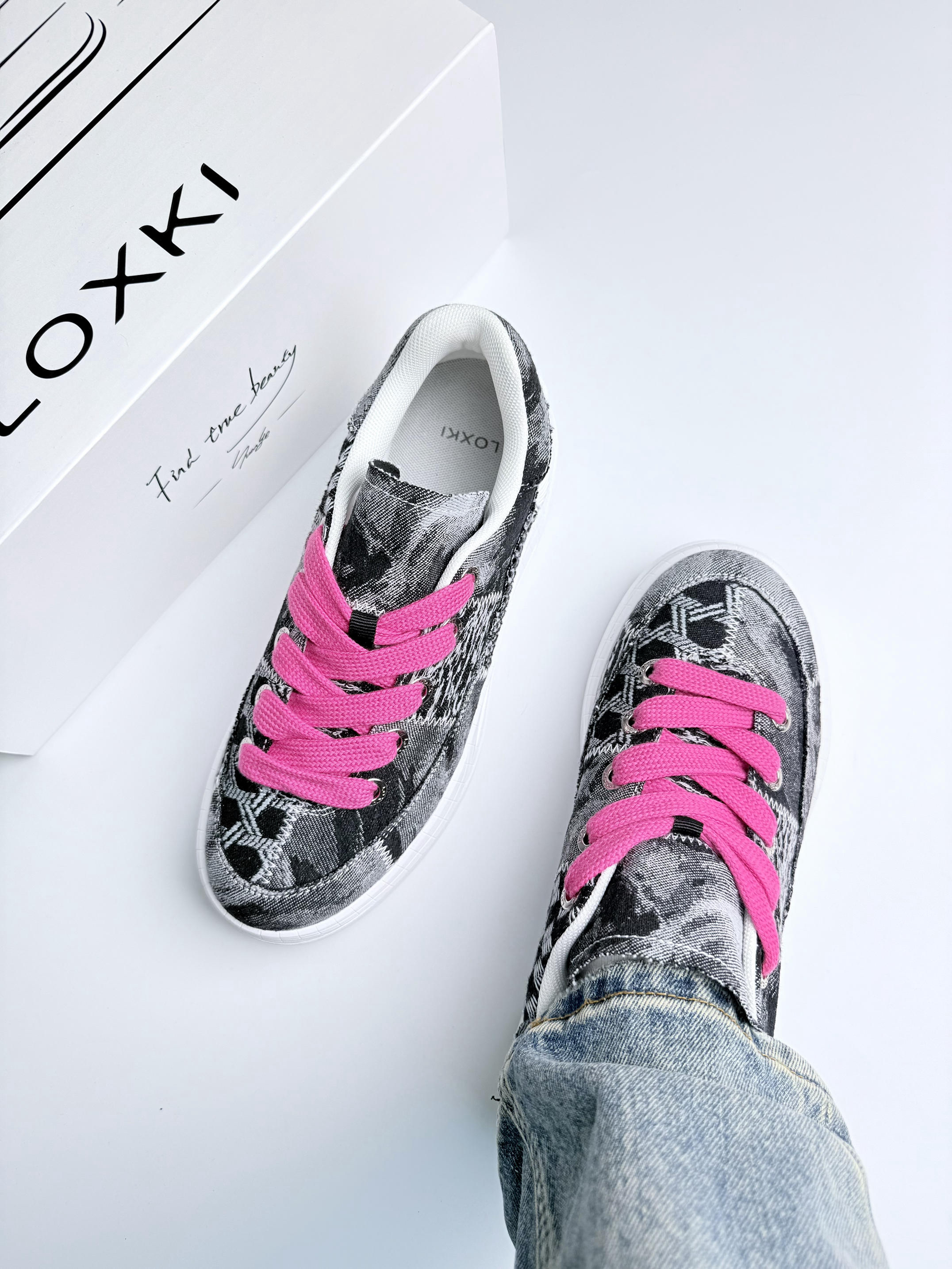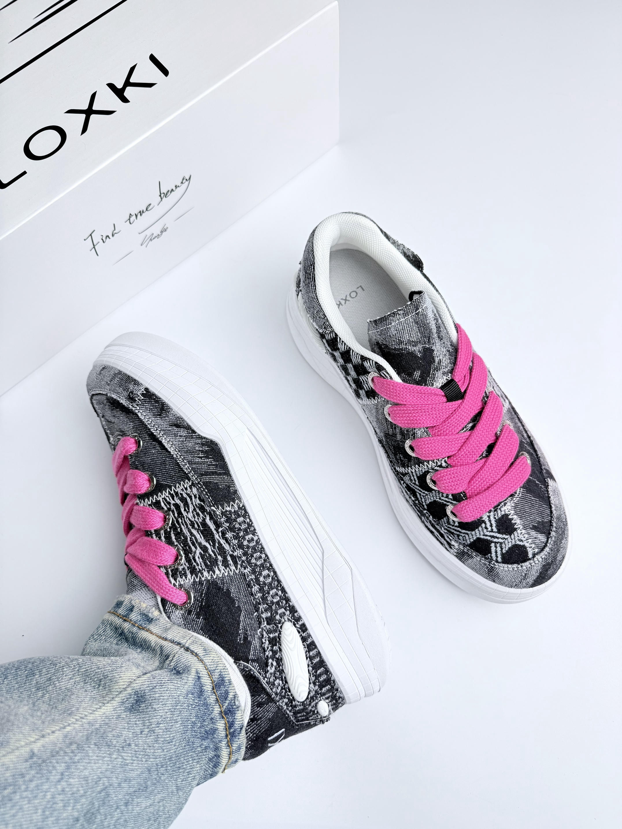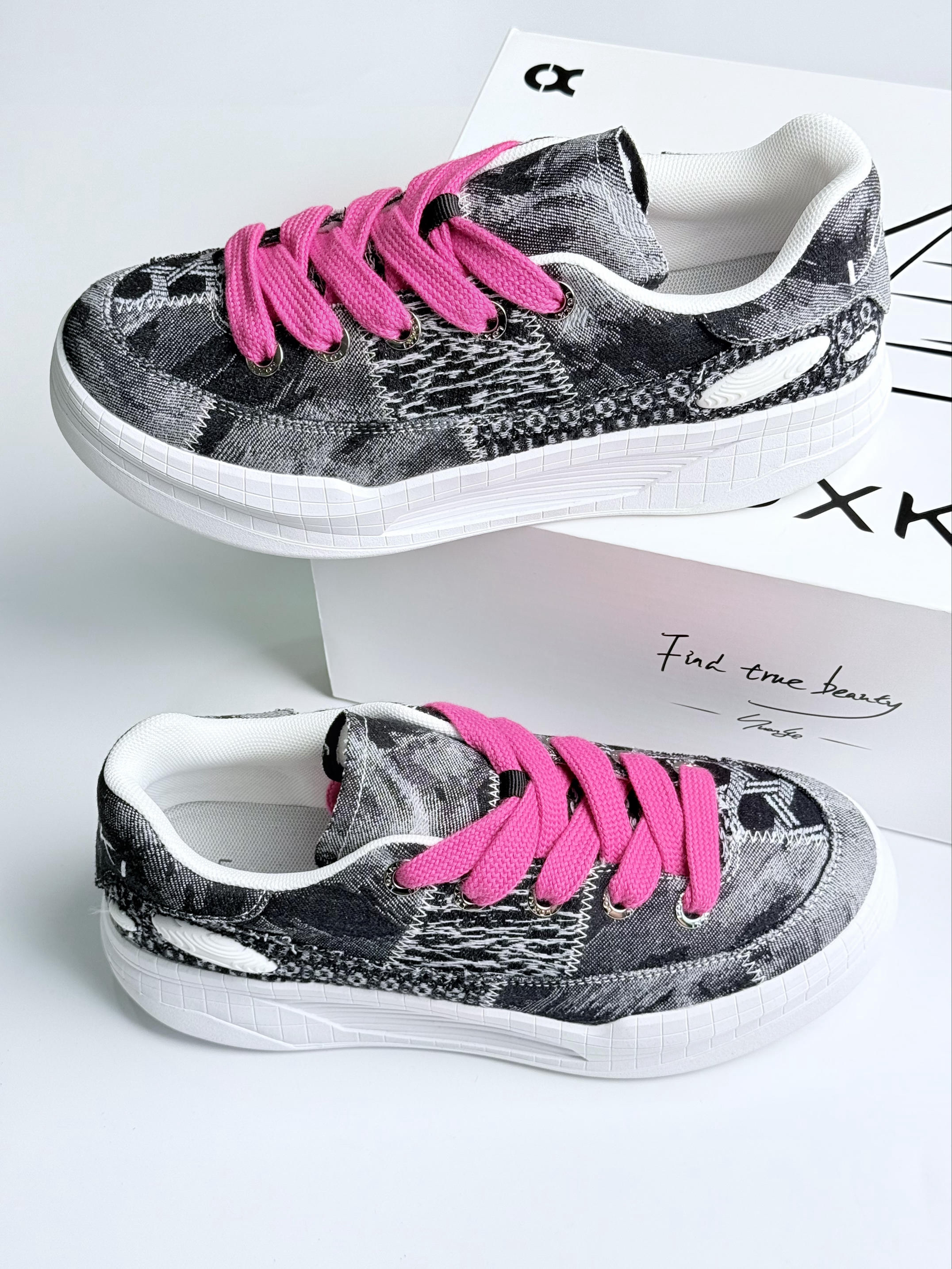 开箱直接蹬脚上!这软乎感谁懂啊😭 牛仔布乱拼接帅得毫不费力👖 3cm厚底偷偷拉腿🚶♂️暴走半条街像踩弹簧 重点夸粉鞋带!💗闷骚点睛绝了 配工装裤被追着问链接🤙