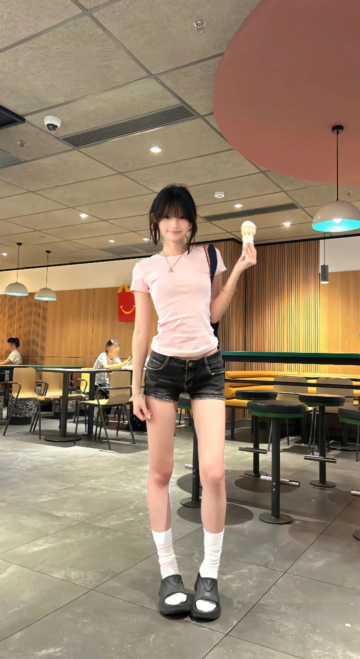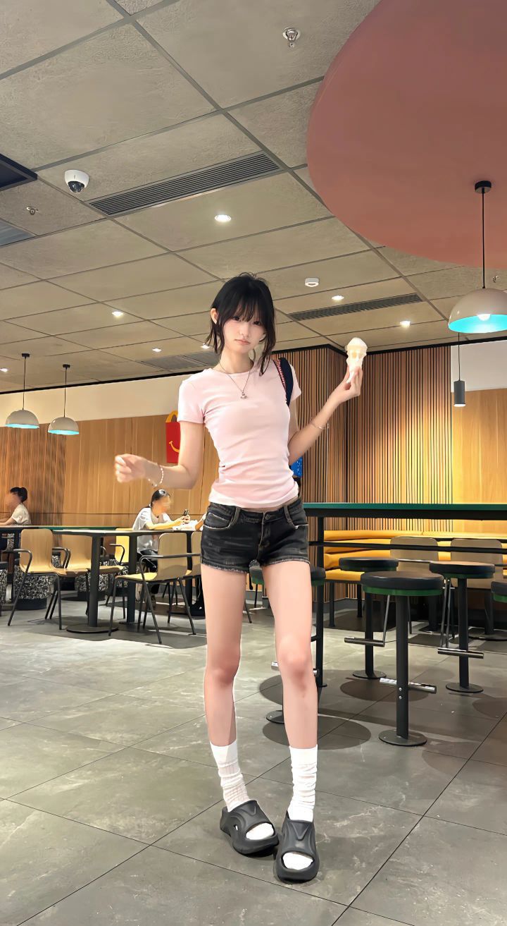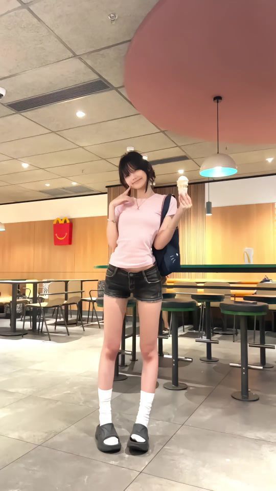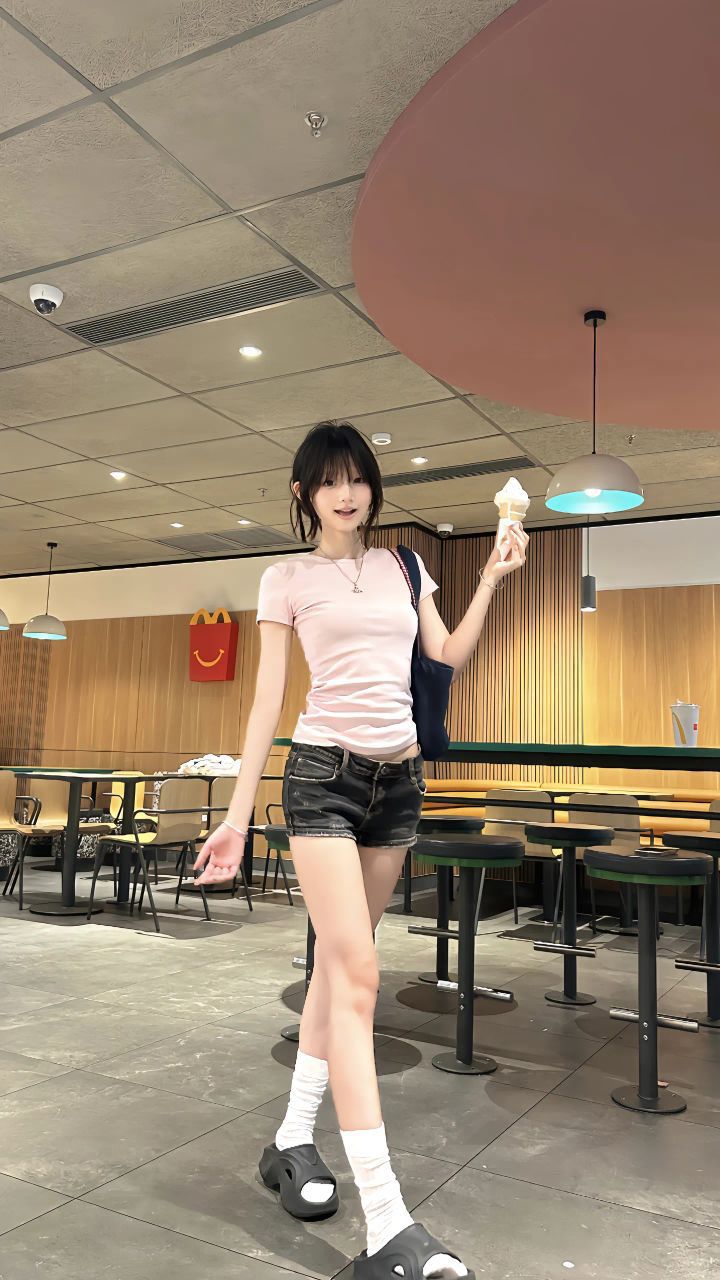 救命!在麦当劳随手拍都能这么绝🍟 浅粉紧身T+做旧牛仔短裤,把「松弛辣妹」焊在身上,冰淇淋都变成穿搭道具… 🍦 3个「松弛心机」 麦当劳秒变秀场 ✦ 浅粉T:纯欲界“作弊神器” 浅粉紧身T选微透棉质,把“纯欲”藏在若隐若现里,贴身穿显身材又不暴露,黄黑皮穿也秒变冷白皮~ 领口小刺绣和麦当劳红墙撞色,随便拍都像时尚大片! ✦ 做旧短裤:辣妹的“松弛开关” 黑色牛仔短裤选做旧磨白...