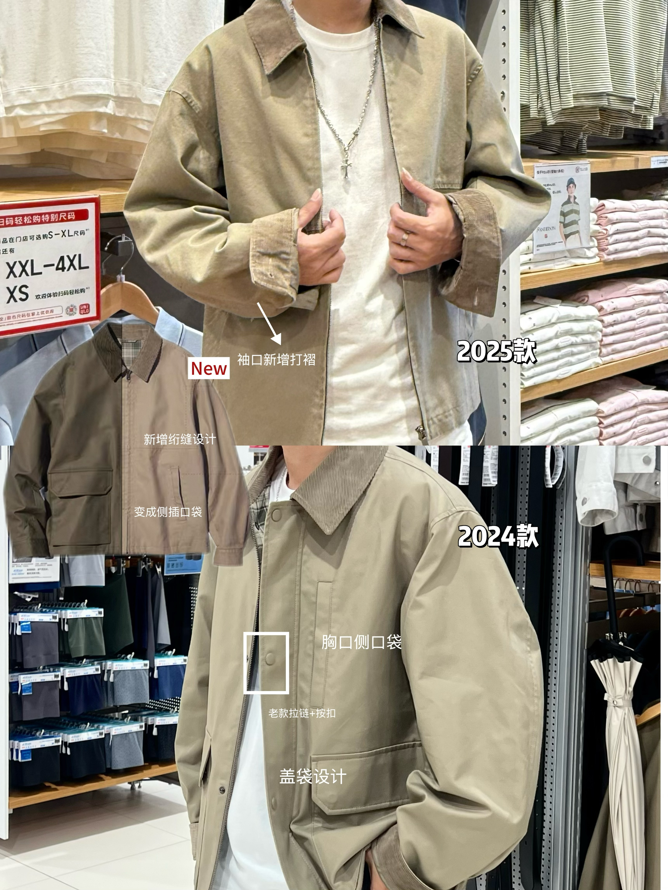 今年优衣库上新速度太快了吧!!来看Barbour风夹克热乎的上身...去年款很喜欢我是自入了的! 来浅浅对比下24款和25款👇🏻 1️⃣ 版型PK 24款:微廓版型 小个子穿也显松弛! (自入后发现十分易皱) 25款: 对比24款 也是微廓但更修身更利落一些 2️⃣ 细节对比 24款:口袋:大容量盖袋+按扣拉链 复古能装 25款:口袋:侧插袋!拿东西顺手一些 袖口:新增打褶 整体新增绗缝 ...